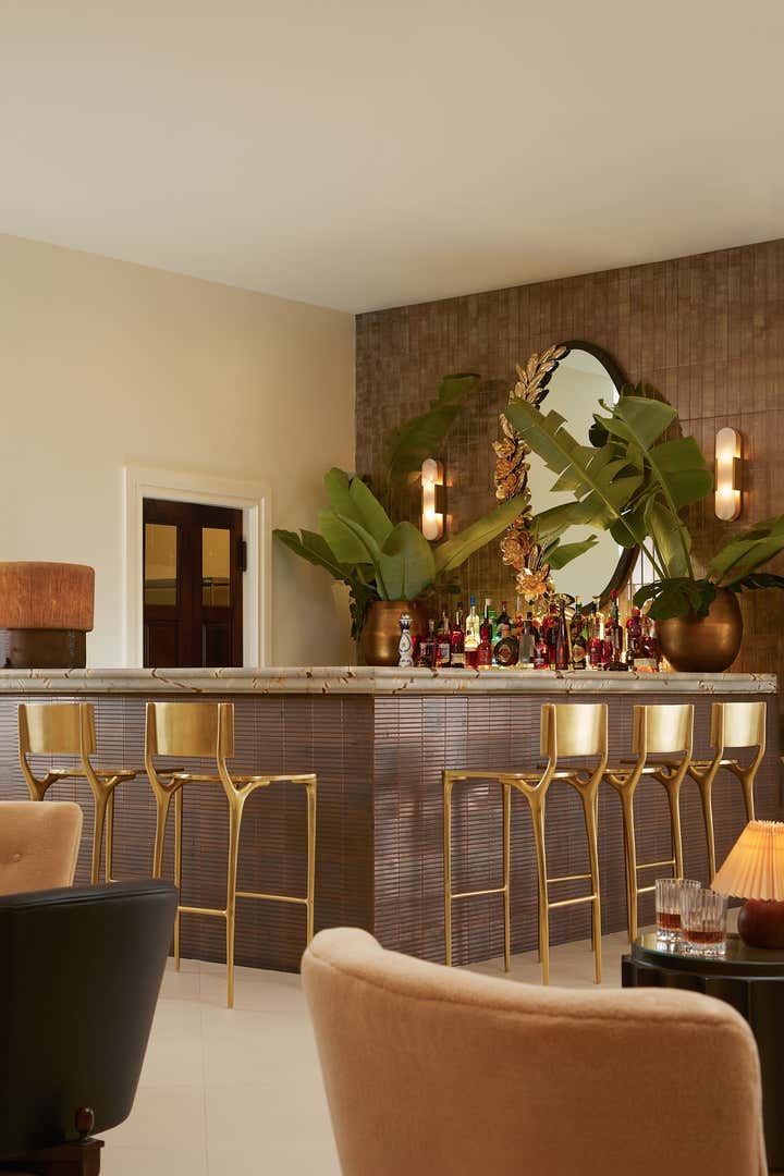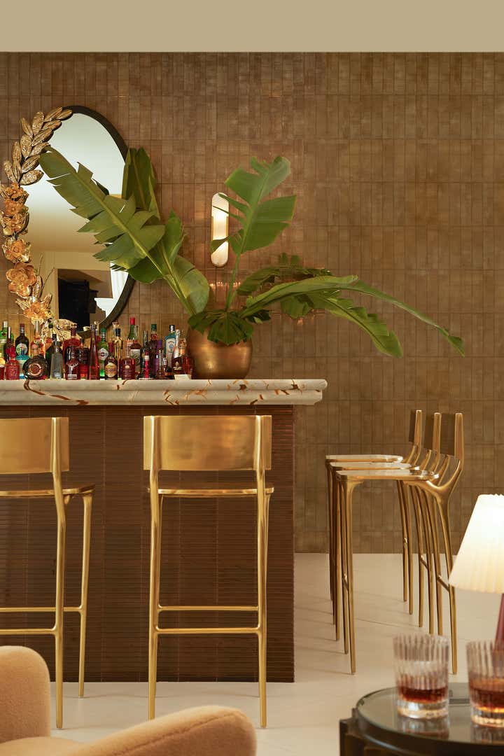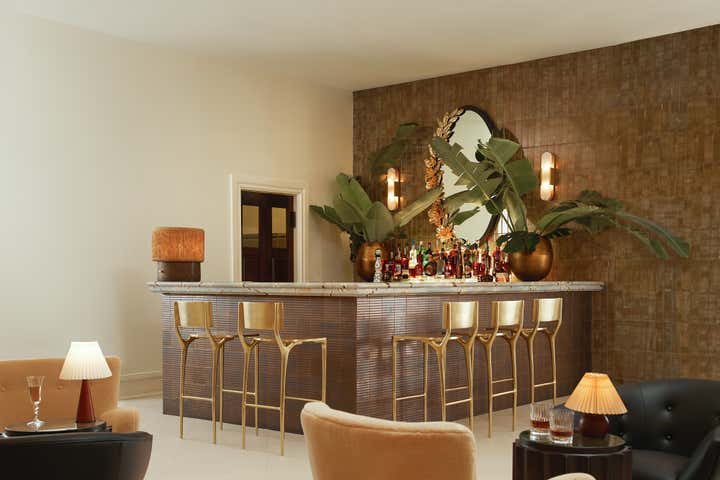 The expansive interior is thoughtfully arranged into cozy seating alcoves, blending vintage and contemporary pieces from diverse eras and cultures, creating a uniquely residential ambiance. Handcrafted ceramic tiles, gleaming brass and crystal light fixtures, and artisanal materials seamlessly harmonize, weaving a rich narrative of Spain s storied heritage.