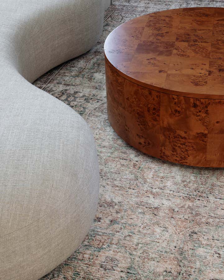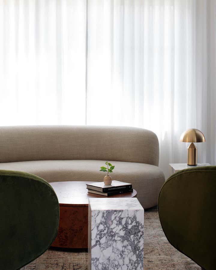 The material palette emphasizes natural elements—walnut, linen, wool, stone—to soften the home s crisp lines and create tactile richness.