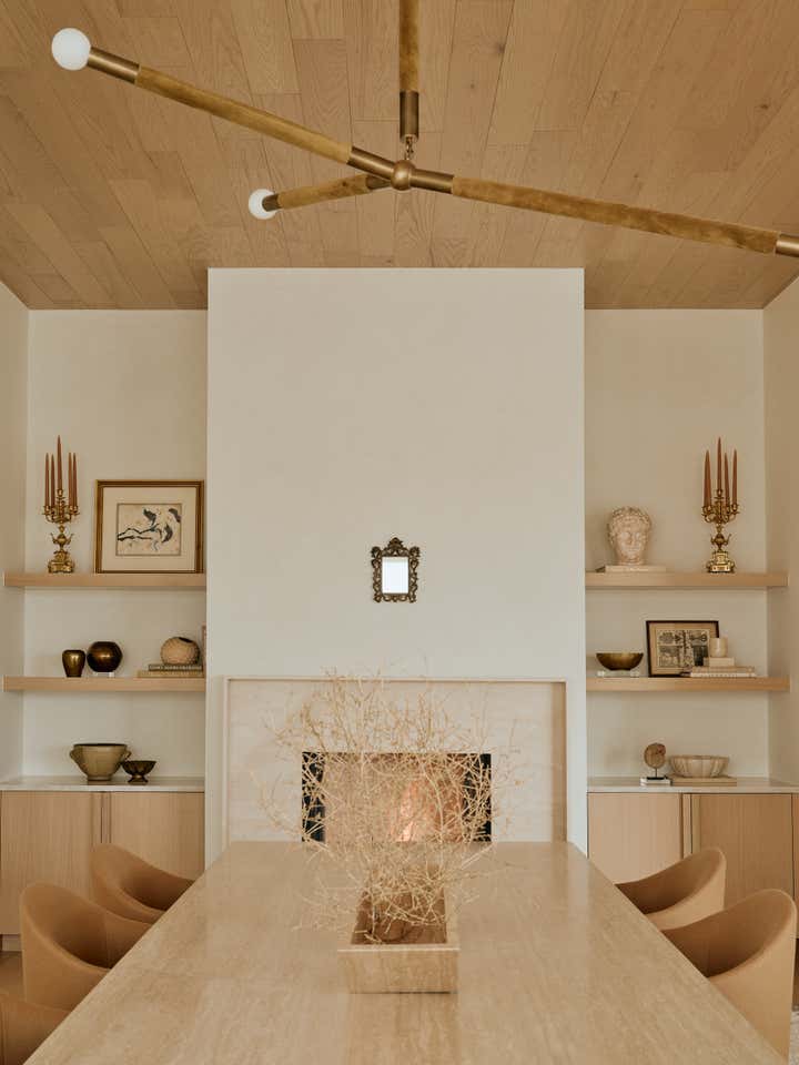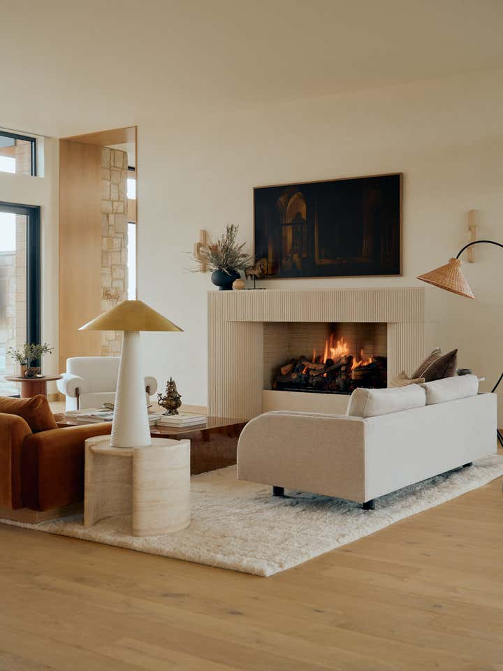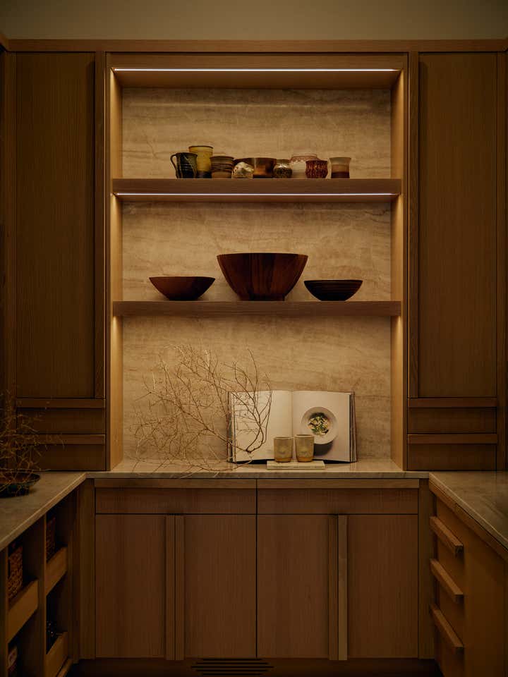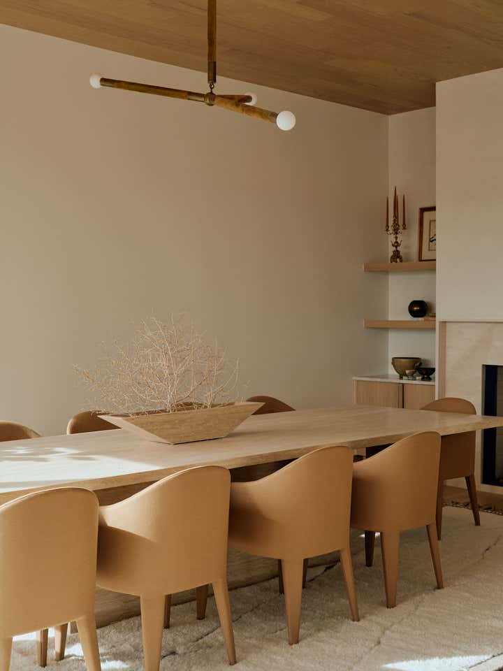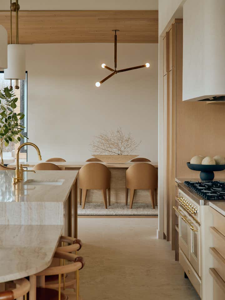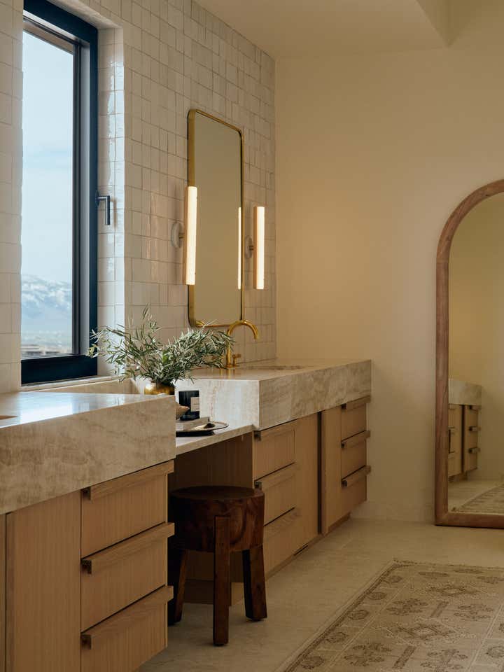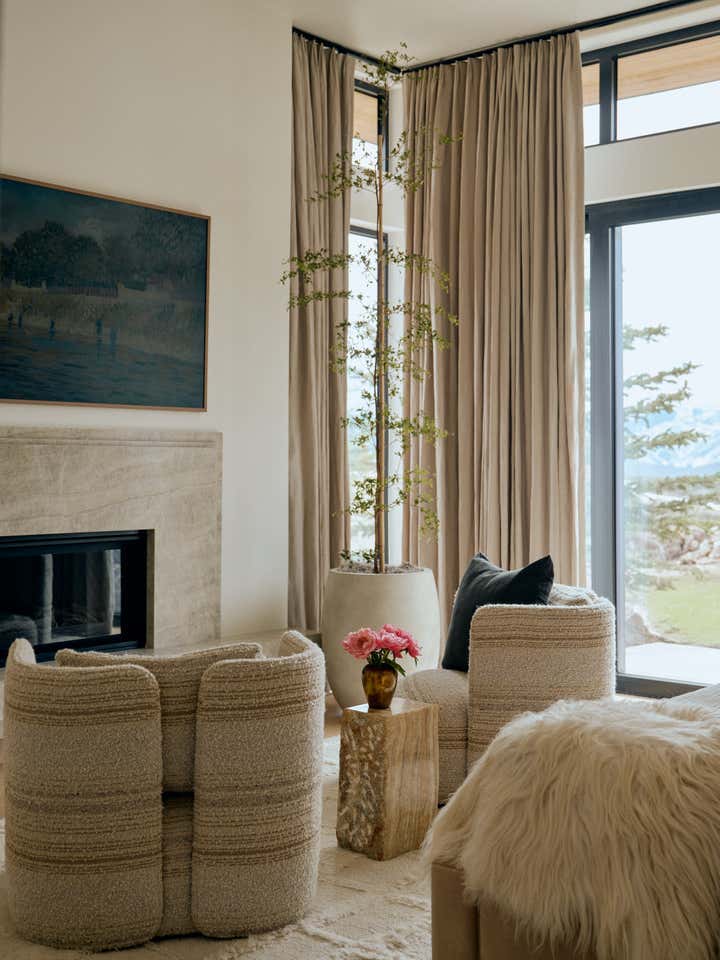 The studio collaborated with long-time clients on this ground-up new build in Park City, Utah. The family of five wanted to create a soulful home that was at once elegant and supremely comfortable. Carefully selected natural stone slabs, artisanal tile, white oak, and hand-troweled plaster served as the backdrop for the home’s considered mix of furnishings and artful lighting. Custom millwork and monumental furnishing pieces designed by the studio, including a plush family room sectional, a solid travertine dining table, and a stone and wood console created a bespoke feel while emphasizing function. Plush rugs and sculptural upholstered pieces in mohair, boucle, and shearling sit alongside beloved family pieces; vintage objects and furnishings; and a thoughtful collection of art and accessories.