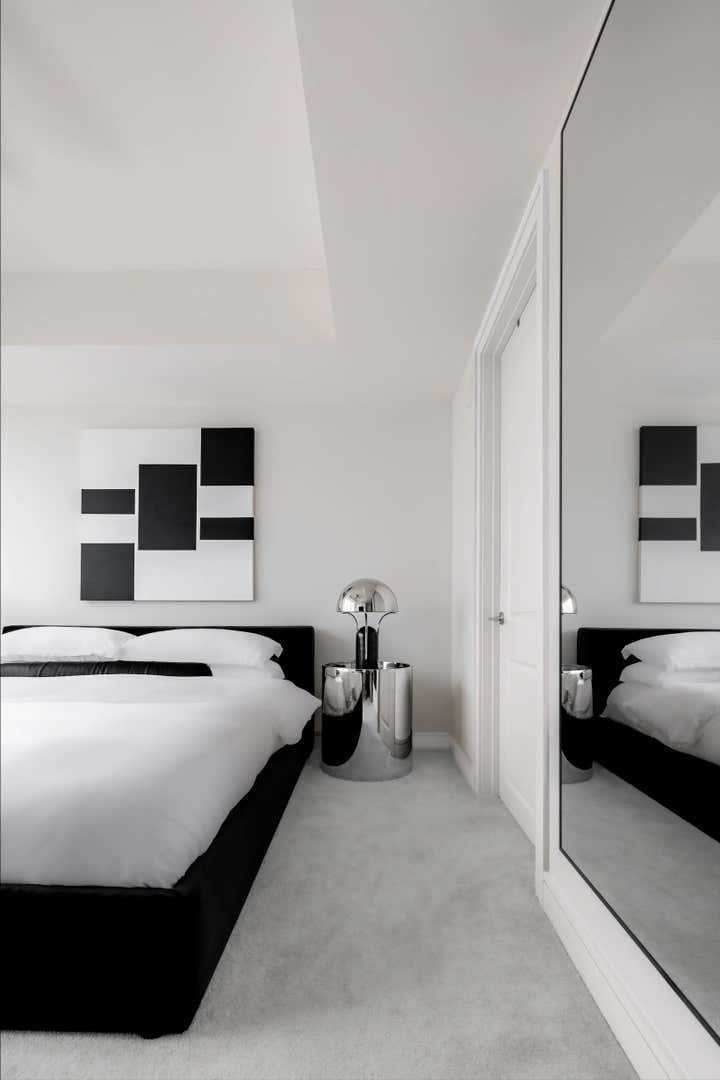 Rehman curated the primary suite to evoke the opulent ambiance of a top-tier hotel. Adorning the walls is a painting crafted by Rehman during his high-school days, adding a personal touch to the space. The room is furnished with a luxurious black-velvet bed and vintage chrome nightstands, meticulously designed by Jonathan Adler.