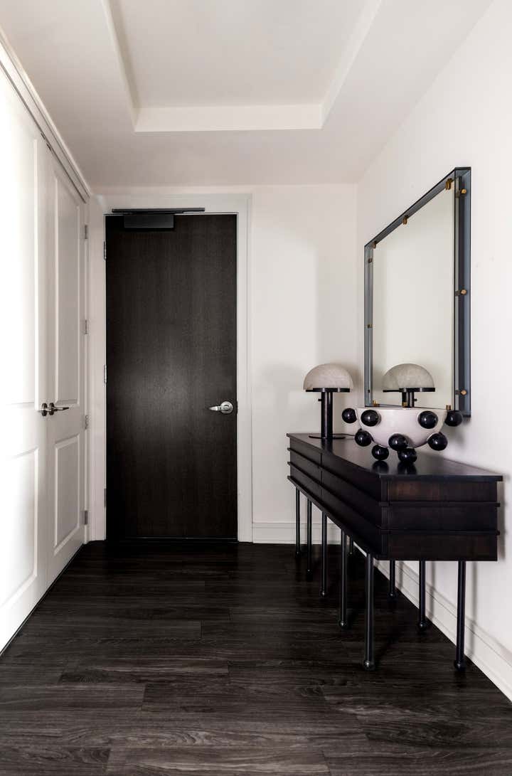 No detail in this residence was overlooked, the small corridor between the guest suite and powder bathroom is dressed with a vintage Interlude fluted console table, italian white ceramics and a smoked mirror.