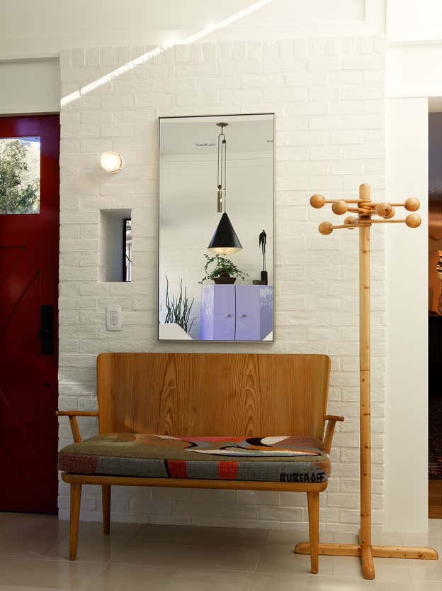 A rambling fifties ranch house within a canyon setting was extensively remodeled in the nineteen eighties, with unfortunate results. In lieu of restoration, which seemed implausible, we opted to keep the Beverly Hills ‘ranch’ vernacular but translate it through modernism. We looked to Eero Saarinen’s 1957 Miller House for cues on incorporating modern details – framing, casework and material combinations – within a postmodern ranch vocabulary. The new interior is highly detailed and precise, with a complex system of posts, beams and brickwork, all painted in many subtle shades and finishes of white, from dead-flat to high-gloss lacquer.