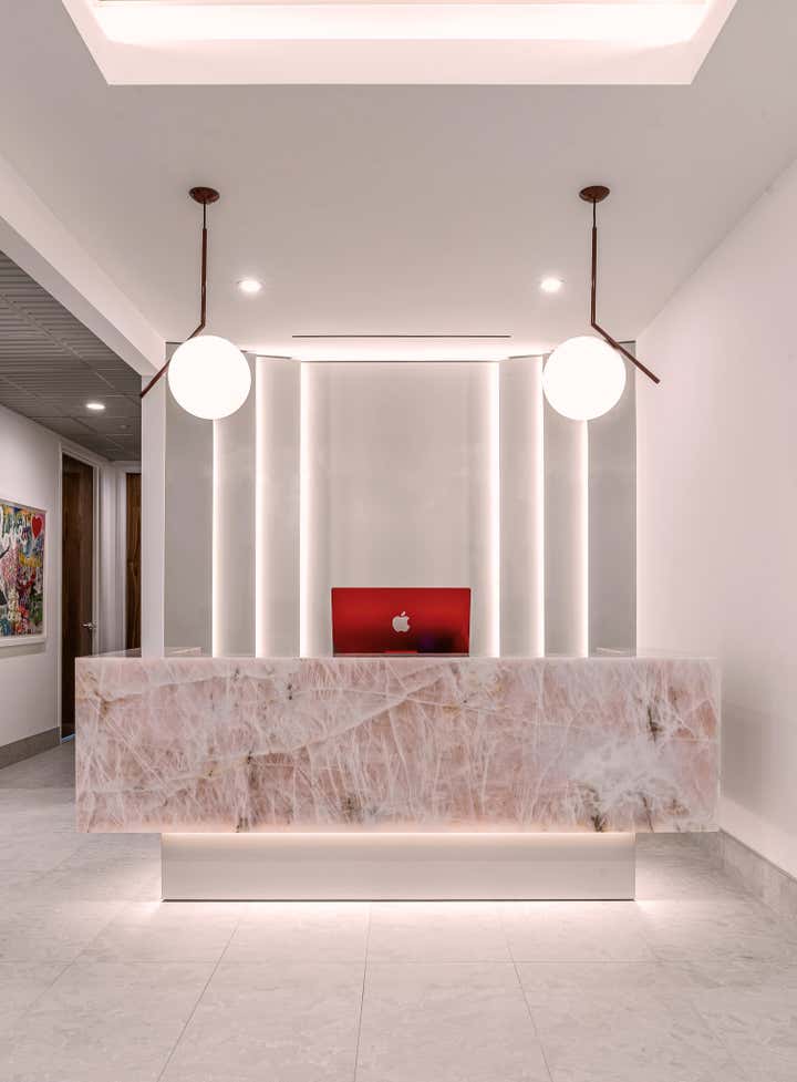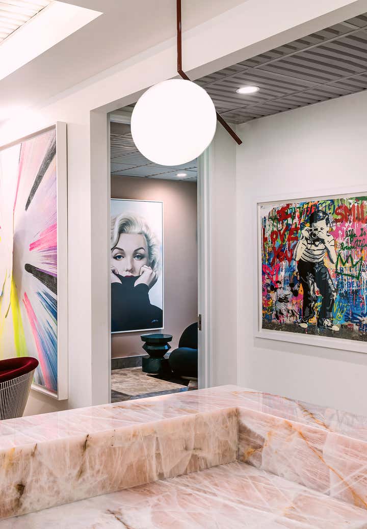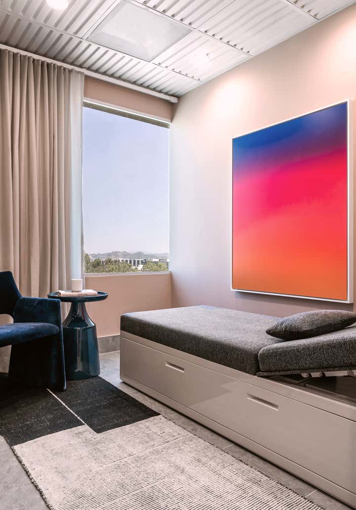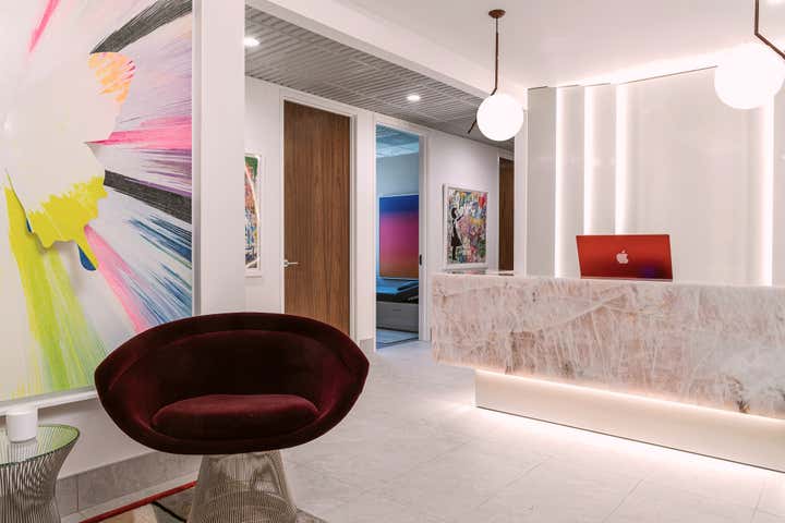 Clean, modern lines are complemented by comfortable, ergonomic furnishings, while natural light and thoughtfully placed artwork enhance the space’s positive atmosphere. High-end finishes and luxurious textures add a sense of refinement, aligning with the upscale Beverly Hills location.