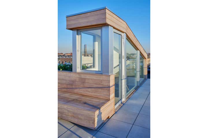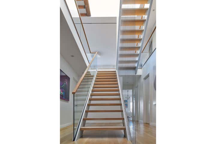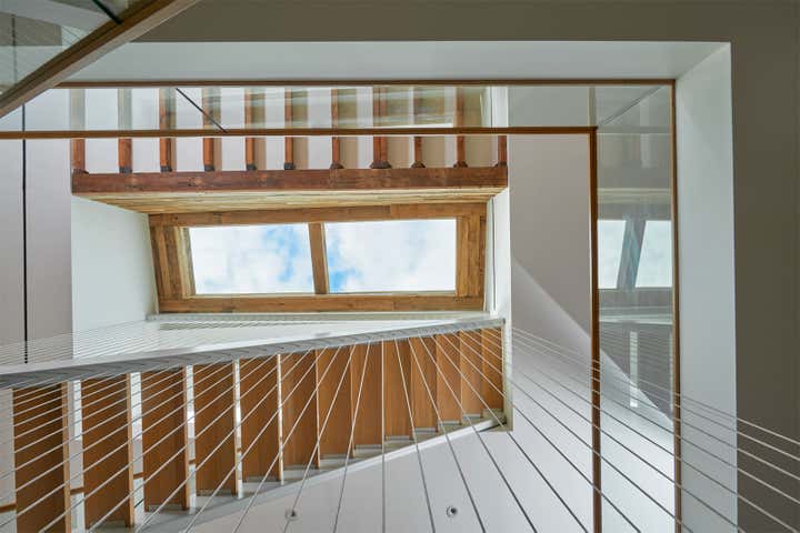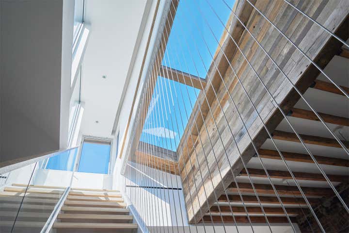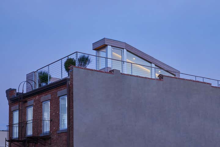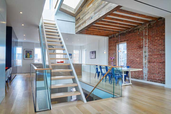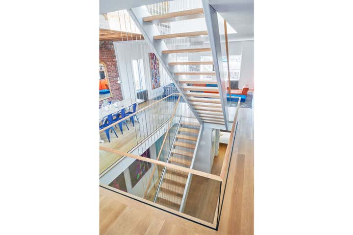 A dramatic three-story light well with floating stairs connects the living space with the new light beacon on the rooftop. Cable rail extends up three stories to the skylights above. A new roof deck shows off dramatic views of New York Harbor and the Statue of Liberty. This colorful duplex features custom orange and blue lacquer cabinets and Flavor Paper wallpaper throughout. Reclaimed wood and exposed brick walls utilize existing building materials. Juxtaposed with contemporary steel and glass stairwell, this home is a wonderful mixture of old and new.