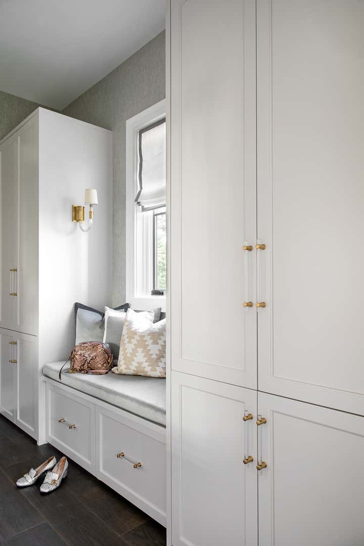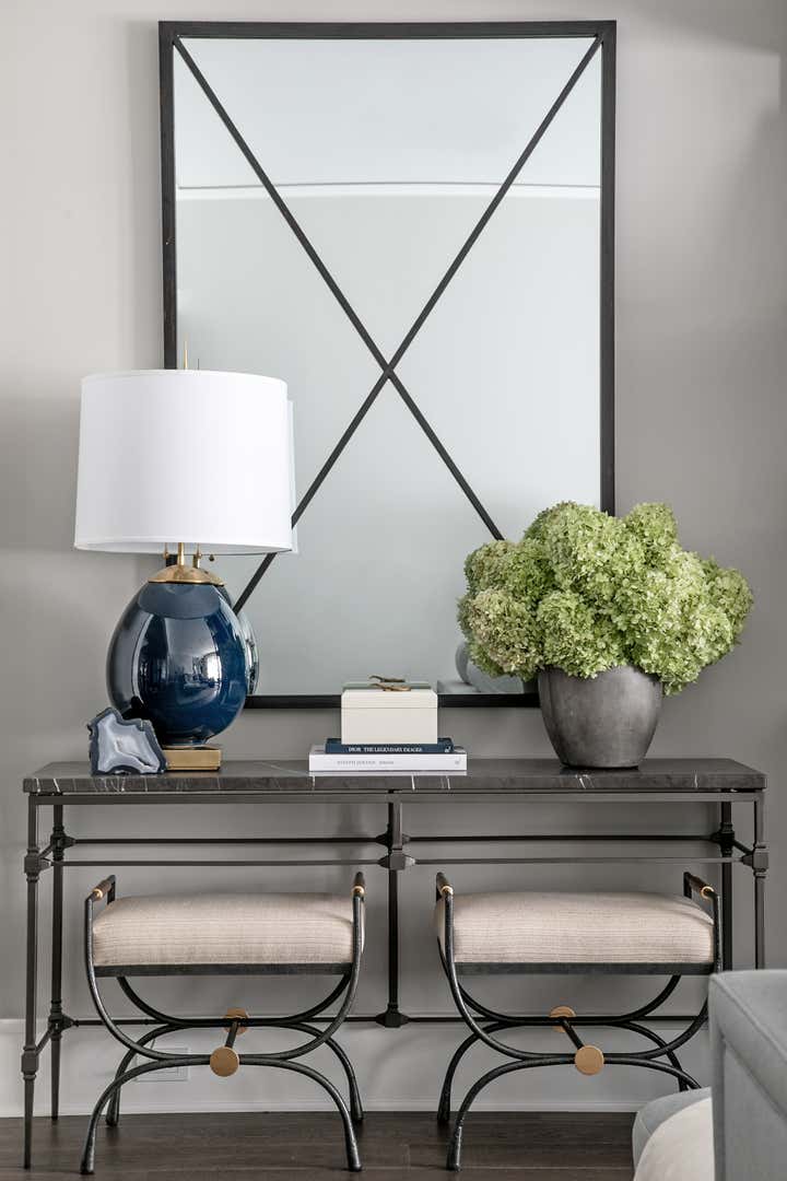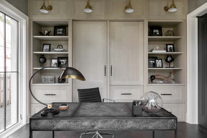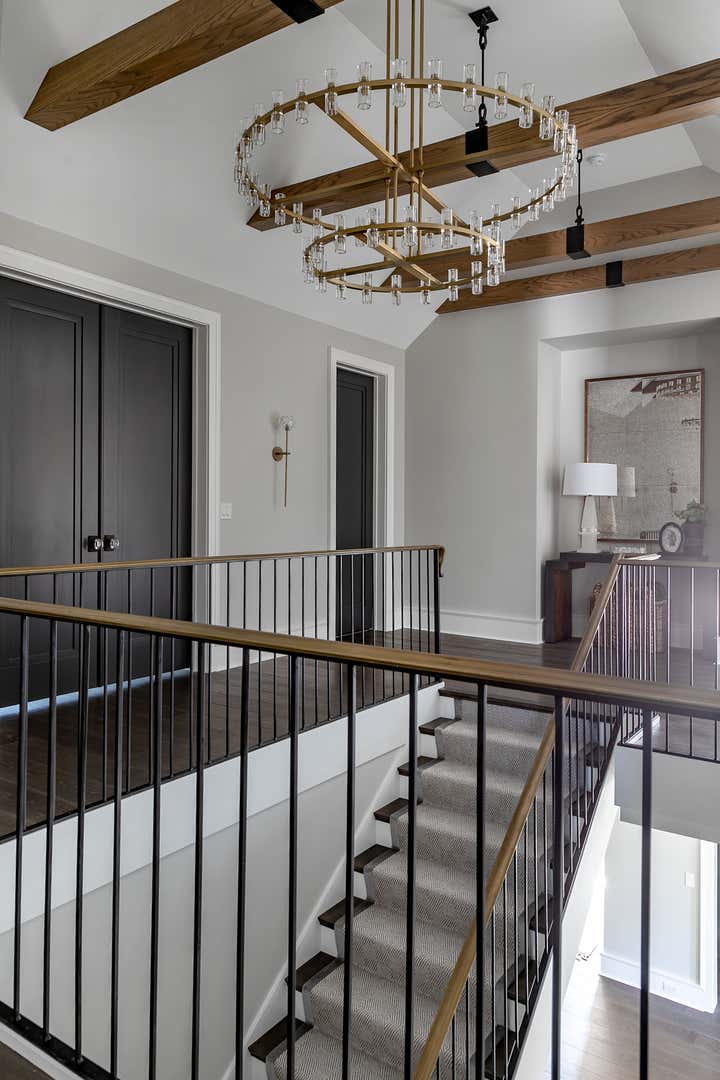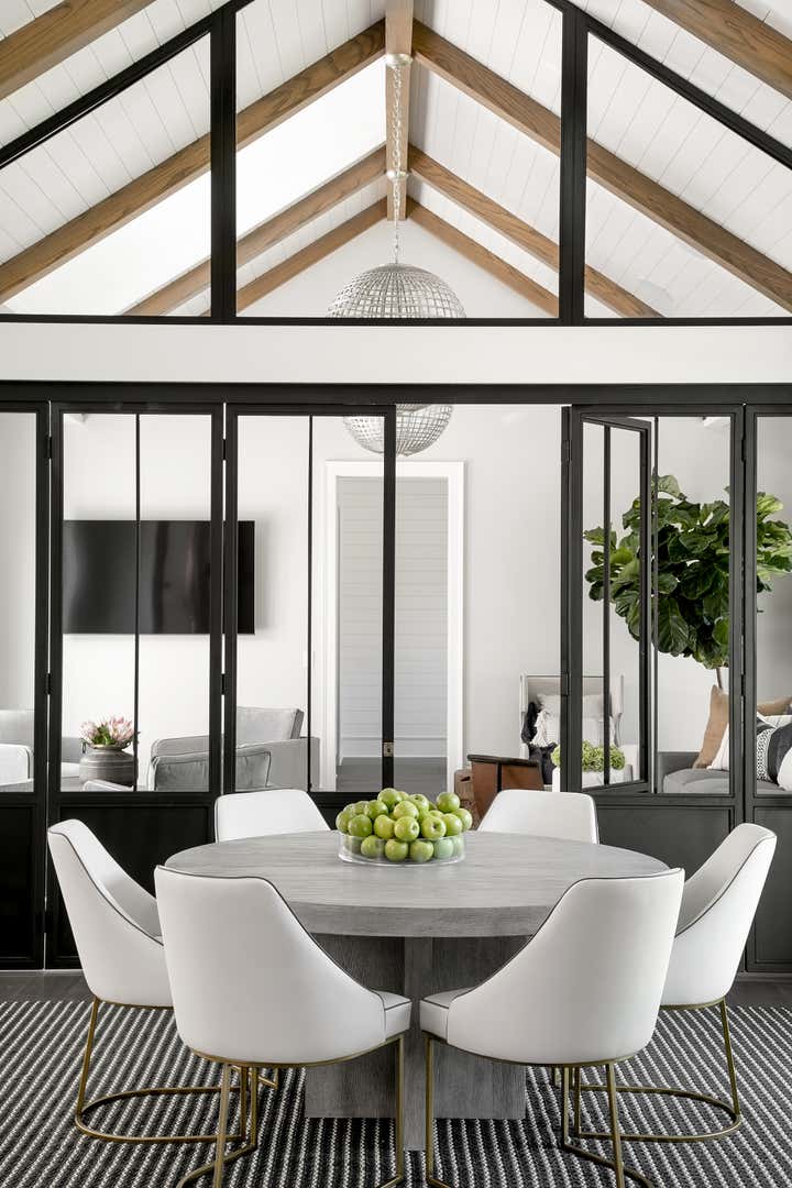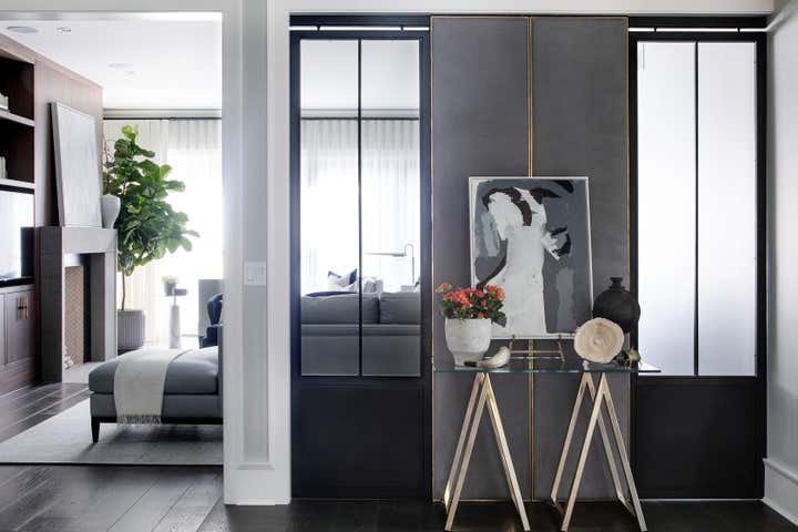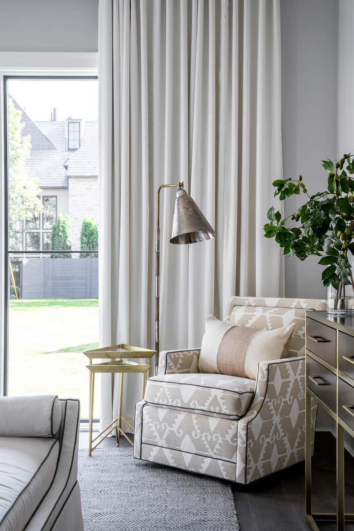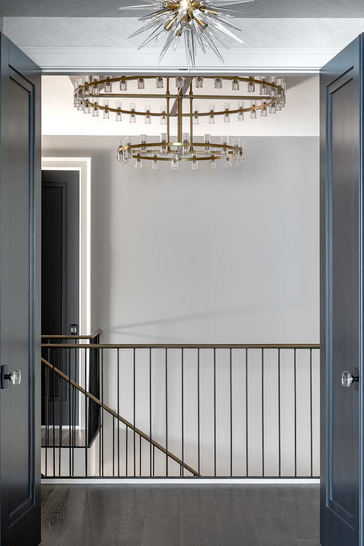 For this Napa Valley-inspired home, our clients asked that we create a space that felt vastly different from their previous French Provincial home. Vaulted ceilings, contemporary fixtures, and steel-and-glass doors set the stage for furnishings and details that feel both sophisticated and welcoming. Details—gray suede and brass on partitions and walnut and brass in the kitchen, for example—add a luxurious element.
