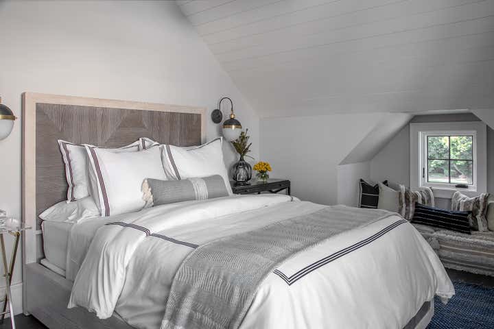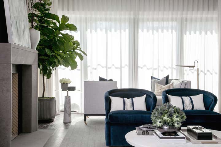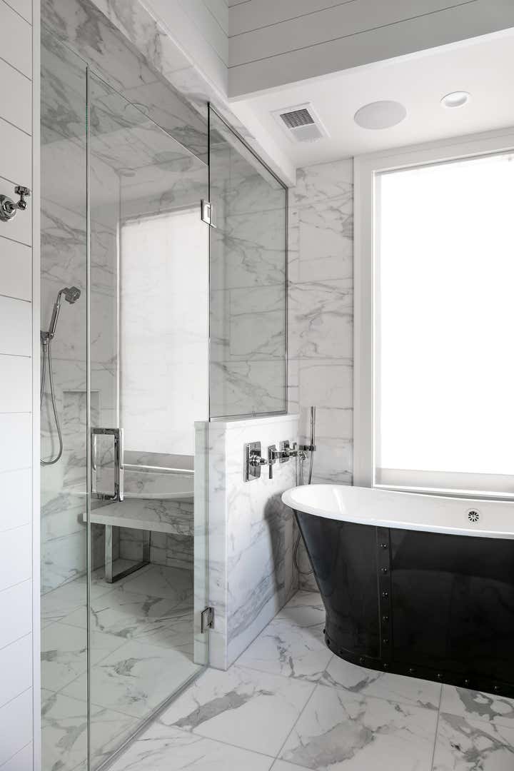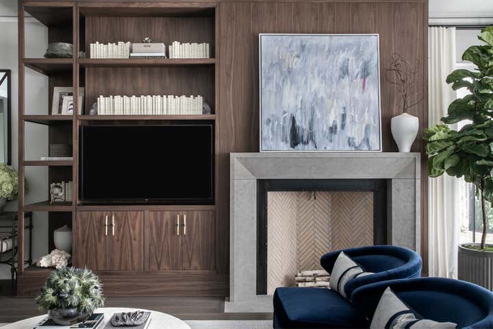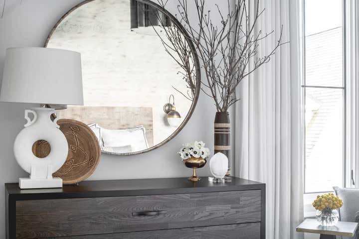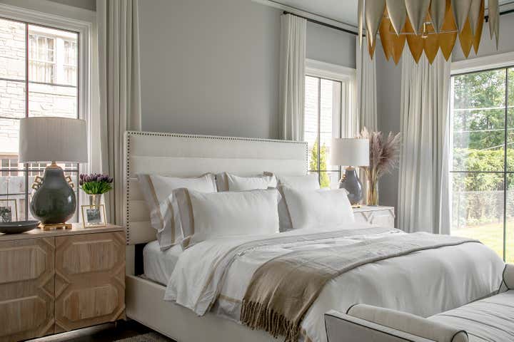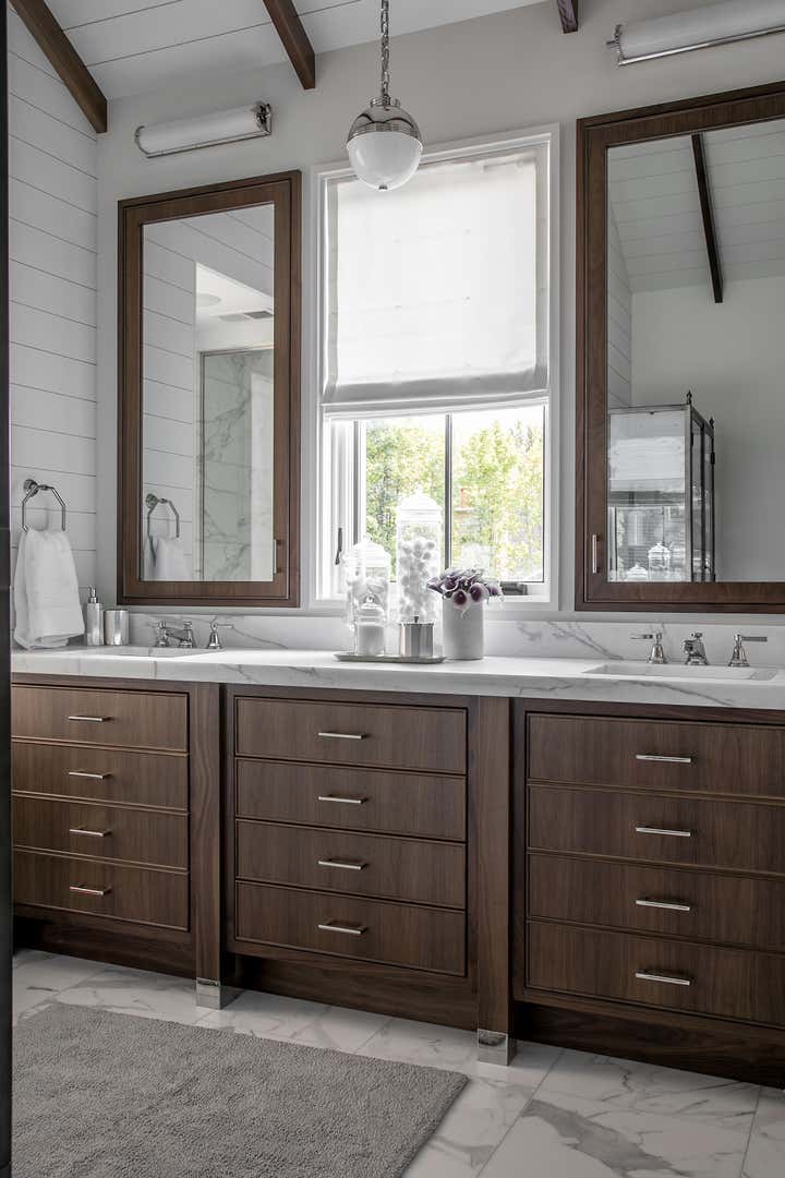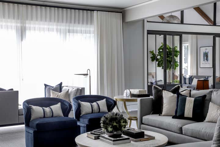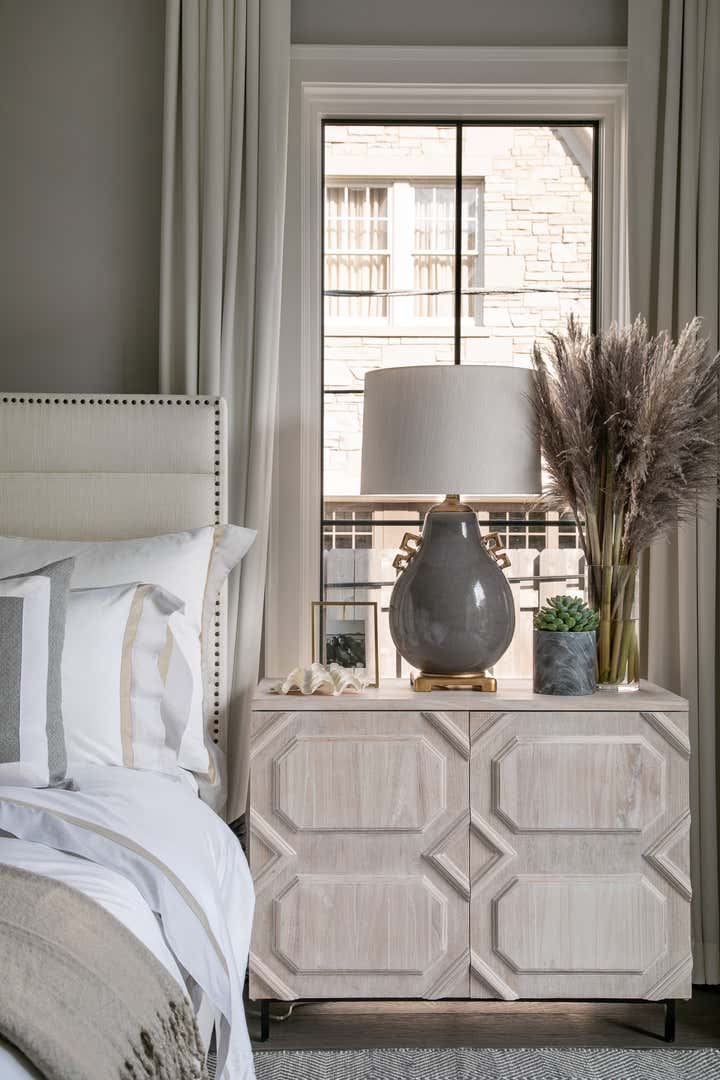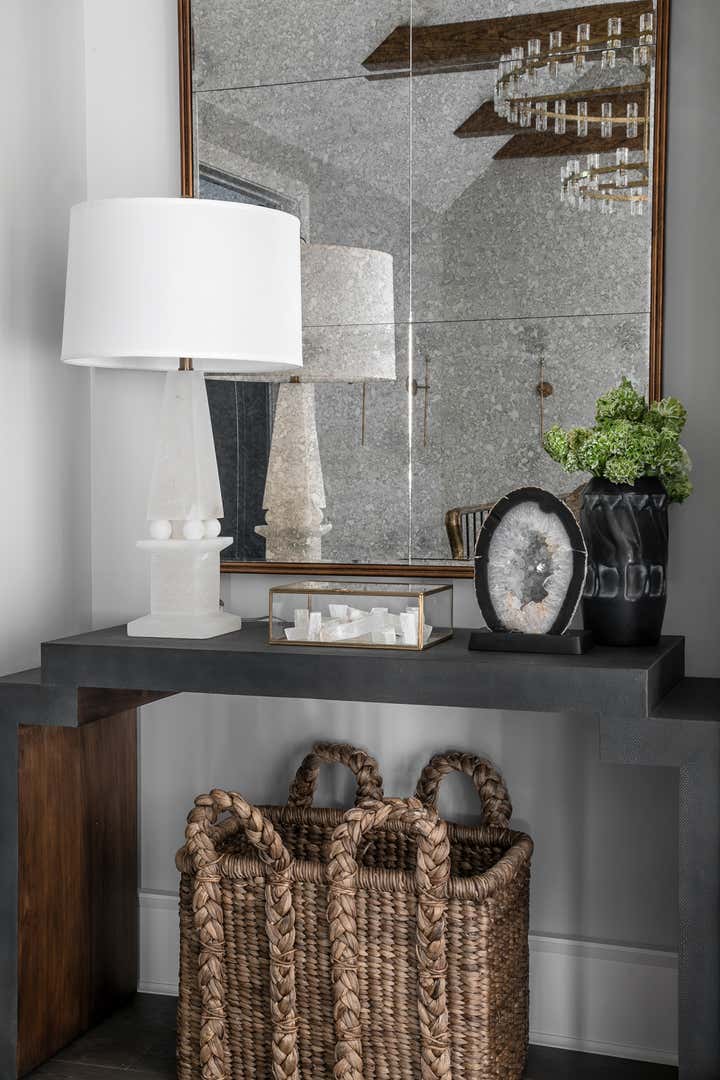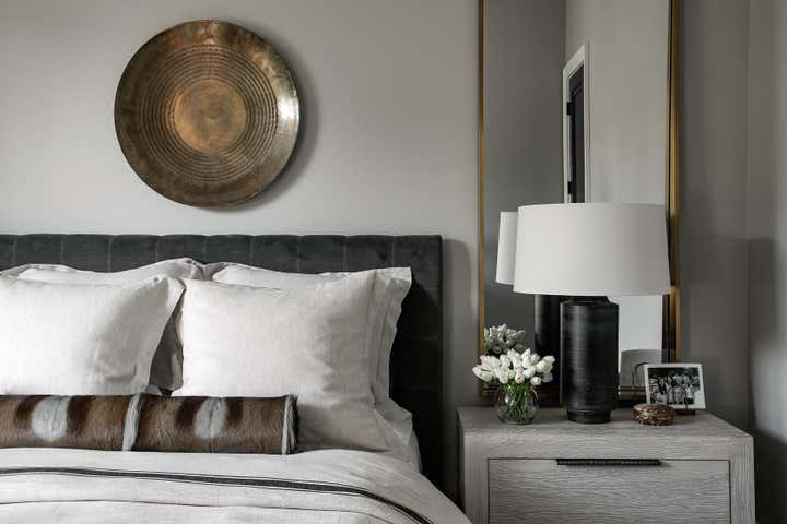 For this Napa Valley-inspired home, our clients asked that we create a space that felt vastly different from their previous French Provincial home. Vaulted ceilings, contemporary fixtures, and steel-and-glass doors set the stage for furnishings and details that feel both sophisticated and welcoming. Details—gray suede and brass on partitions and walnut and brass in the kitchen, for example—add a luxurious element.