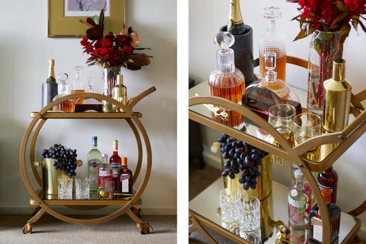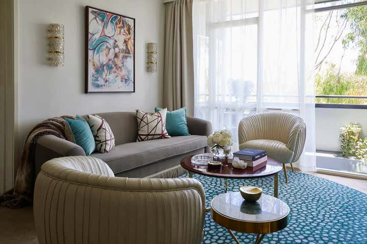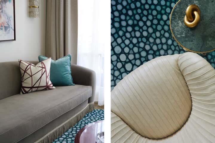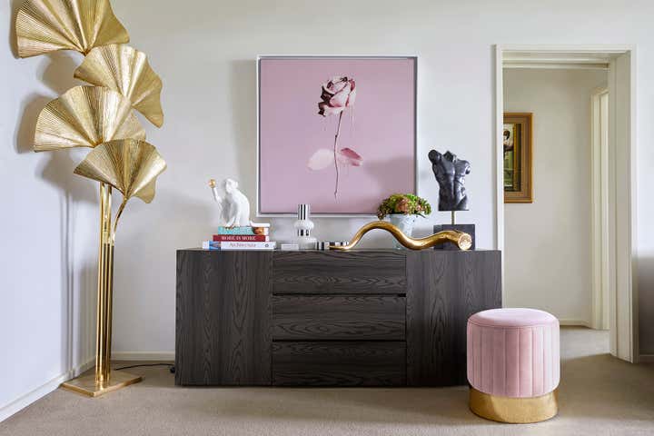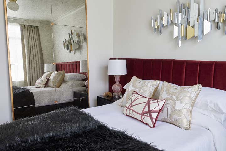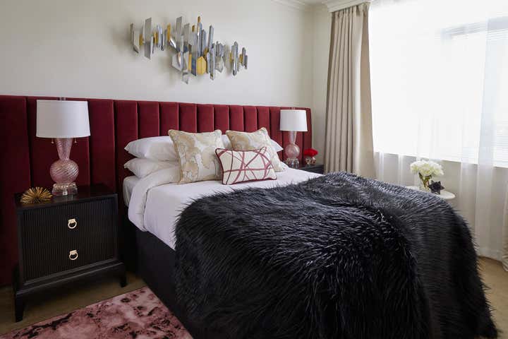 A calming neutral wall colour was used throughout as a base to layer over, and prevent the rooms from feeling too overbearing. The neutral works wonders alongside the deep burgundy and teal accent colours paired with creams and soft pinks. Patterned rugs and scatter cushions were used to subtly introduce different design eras and geometric shapes, vintage lighting and unique artwork created aesthetic intrigue.