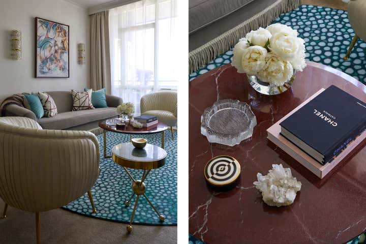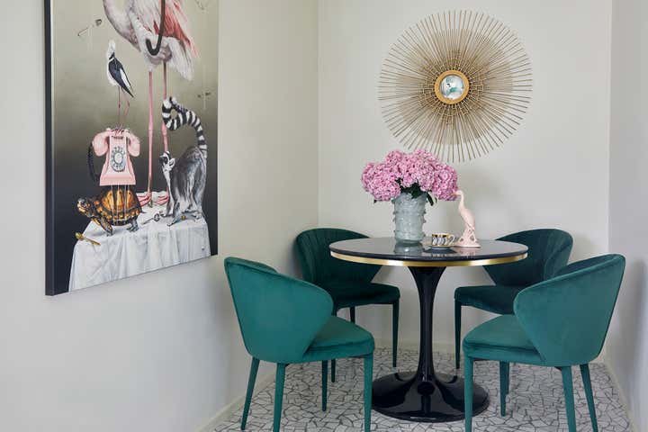 The vibrant visual of seemingly opposing patterns add fun and surprise to a space; keeping a light-hearted atmosphere. A key element to this style is contrast, and with the use of different textures like marble, smooth leather, and steel against fluffy throws, Massimo created a wonderfully creatively curated space.