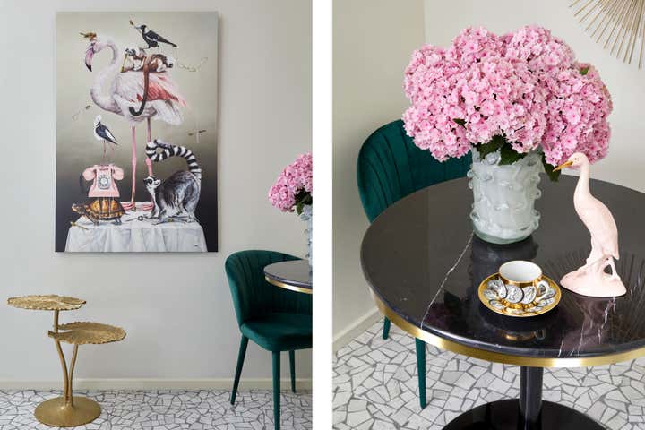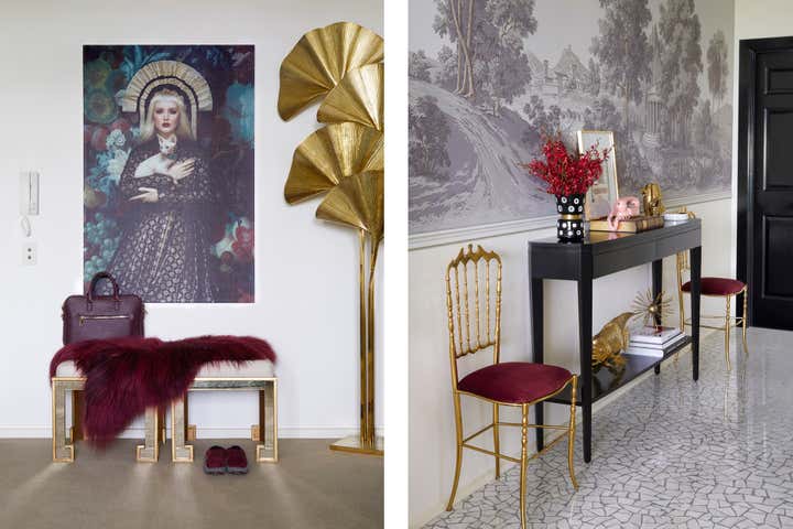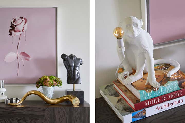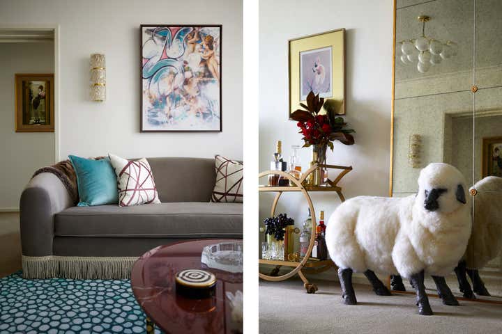 To achieve the look of a curated eclectic space, Massimo focused on rooms that married old and new, antique and contemporary, serious and fanciful. For example, a streamline contemporary mirror paired with a vintage sheep sculpture, to highlight - through contrast - the independent beauty of each piece. Eclectic decorating also appeals to Massimo because, as a designer, it provides him a dynamic canvas to express his imagination and whimsical addition.