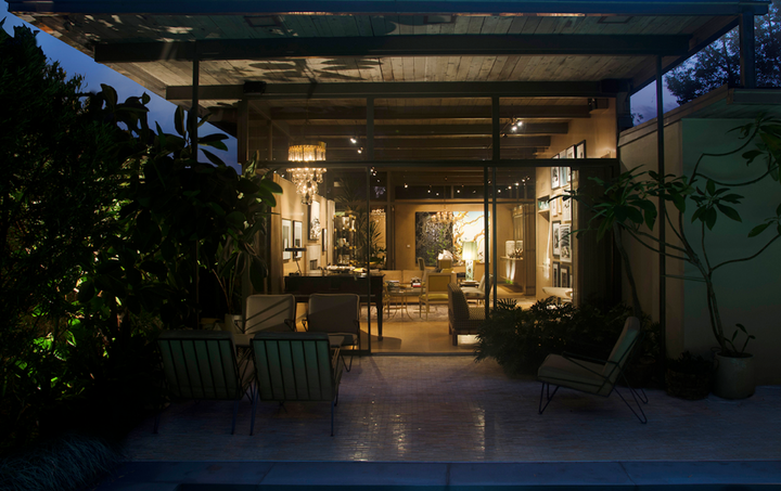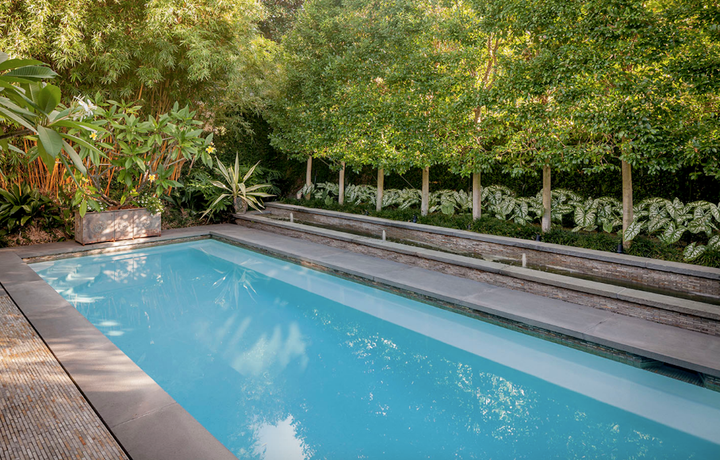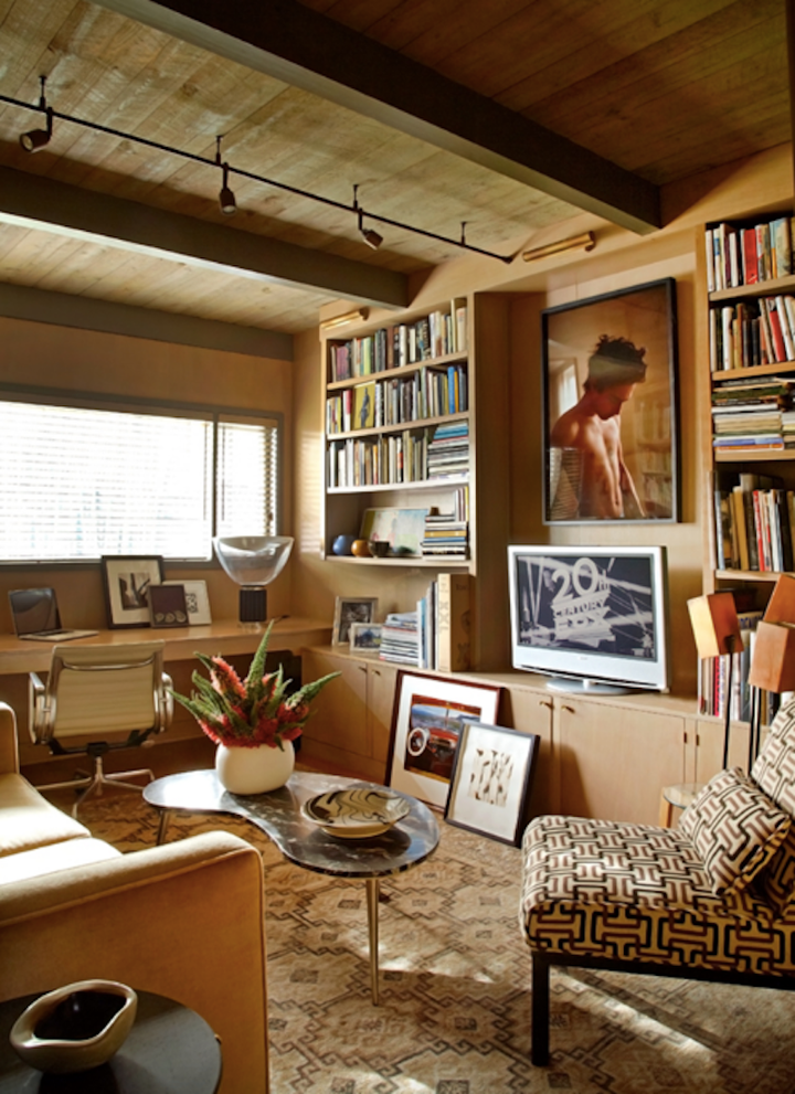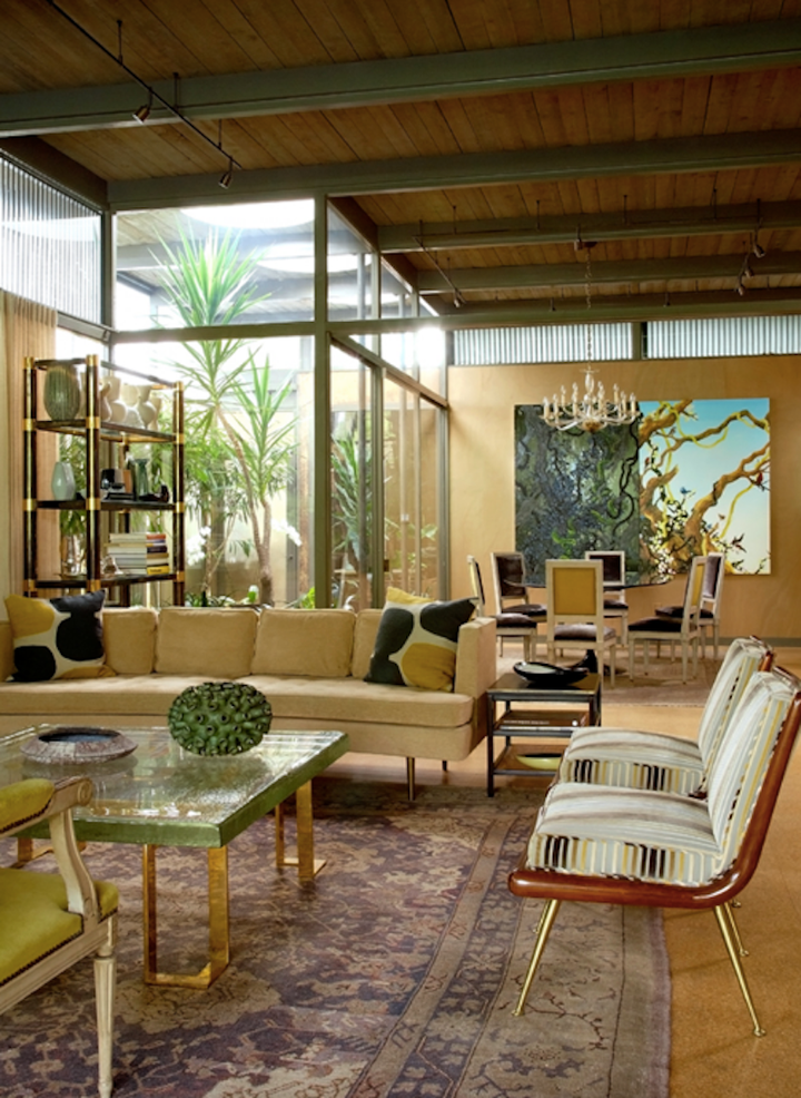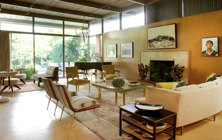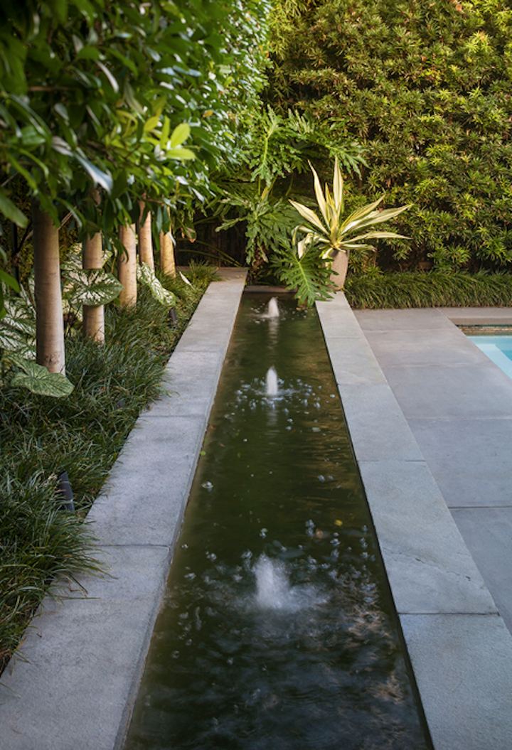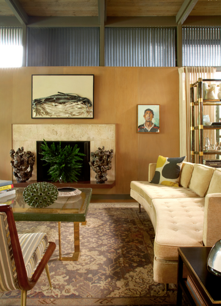 The interiors marry contemporary photography with mid-century and contemporary ceramics. The furniture is mostly mid-century modern (Robsjohn-Gibbings, Wormley, Haines), but with the occasional French antique mixed in, perhaps a nod to New Orleans and its plethora of good French antiques. Khotan and Oushak carpets soften the new cork floors. A pool and linear fountain were “inserted” into the shallow rear lot, and the perimeters heavily planted to create a large outdoor “room”.