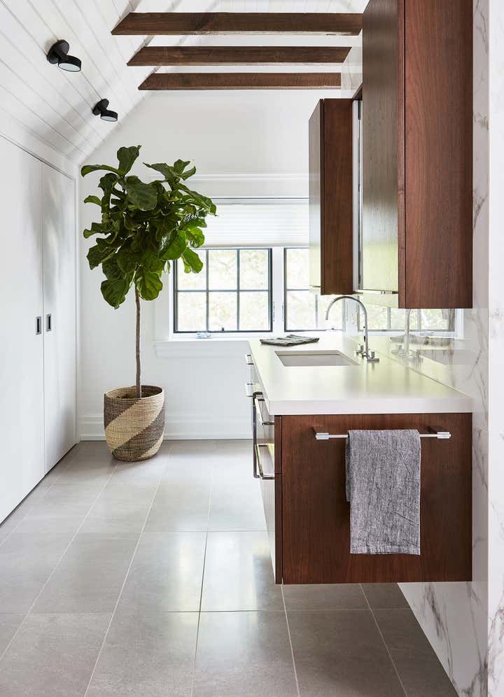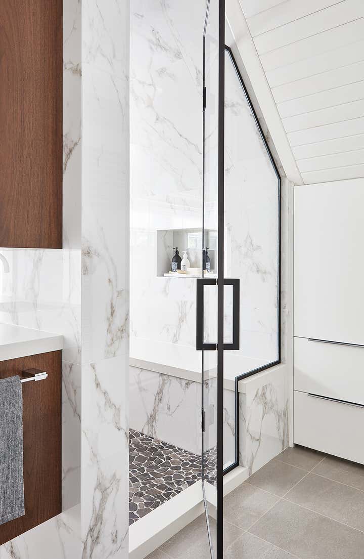 This third floor bathroom was inspired by the tree-top views from the window, and the previous tenants - a family of raccoons who had taken up residence in this once derelict century home. The homeowners wanted the room to feel like a tree house. Our goal was to create a contemporary bathroom with luxurious materials that created a serene connection with nature. Once the raccoons were evicted, the space was gutted and rebuilt as the master suite. We reconfigured the room with an eight-foot wall in the middle dividing the shower area from the sink, and used the angled ceilings to our advantage to incorporate extra storage behind the walls.