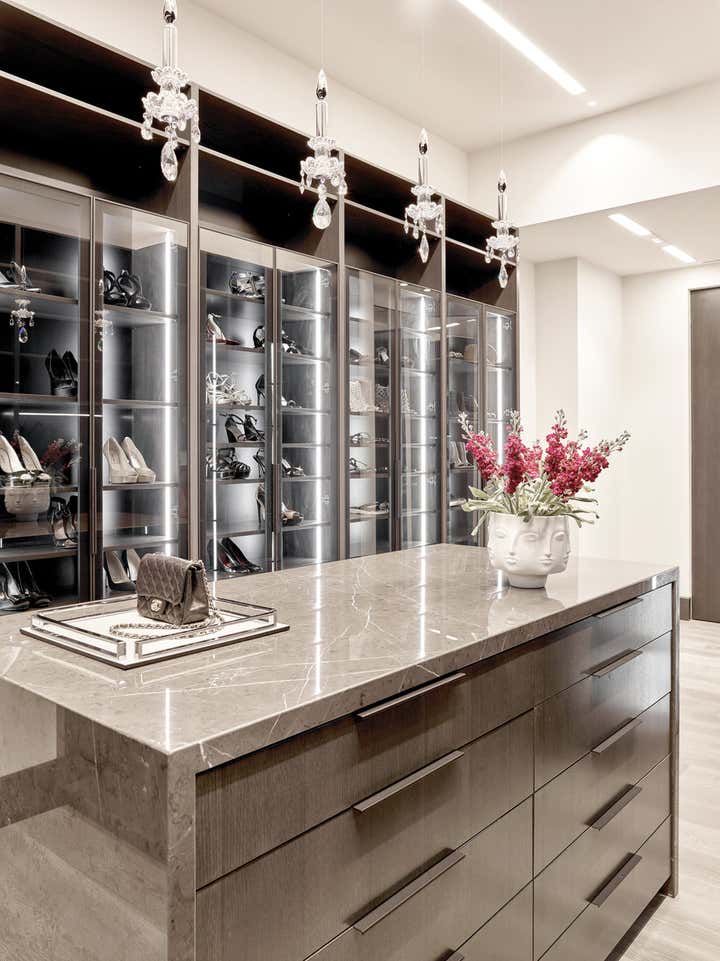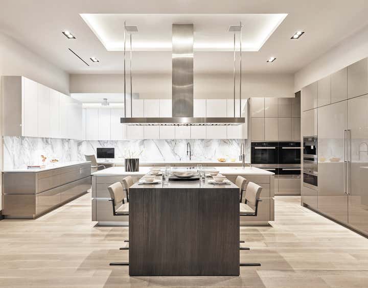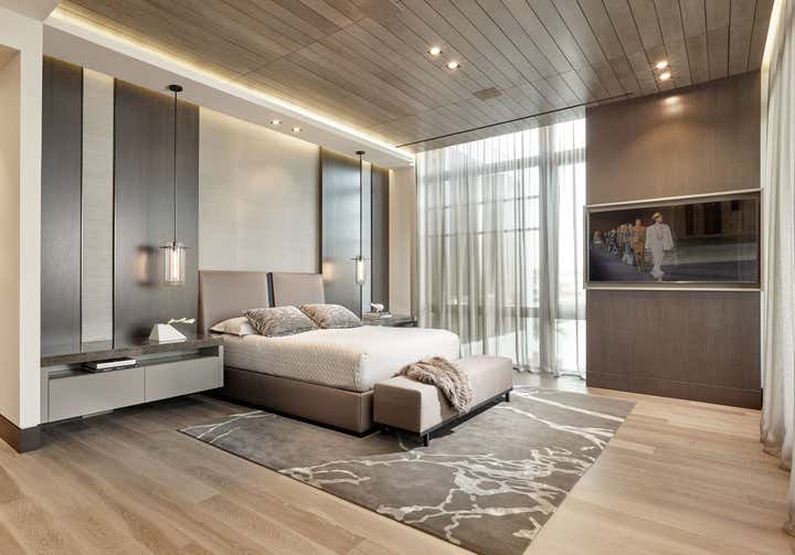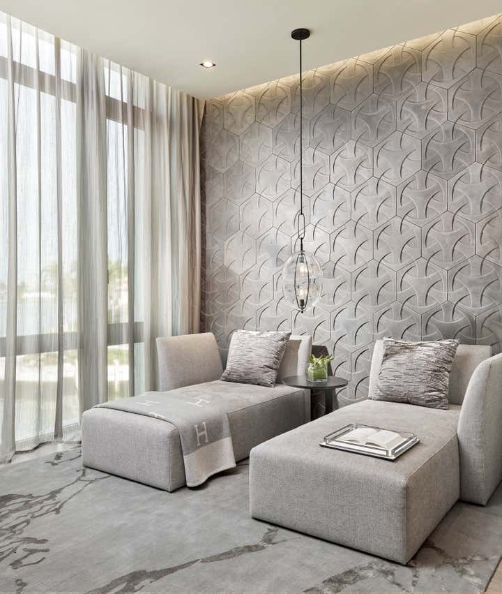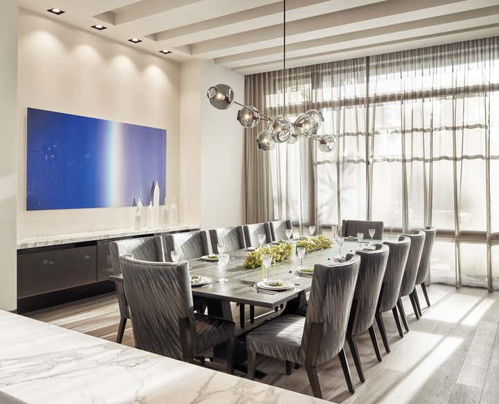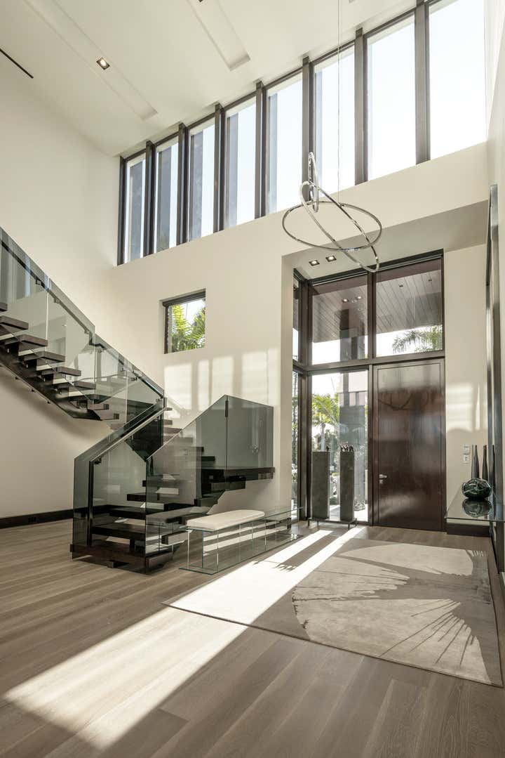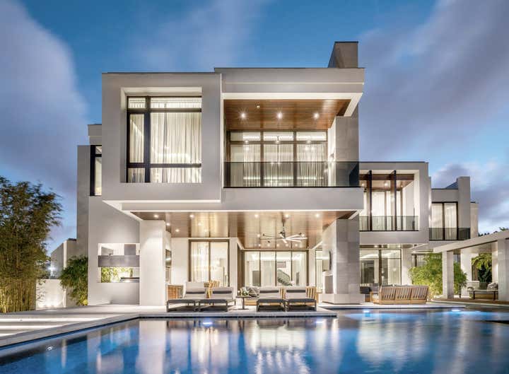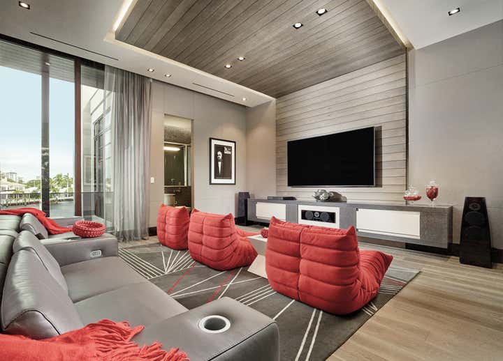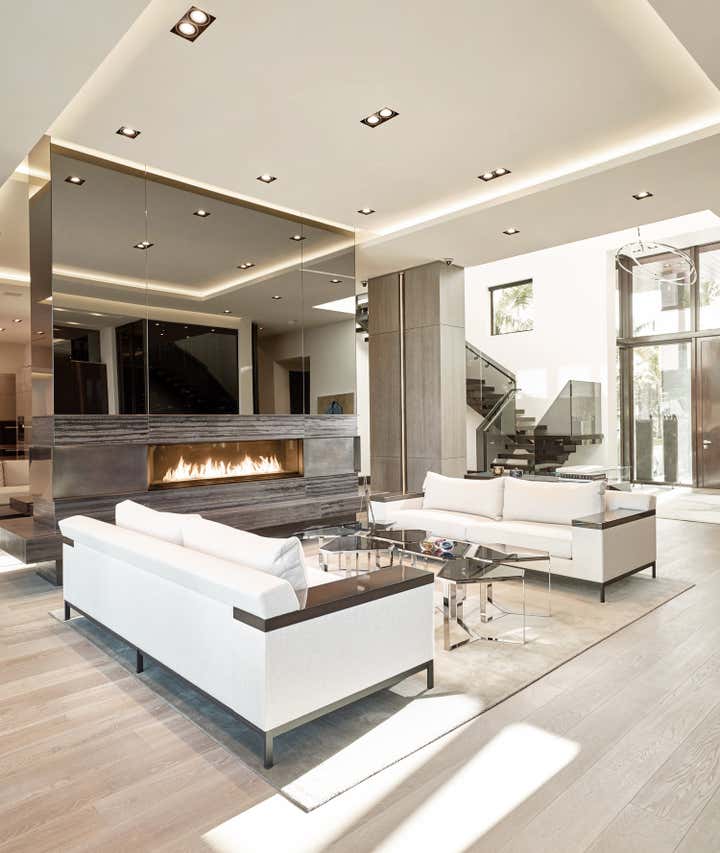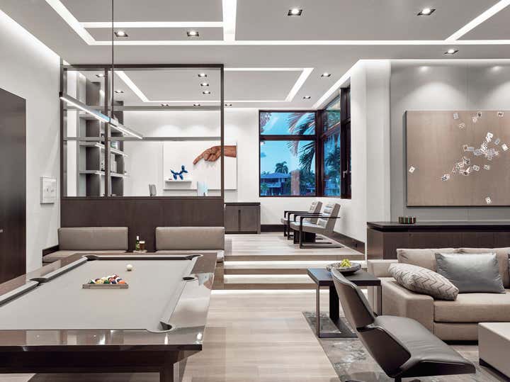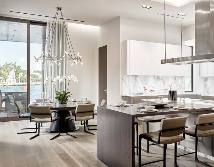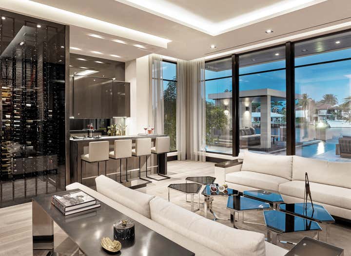 This 10, 000 sq. ft. manse perfectly situated on the Intracoastal in Ft. Lauderdale is a dream home for a family of five who love to entertain, spend time outdoors on the water and enjoy moments at home. Designed in a contemporary style, the interiors balance clean lines with a warm and inviting appeal. The home includes a club room, an open-plan state- of-the-art Chef’s kitchen, media room for the kids, and private retreats. A play of volumes and dimension are achieved through the use of blended materials throughout the design, from rift cut oak wood, asymmetrical drywall beams to textured wall coverings and concrete tile. The blending of sumptuous materials and luxe finishes create aesthetically stimulating layers in this design.