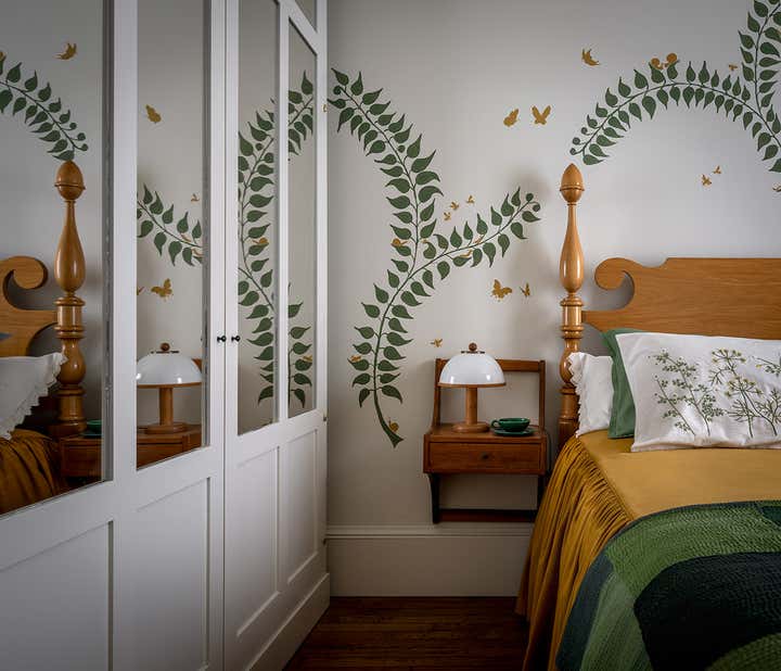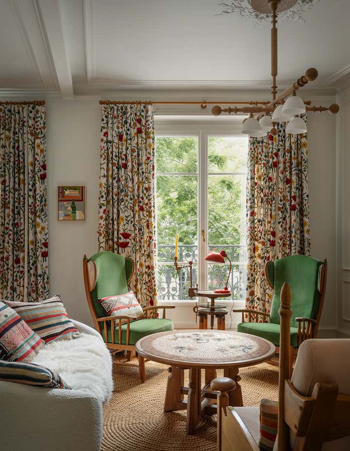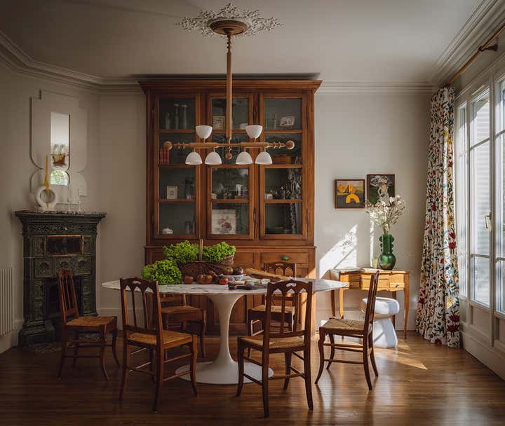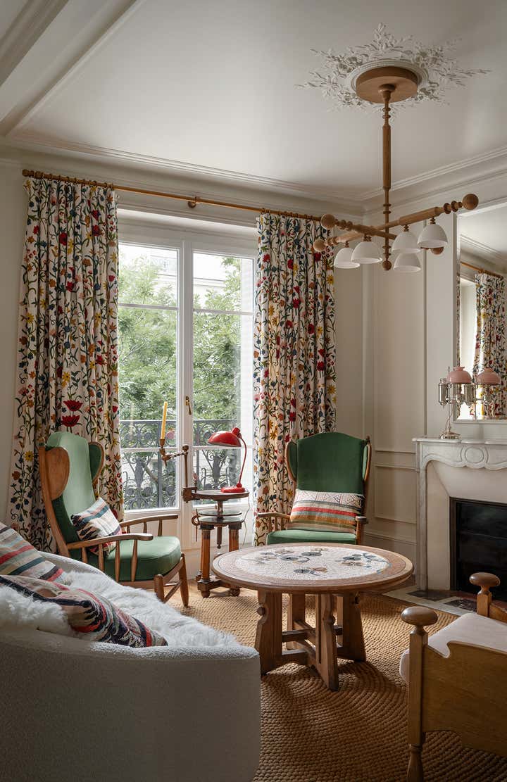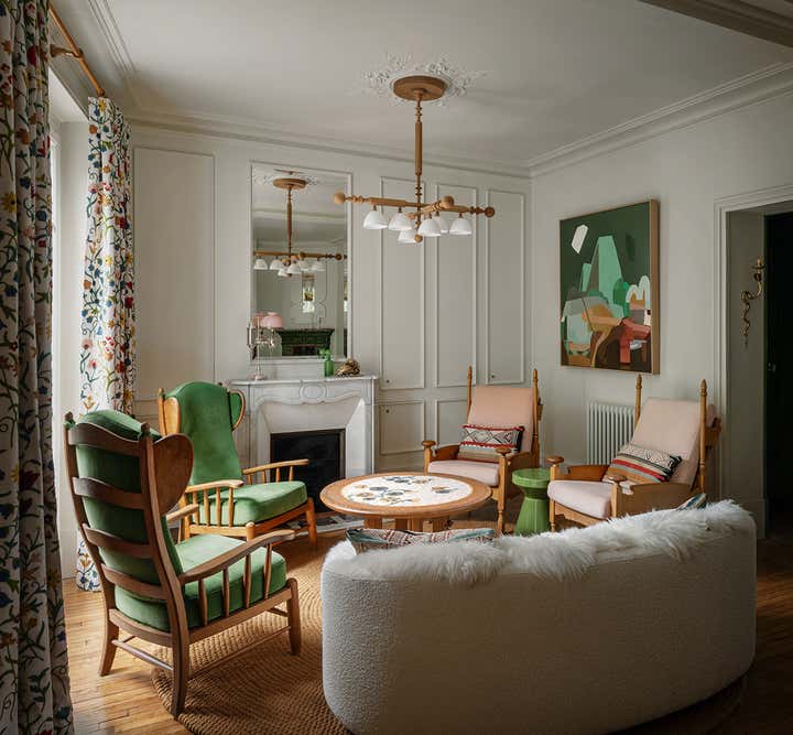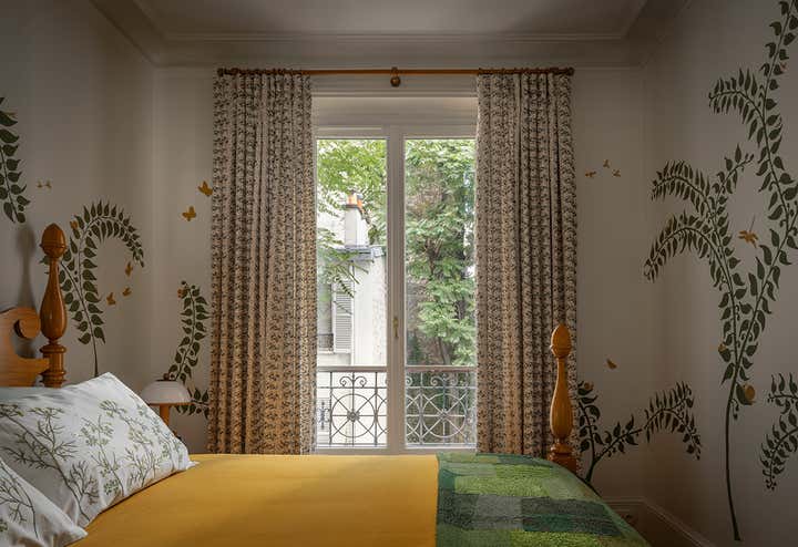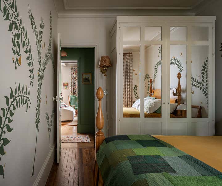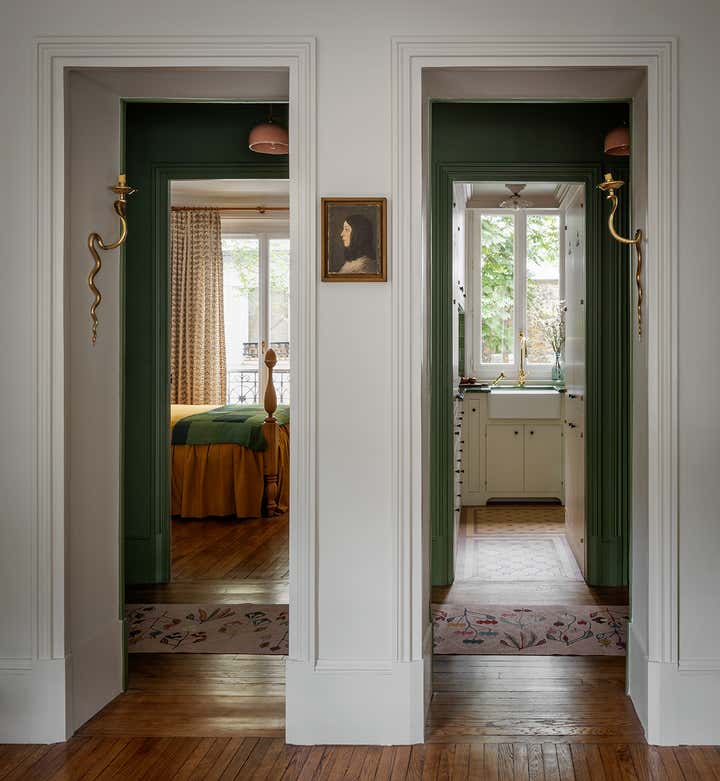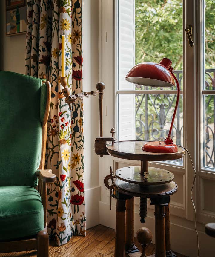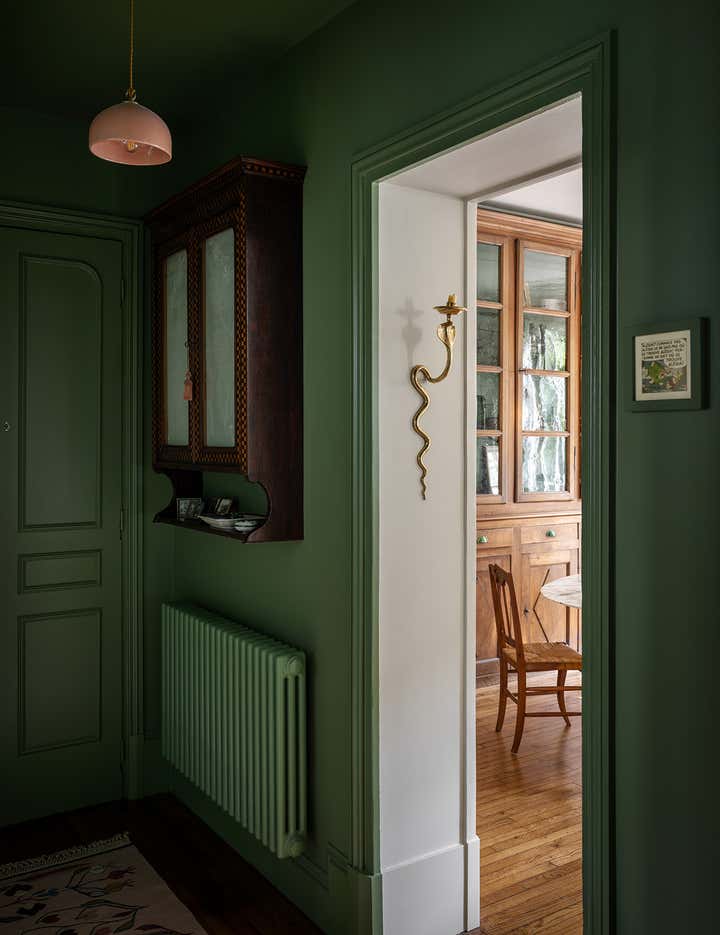 Located in Paris’s 14eme arrondissement, Jessica lovingly designed this 550 sq ft apartment for herself and her family. She took inspiration from the 14eme itself, a neighborhood with a village-like feel: abundant community gardens, quiet streets, mutual aid associations, and influence of many resident artists past and present. The apartment is playful and pastoral, with a rich palette of greens and filled with art made almost entirely by friends. The mural in the bedroom was hand-painted by Jessica to reflect the view out the window – leafy, green, and full of joy. Nearly all the furnishings are antiques sourced at Paris flea markets and elsewhere in France. The ceiling light fixtures are part of a lighting line designed by Jessica.