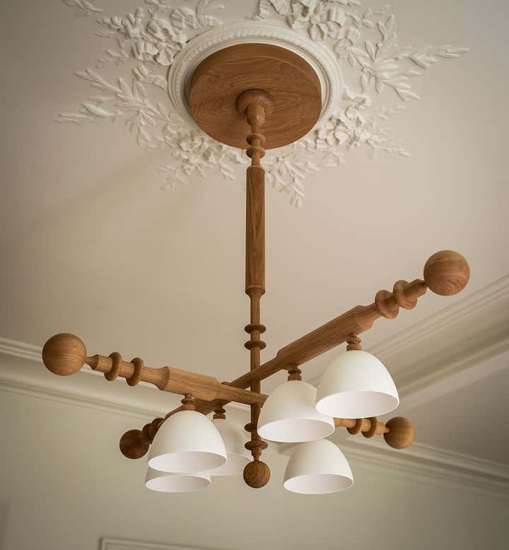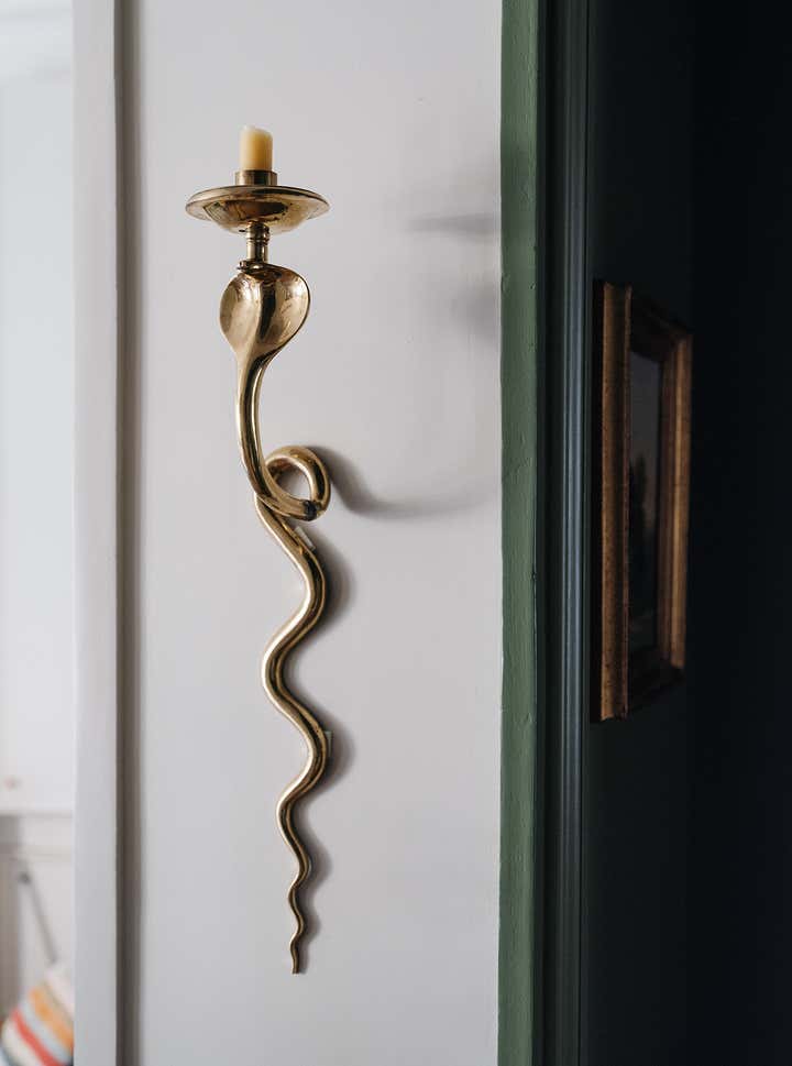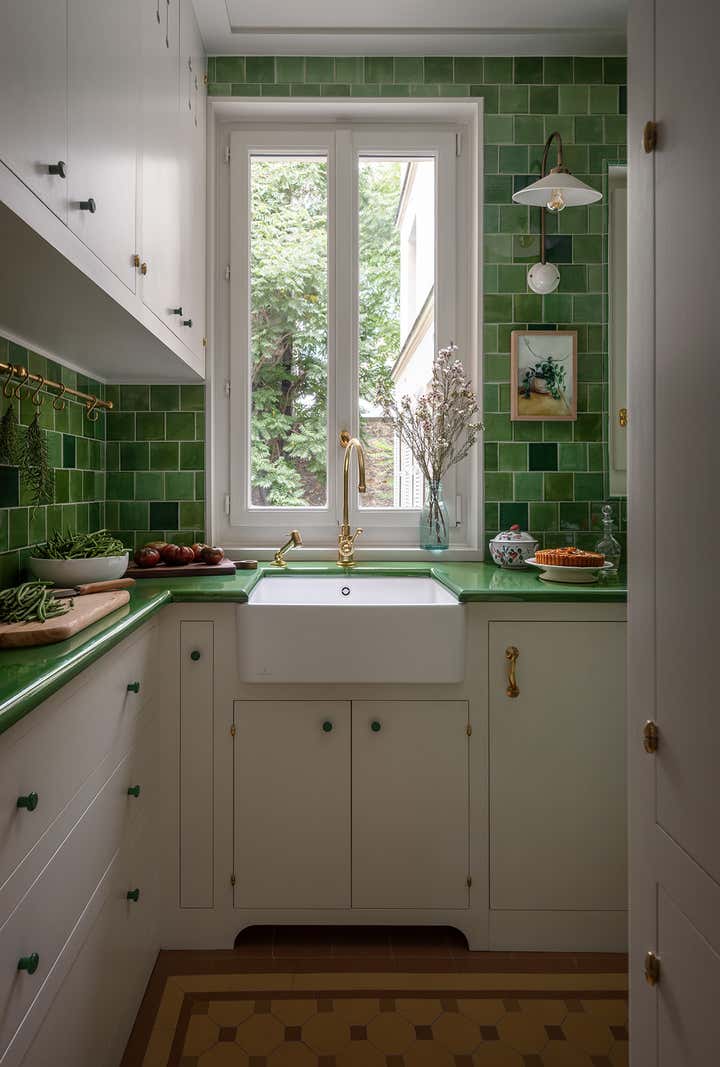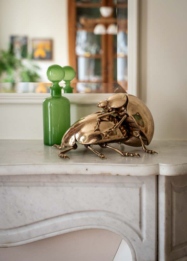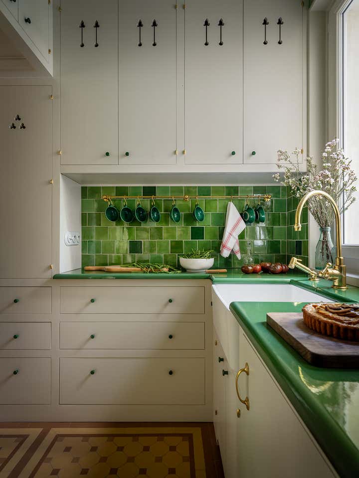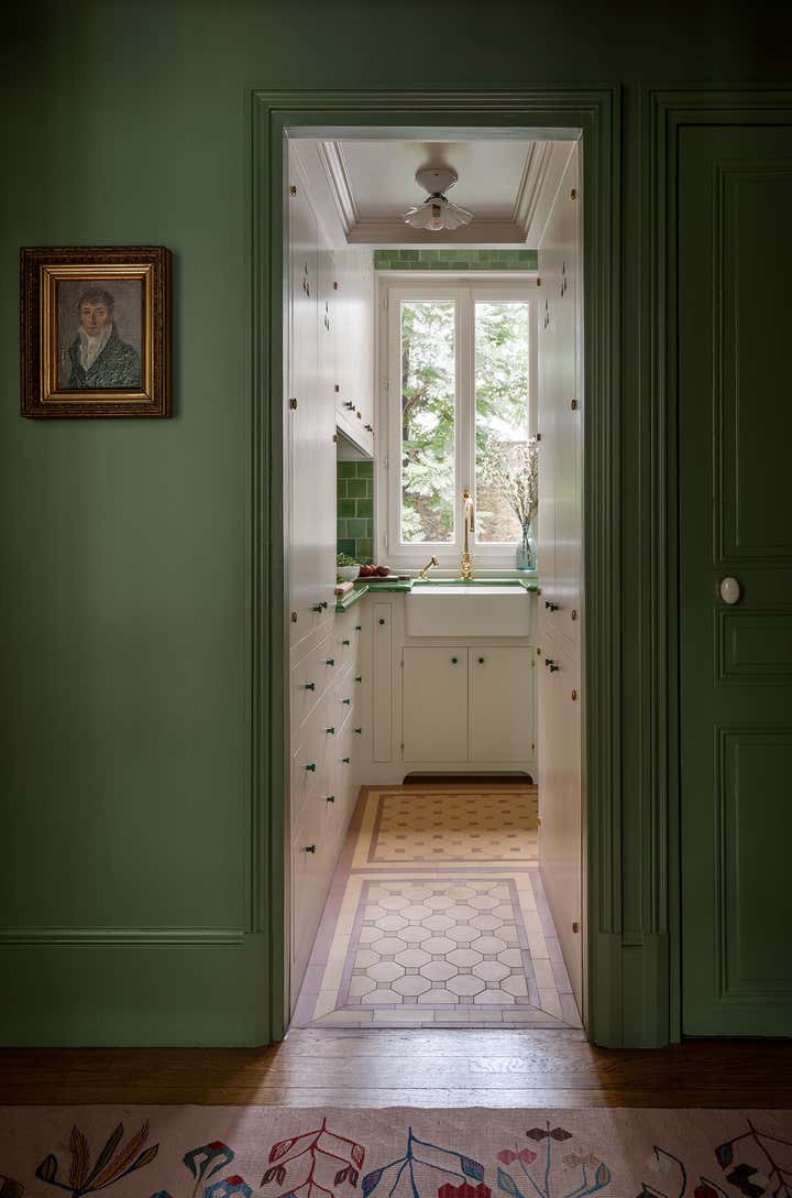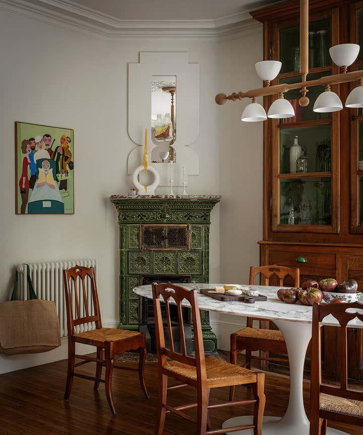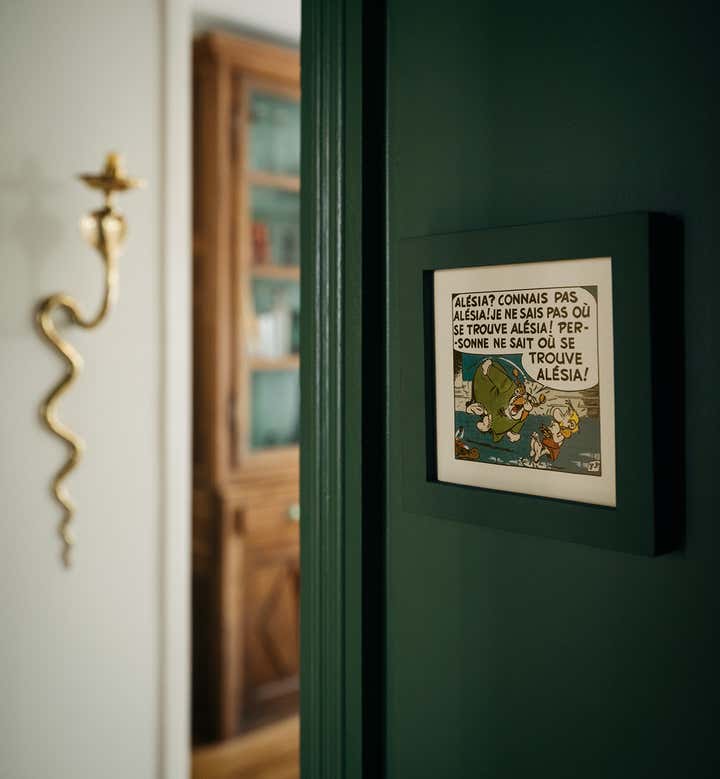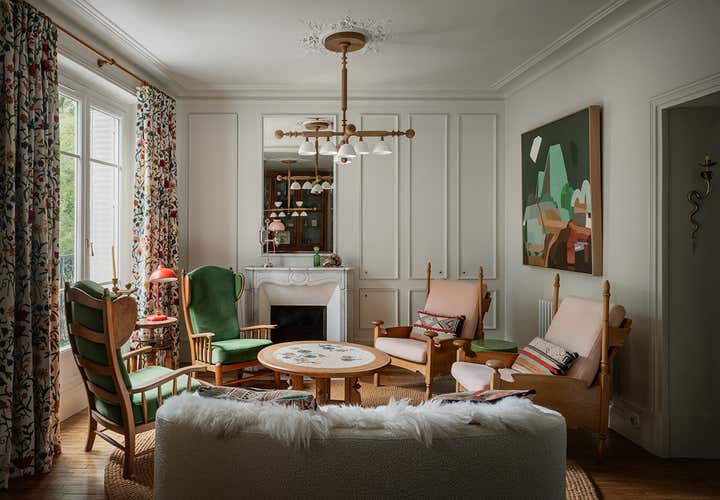 Located in Paris’s 14eme arrondissement, Jessica lovingly designed this 550 sq ft apartment for herself and her family. She took inspiration from the 14eme itself, a neighborhood with a village-like feel: abundant community gardens, quiet streets, mutual aid associations, and influence of many resident artists past and present. The apartment is playful and pastoral, with a rich palette of greens and filled with art made almost entirely by friends. The mural in the bedroom was hand-painted by Jessica to reflect the view out the window – leafy, green, and full of joy. Nearly all the furnishings are antiques sourced at Paris flea markets and elsewhere in France. The ceiling light fixtures are part of a lighting line designed by Jessica.