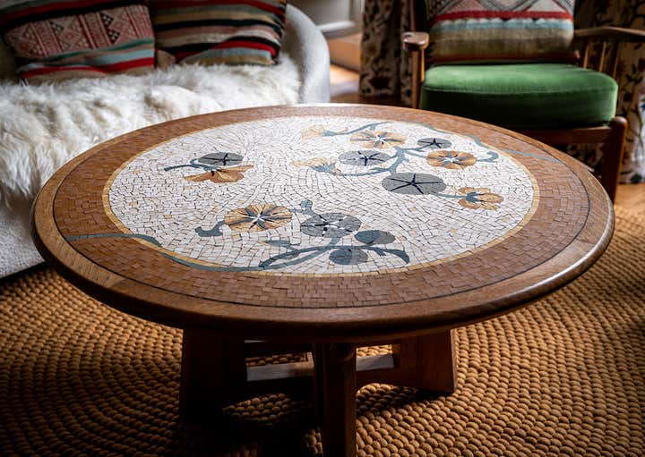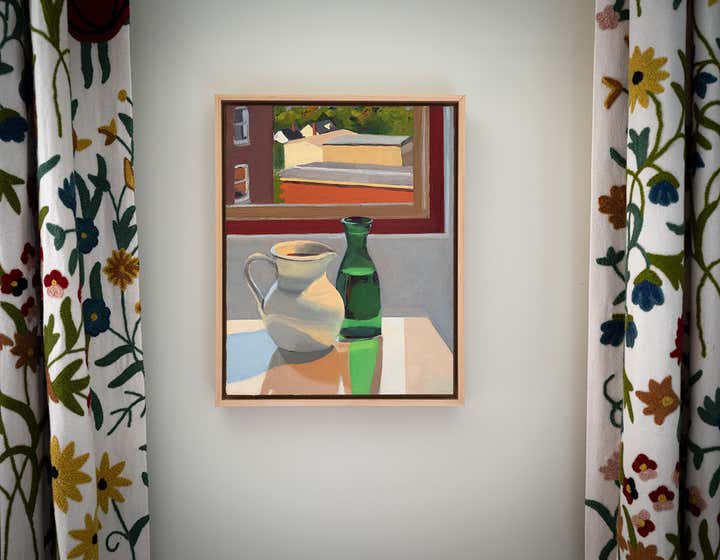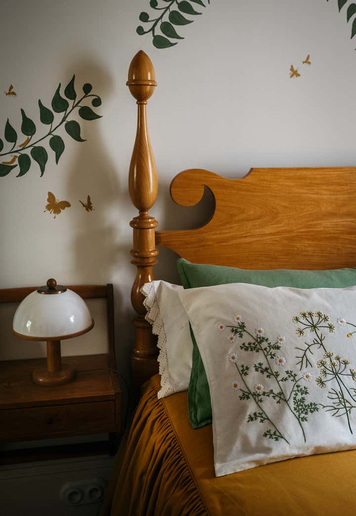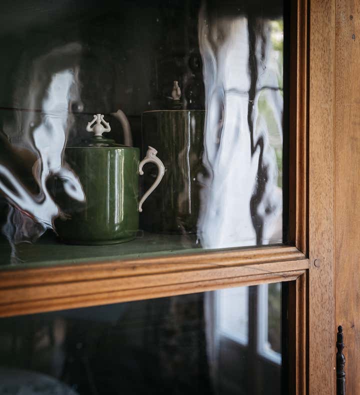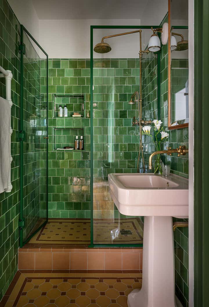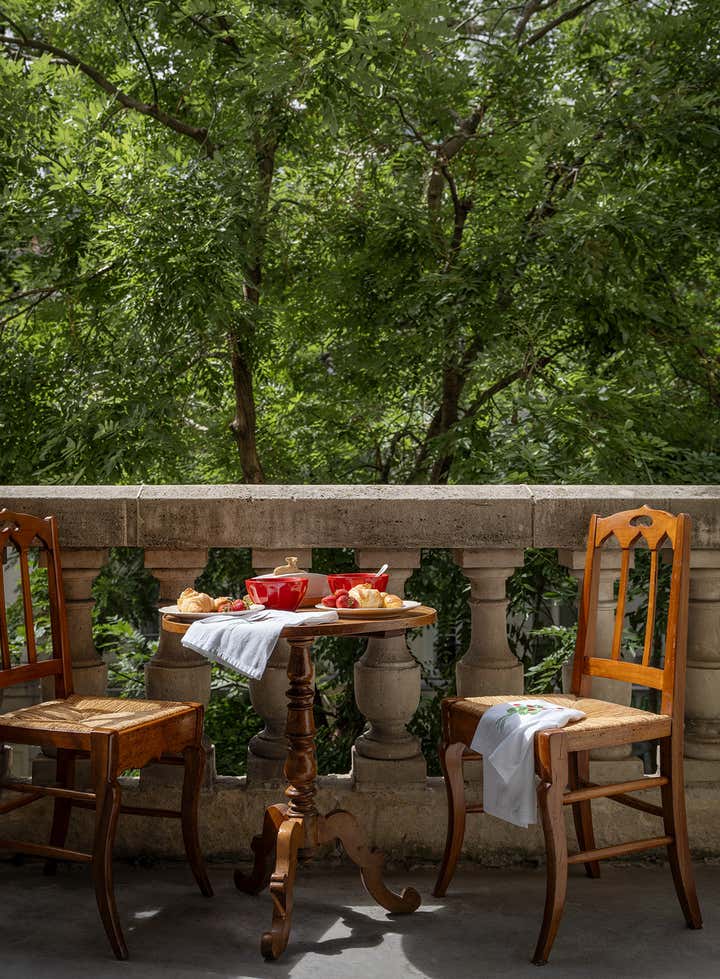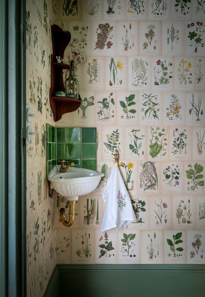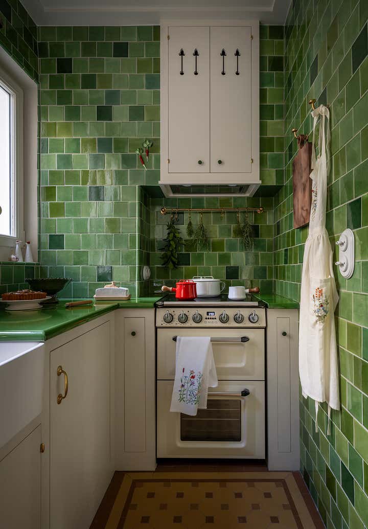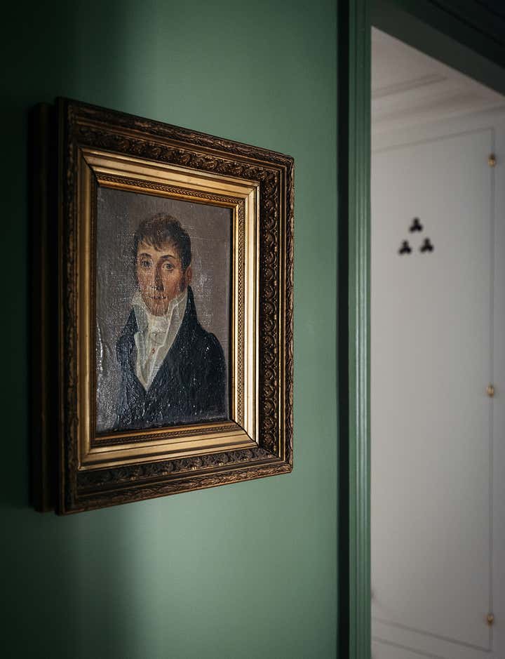 Located in Paris’s 14eme arrondissement, Jessica lovingly designed this 550 sq ft apartment for herself and her family. She took inspiration from the 14eme itself, a neighborhood with a village-like feel: abundant community gardens, quiet streets, mutual aid associations, and influence of many resident artists past and present. The apartment is playful and pastoral, with a rich palette of greens and filled with art made almost entirely by friends. The mural in the bedroom was hand-painted by Jessica to reflect the view out the window – leafy, green, and full of joy. Nearly all the furnishings are antiques sourced at Paris flea markets and elsewhere in France. The ceiling light fixtures are part of a lighting line designed by Jessica.