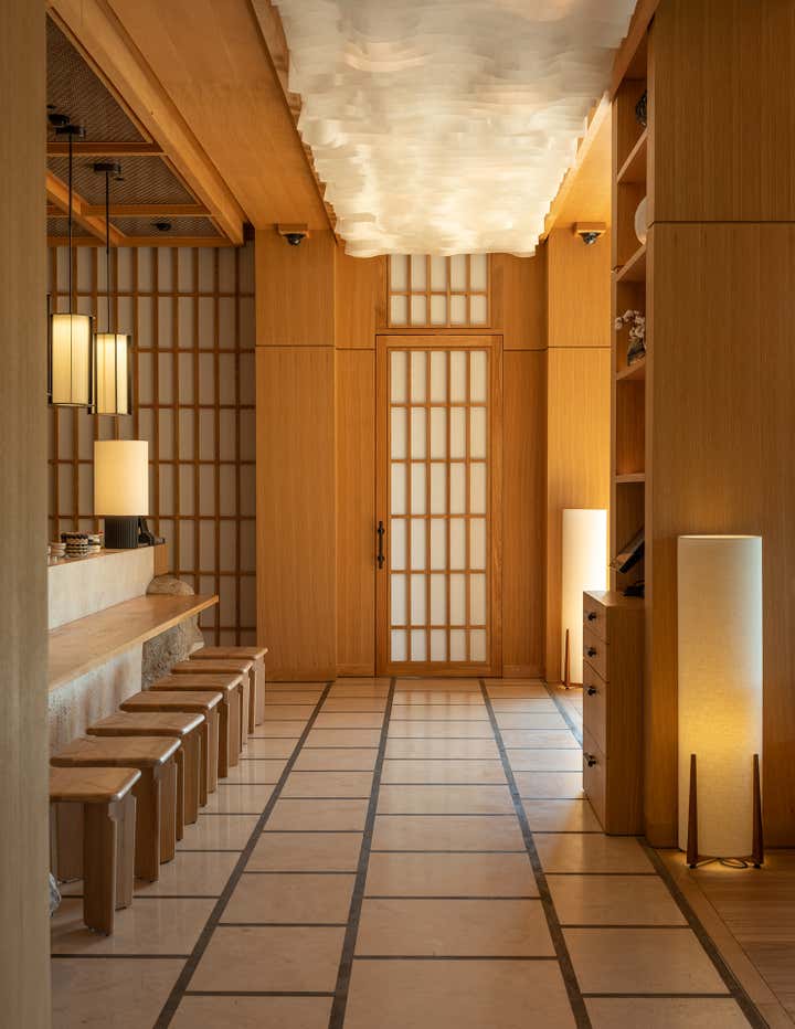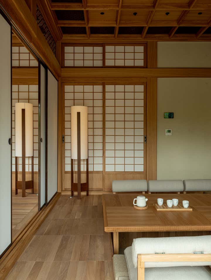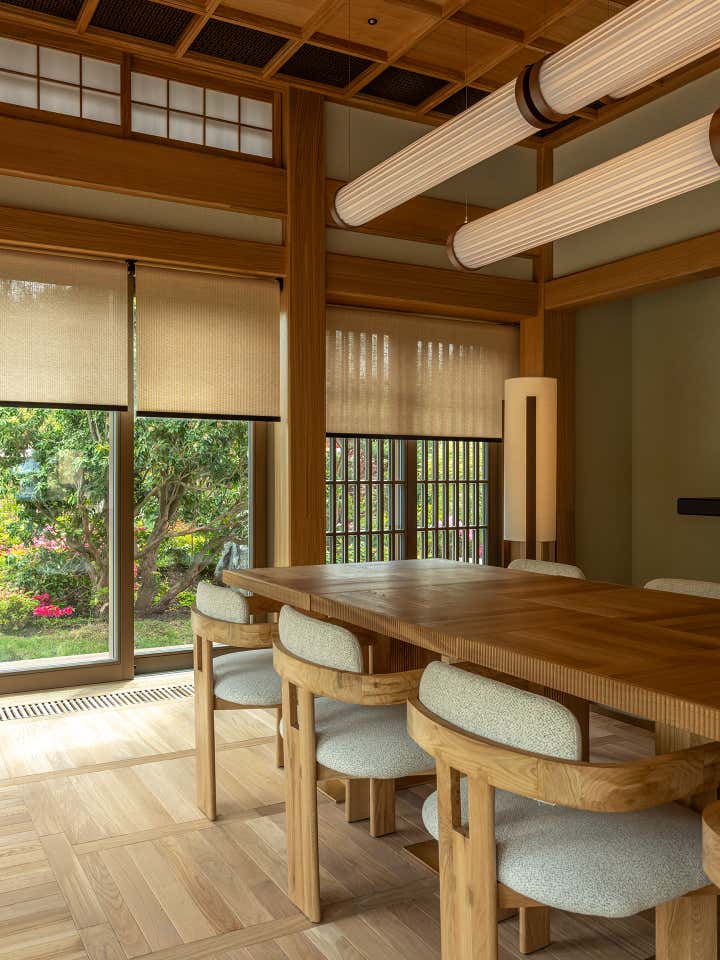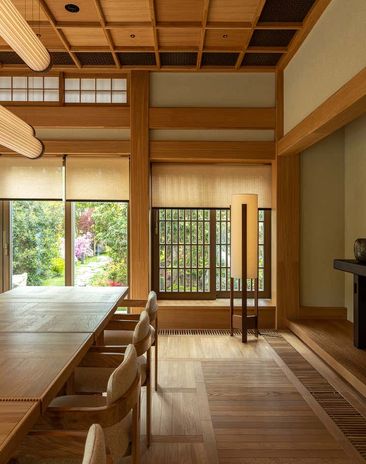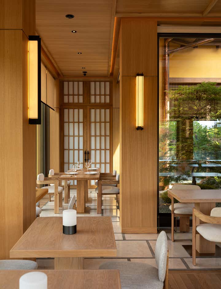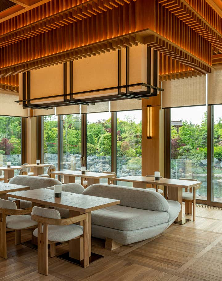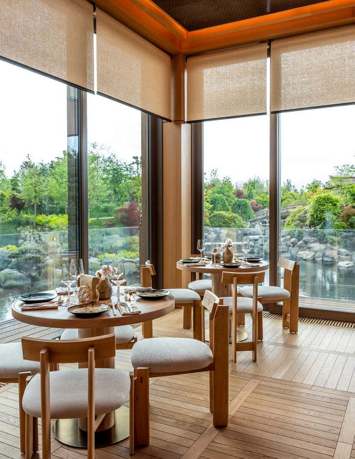 Ryotei restaurant is an atmospheric space with preserved authentic elements of Japanese food culture and aesthetics. Natural light wood, rough stone, textured wool contrasts with a warm, pleasant atmosphere with right accent light, bonsai trees and a picturesque view of the garden. Our mission was to avoid the clichés associated with Japanese cuisine establishments and develop something relevant and unique for Galitsky Park. The customer’s wish was a modern interior in muted colours, premium looking yet hospitable, with a relaxed atmosphere.