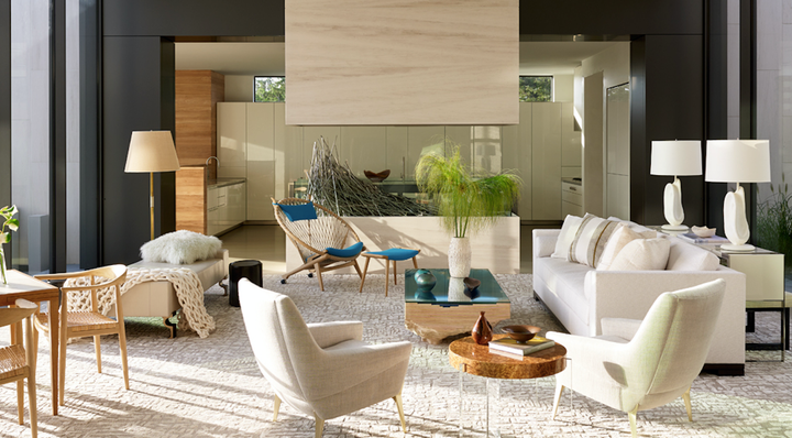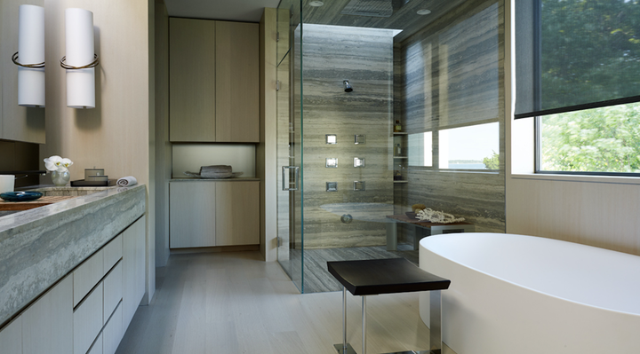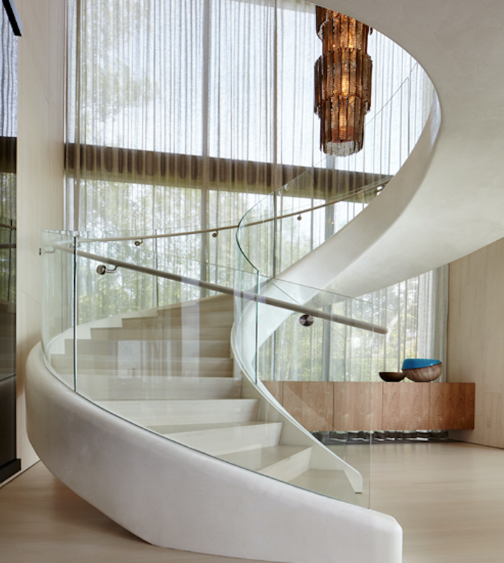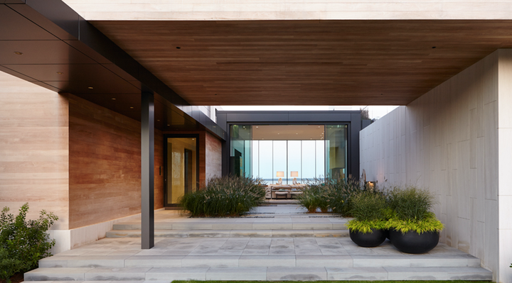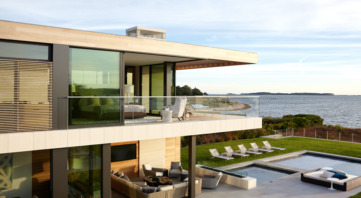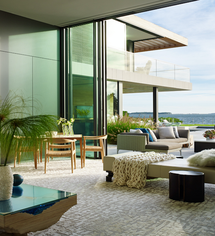 A modern home on the waterfront of Sag Harbor Cove designed for laid-back family living. Stone, wood and glass blend together with an interior palette of calming creams, golden caramels and vibrant aqua hues inspired by an aerial photo taken while traveling in Patagonia. Indoor and outdoor entertaining areas feature luxurious, yet comfortable furnishings that are in harmony with the surrounding landscape and views. Sleek, modern elements of the home are softened by layers of rich, natural textures to create an inviting and relaxed atmosphere.