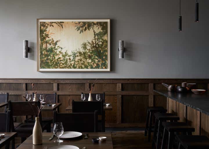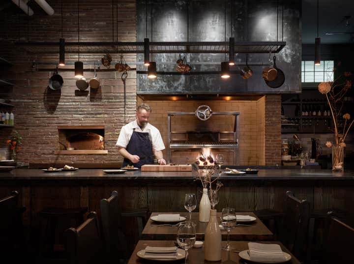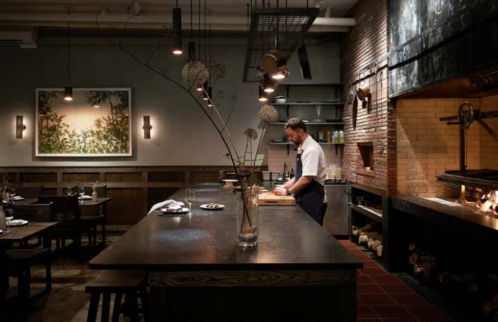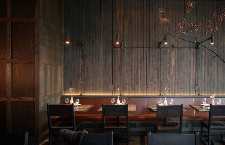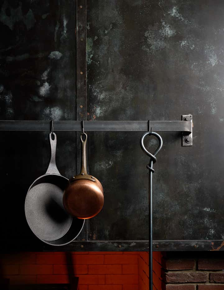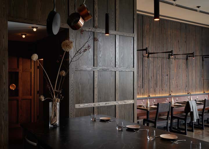Seating for 30 is handled through a mix of seating groups featuring tables topped with wood recycled from old piers and a leather banquette. A chef’s counter, finished in soapstone, seats an additional six guests. Richly patinaed copper cladding, fused glass, and Danish brick surround the grill and oven.