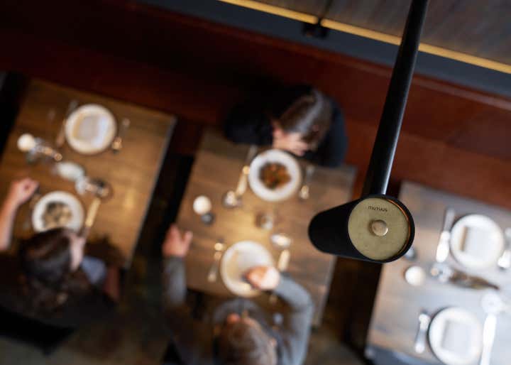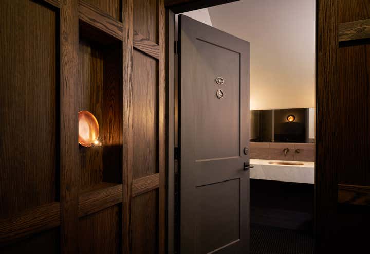 Throughout the interior, custom Mutuus Made lighting fixtures serve as important touchpoint, bringing the spirit of fire into the lighting scheme. The chef’s counter and food prep areas feature pendants made from knurled copper pipe with a custom patina. Banquette lighting is provided by a custom-designed rotating arm fixture that enables lighting to swing and adapt to table groupings
