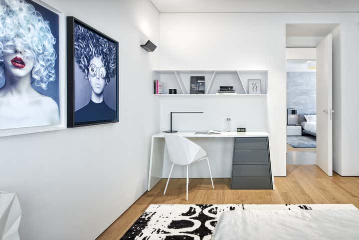 For this San Francisco home, Maydan Architects elegantly transformed an aging 1930’s apartment into an ultra-modern gem, with a focus on luxury and functionality. At 2,781 square feet, the four-bedroom, five-bathroom home spans the entire first floor of an apartment building in the Pacific Heights neighborhood of San Francisco. Intended to be a secondary family home for a couple with two kids and an eye for design, the space is minimalist and modern, featuring a striking angular aesthetic while remaining cozy and comfortable.