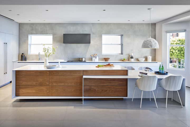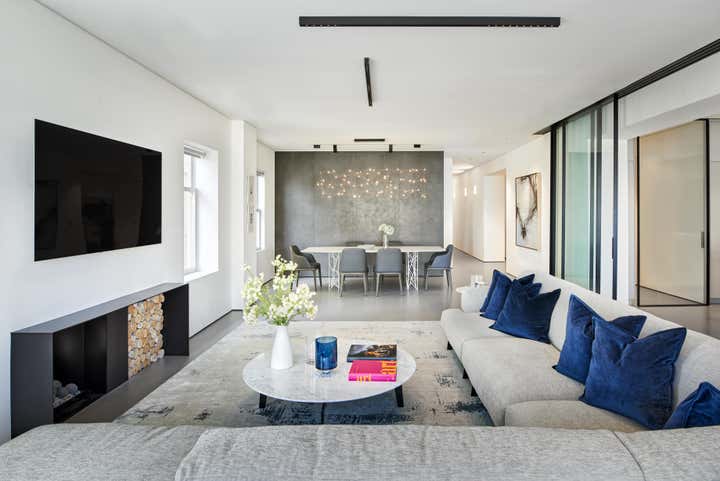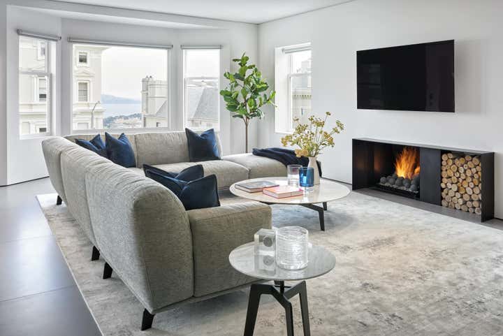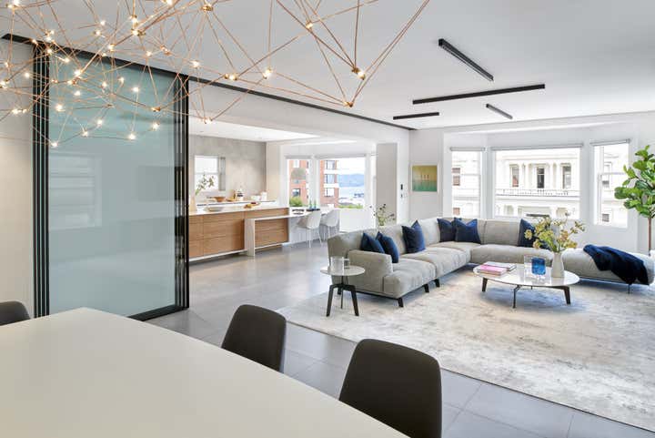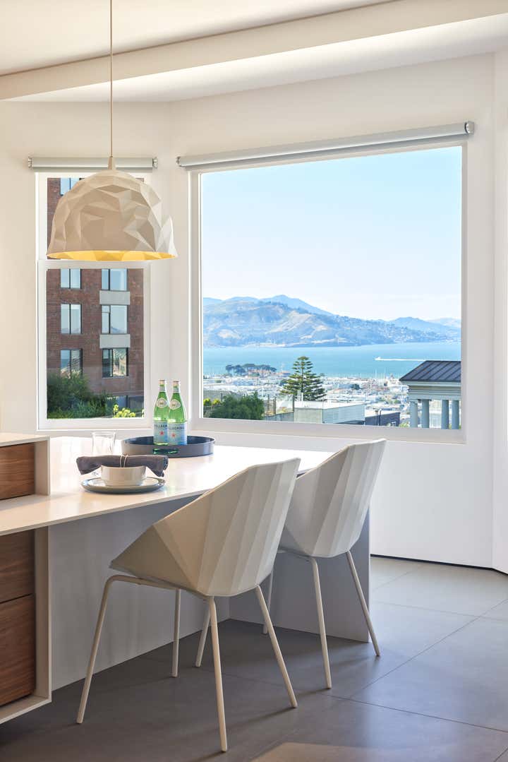 Spearheading both the architecture and interior design, Maydan Architects managed a full remodel of the space, having the interior stripped down to the bare studs with only the shell of the floor maintained. Tasked with emphasizing the stunning views surrounding the building — which had been obstructed in the home’s former compartmentalized, maze-like layout — Maydan Architects created a 900 square-foot open space that encapsulates the kitchen, living room, and dining room. Views of the San Francisco Bay and Golden Gate Bridge are visible from each space in this communal area, which is well-suited for hosting family and guests.