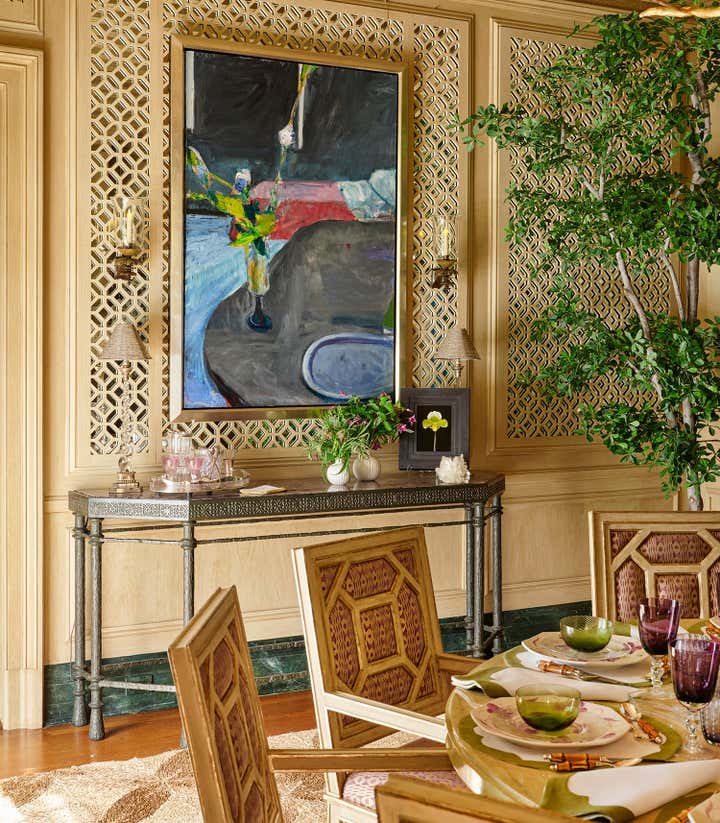 Suzanne Tucker designed this very same dining room when the San Francisco Showcase took place in this spectacular house in 1989 (35 years ago!). We could not pass up the opportunity to come back for the 45th anniversary of the San Francisco Showcase and reimagine this beautiful sunset-facing dining room as a then-and-now story – a chic, garden-inspired experience from daytime into nighttime – and night caps! Together with Design Principal Amanda Ahlgren, we have honored the architecture and conjured up bleached textures, shades of greens, tones of bronze, mirrored treillage, and a quirky yet always elegant mix of furnishings and tablescapes for a contemporary world.
