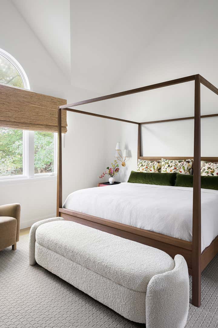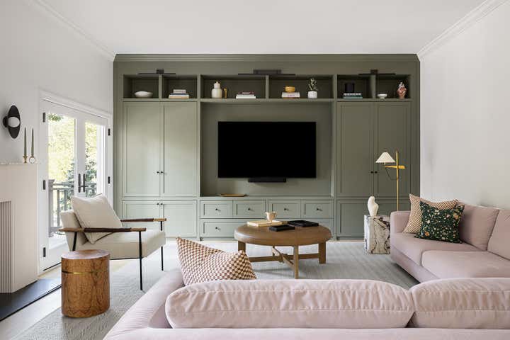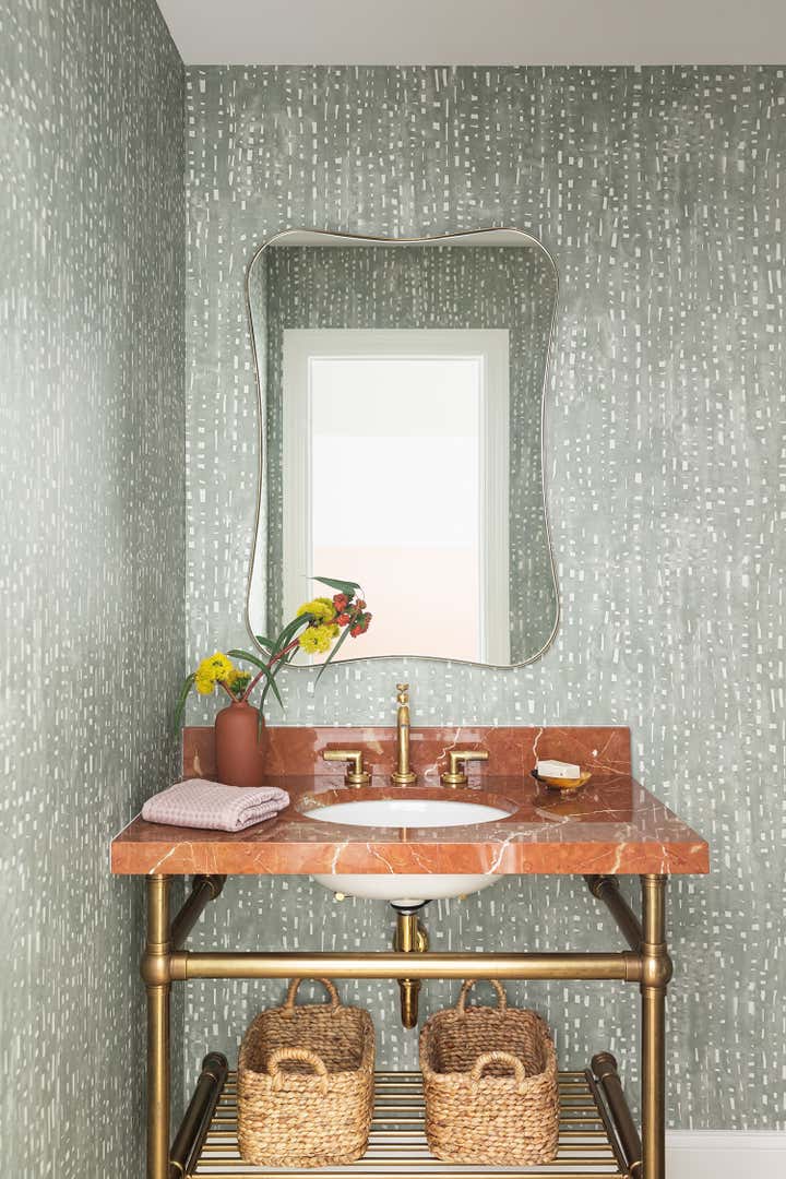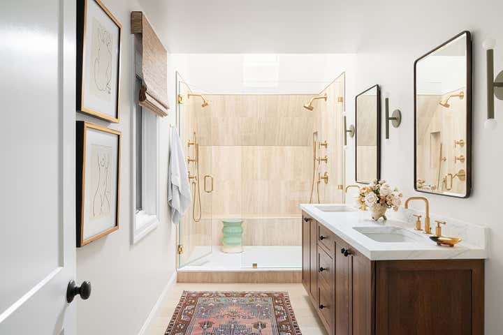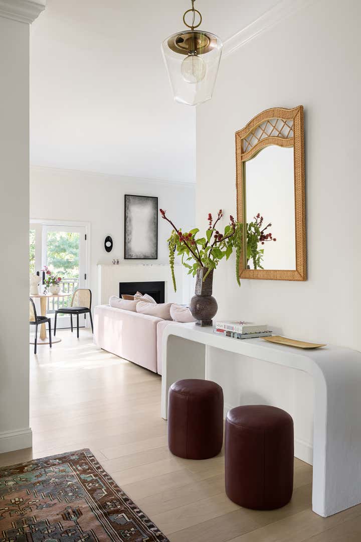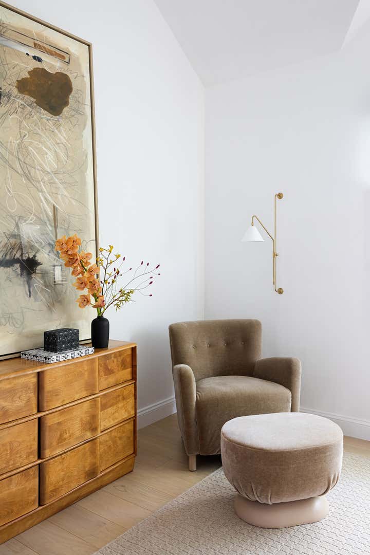 We started from scratch in a townhouse that hadn’t been touched in decades and required everything to be ripped out to the studs. We worked to balance our client’s personal styles, which spanned from bohemian to tailored and we landed somewhere that created a warm, organic feeling home with a nod to tradition. Project highlights include the double shower in the primary bathroom, the living room’s rich green built-in alongside the lavender sofa, and the bedside Royere-inspired sconces that bring a bit of whimsy to the primary bedroom.