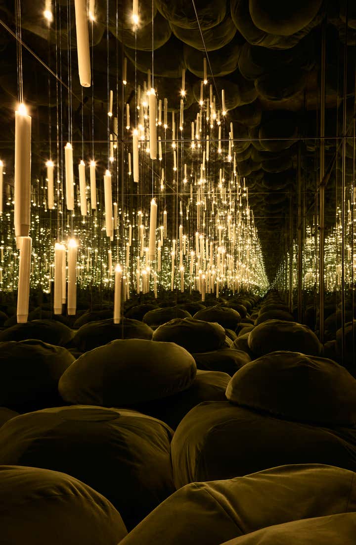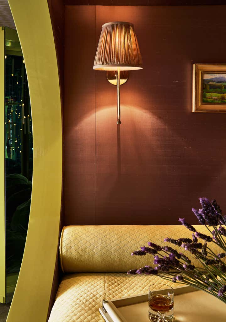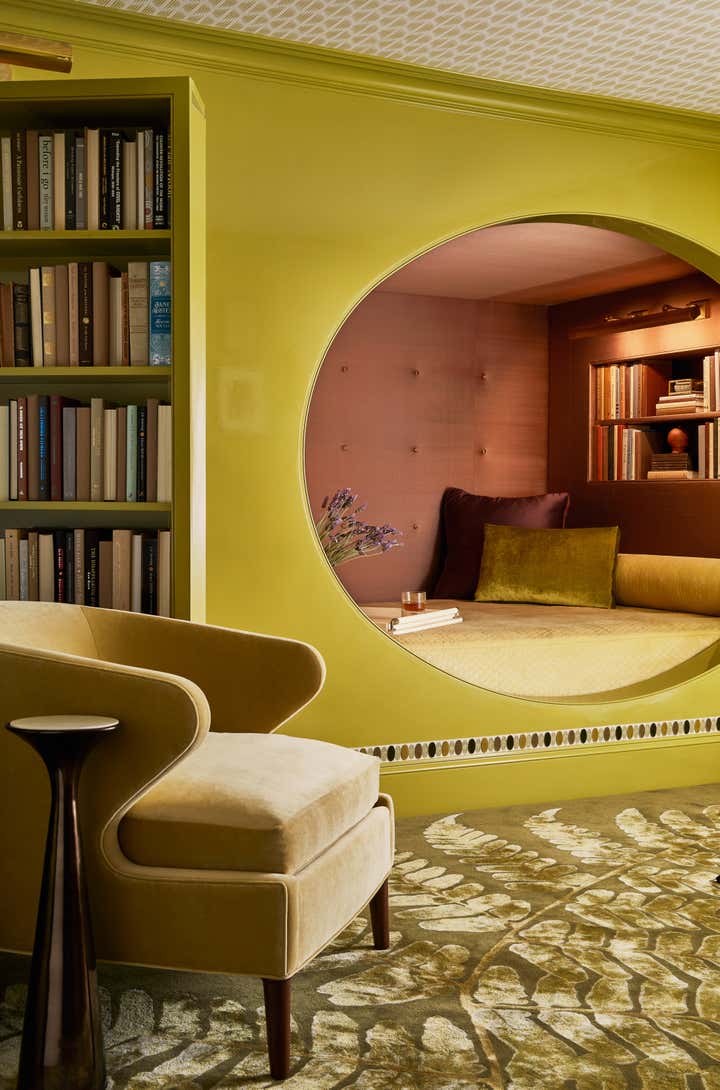 Total escape was the design objective for this private client. A new oval bed alcove and mossy color palette include a secret bookcase door, which only opens by pulling Jane Austen s Pride and Prejudice. Beyond lies a fully-mirrored inner mediation room. Lined with velvet floor pillows and illuminated with just 12 flameless candles, the illusion of infinite space enchants the senses.