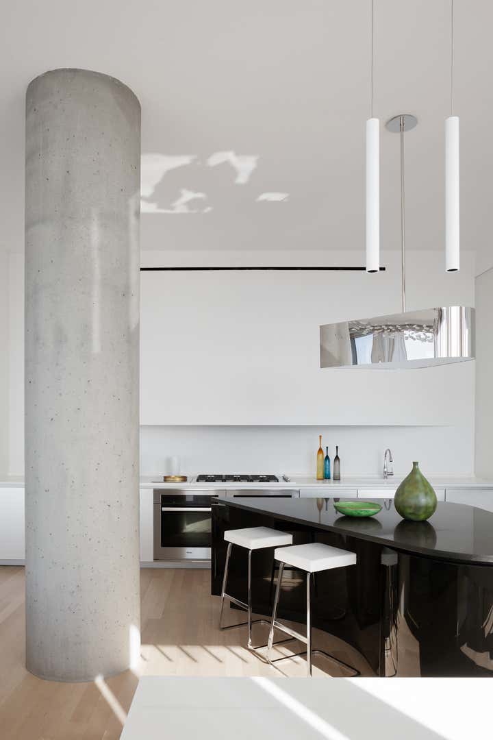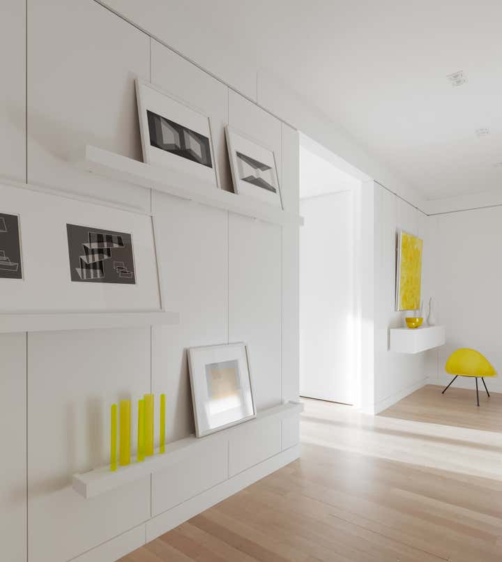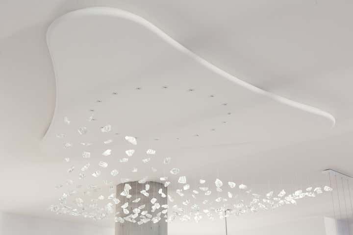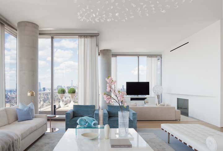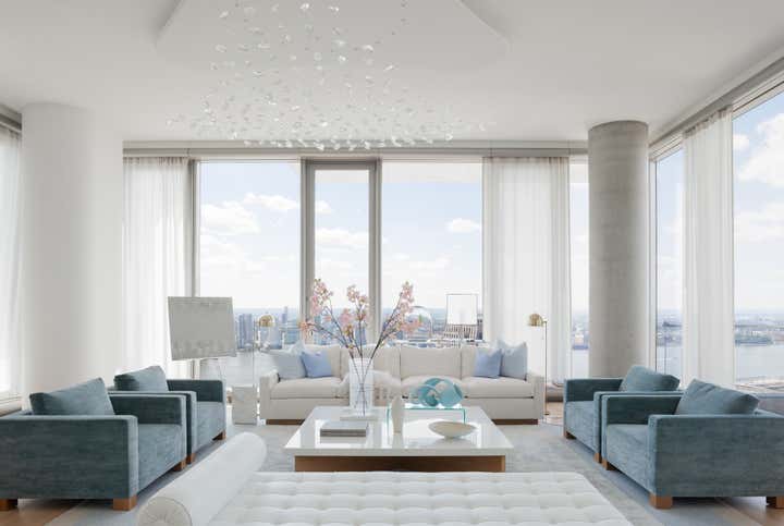 Brief: In a standard building residence within Herzog de Meuron’s iconic 56 Leonard Street, create a precise intervention to solve the four main problems of the interior space; a rigid relationship between the orthogonal curtain wall and the space, no central axes, a dead end corridor, and a lack of material hierarchies. Solution: To address the asymmetry of the large living and dining room, a new ceiling fixture was created to capture the disparate axes through the space and to soften the rigid relationship between the program and the curtain wall. By creating a rounded triangular plane from plaster, free-standing in the room, the furniture and program are able to resolve themselves in complete arrangements around this new center point. A celestial sculpture is installed on the fixture by Finnish artist Ilkka Suppanen. Custom designed for the piece, hundreds of Murano crystals are suspended as a cloud to disperse the light coming from minimal downlights in the plaster. The effect is an ethereal chandelier to further soften the space. Some dead-ends were eliminated by opening up walls to improve circulation around volumes within the apartment. To create a spatial hierarchy along the new circulation loop and to provide functionality to the program in rooms, more refined material systems were tailored to the walls. Usurping the abundance of building standard drywall in the foyer, a white lacquer panel rhythm was installed with floating corian shelves and tables to create an entry gallery and art space. In the master bedroom, the headboard wall becomes a large full-height upholstered headboard embracing the magical views to the north of the Empire State Building. As the unit belongs to the sky, the palette of furnishings, artwork, lighting, and accessories express a lightness of weight on such a high floor.