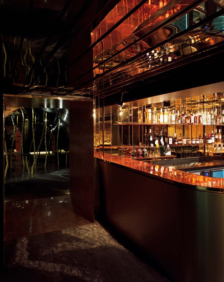 The club is shielded with a strong motive of raw wood cladding blocks and decomposed marble that provide the space with a protector soul. Hints of gold punctuate the place, either the metal itself or elaborated powder projections technique, as a game of lights and shadows, applied according to the traditional methods.