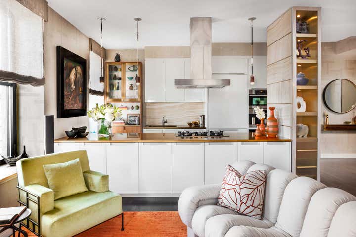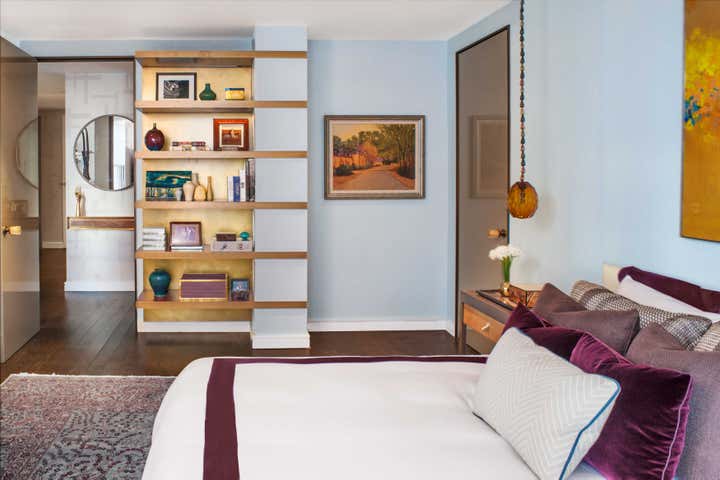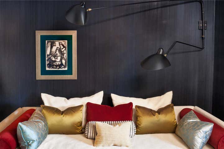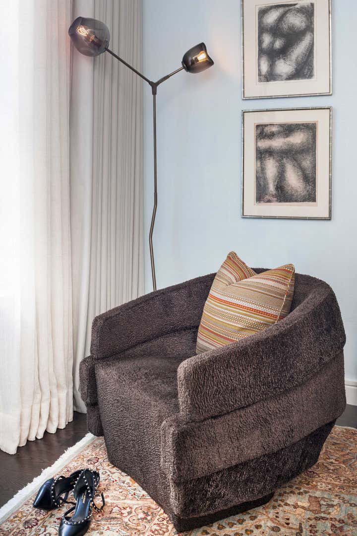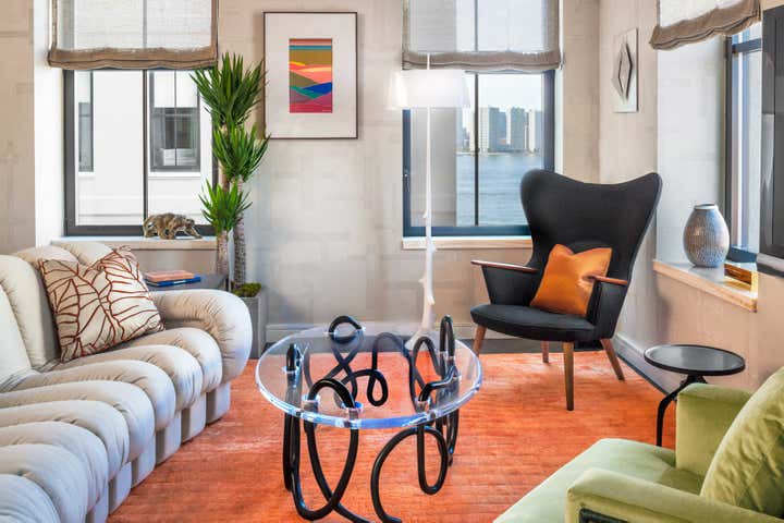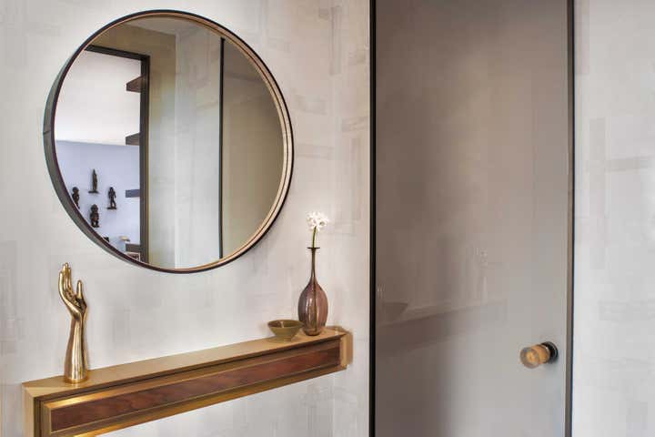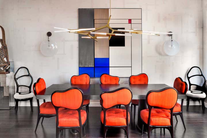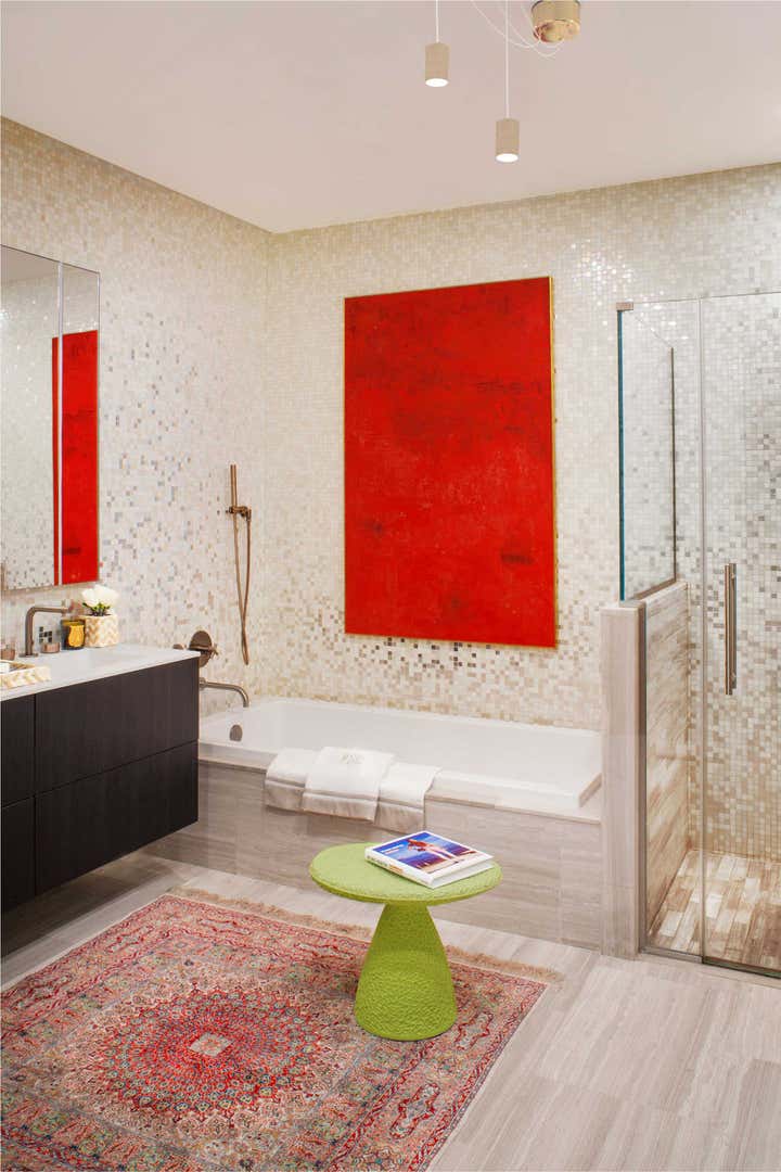 This bold and daring client gave Nicole Fuller Interiors carte blanche to create his colorful and fully custom luxury home. Coordinating between builder and an architect, Fuller completely gutted the space, reconfigured the layout, and specified each and every finish. Decorated with museum-quality vintage finds, auction items from Philips de Pury, gallery-quality furnishings from Ralph Pucci, lighting by Lindsey Adelman, and important contemporary art, every square inch of this apartment is noteworthy. Fuller also created various bespoke elements such as custom wall treatments for each room, and a master bathroom tiled in precious white gold mosaic from Bisazza.