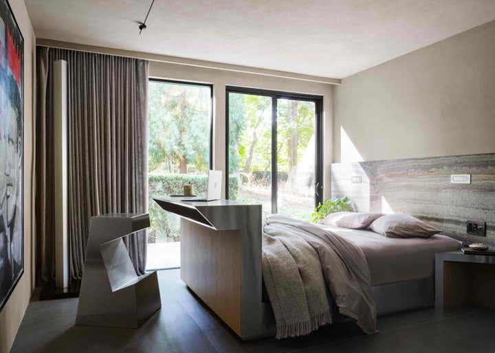 Much like Goldfinger’s lair, stainless steel is utilized throughout—from the furniture to the hardware. Mayan Ziggurat temples served as the basis for the living room fireplace, and the hanging garden was inspired by the work of Paul Rudolph (specifically, his angled walls).