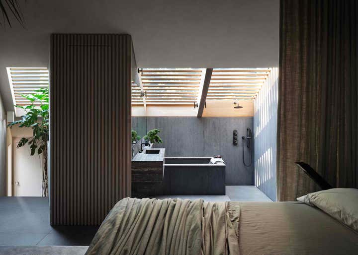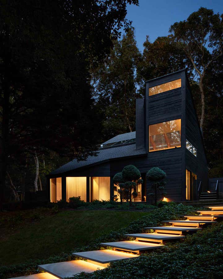 Open space is essential to any good bachelor pad, allowing for ease of entertainment. While the primary bathroom walls have been removed to improve the flow on the top floor, the floors themselves have been raised to create a floating look. Similarly, a new exterior staircase mimics the appearance of floating lily pads over the green ground covers. Ian Fleming would no doubt approve.