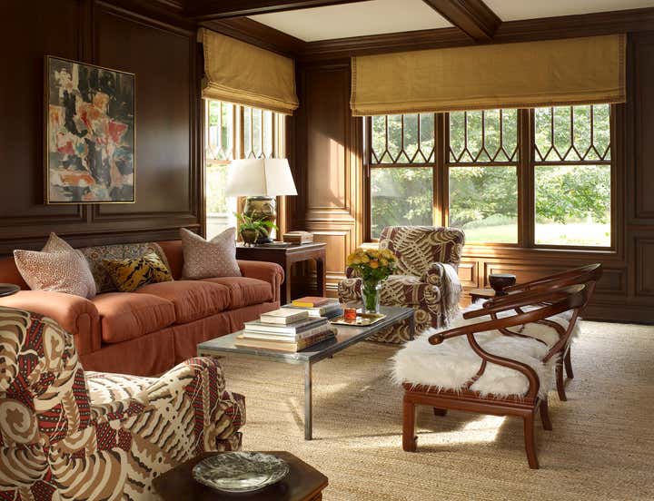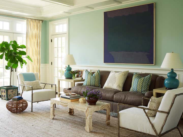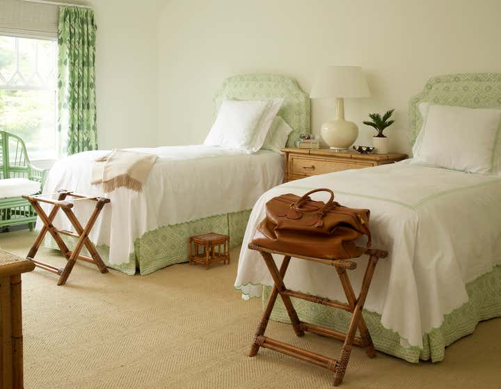 A version of this article appeared in the June 2017 issue of HC&G (Hamptons Cottages Gardens) with the headline: Radical Trad. By Haniya Rae “They wanted summery colors, but nothing too beachy,” Braff says. “So we aimed for a nice, in-between place that’s sophisticated and elegant, with character and personality.” Braff started by bringing in an eclectic mix of rugs and furnishings that “feels unpretentious and relaxed,” grounding a space that was awkward, shiny, and brand-spanking-new. “Whenever I do a house like this one, I always try to add layers to it so that it doesn’t feel cold,” she says. “Even if it has just been built, a home still needs to be welcoming and warm.” Indeed, the dining room’s bright, ochre-colored China Seas for Quadrille wallpaper and coral-hued Indochine dining chairs, further amplified by a set of dazzling blue porcelain, immediately grab the eye, although Braff keeps things in check with a jute rug, used here and elsewhere in the house, which she favors for its durability and natural look. In a high-traffic summer house, she says, “jute works so well, and it’s so easy to replace.” While still maintaining her vibrant color scheme, Braff dialed it back a bit in the private quarters, where she installed mint-green headboards in a guest room and a Tiffany blue paint from Benjamin Moore and a blue-and-cream linen from Lisa Fine Textiles in the master bedroom. The bedrooms are undeniably restful retreats, but more often than not, Braff’s clients and their guests find themselves congregating in the family room off the kitchen, which features a cheery mix of raffia on the walls, linen Lee Jofa curtains, and Christopher Spitzmiller lamps. “Daylight flows through this room nicely, making it a relaxing space to hang out in if you want to,” says the decorator. “But that’s what’s so great about the house. Everyone has his or her own corner, which makes it a place everyone wants to be in!”
