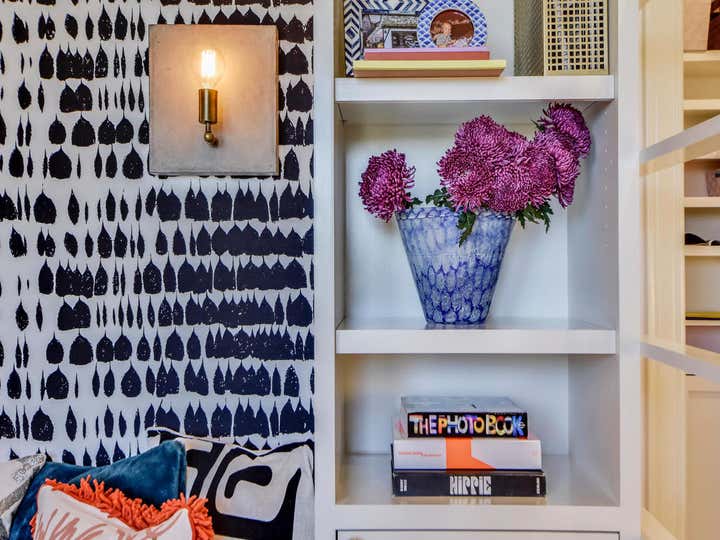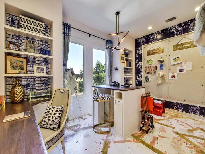 This space, solely dedicated to the creativity of the artist it was designed for, purposefully encourages interaction, ponderance and the limitless possibility of boundaries put asunder by our bold shapes and colors. With multiple custom-designed built-ins, the opportunities are endless. Art rooms are meant to get dirty. They are meant to get used. They of course also serve to supply creativity in how they are experienced and lived in; and this was top of mind as we built this space. Our hand-painted floors exist to encourage even more paint spills. The more this artist can feel free in her space, the more she will develop in her own creativity. Haphazardly dropping paint as she goes, only adds to these painted floors, ensuring the floor, and her craft, will age well. And since perspective is everything to an artist, we custom built a multitude of opportunities for this young lady to find places to think and ponder. A custom designed desk, work table and daybed, with loft overhead, mean that this room provides her many imaginative distinct points of view for lots of bold artistic creation.