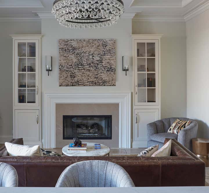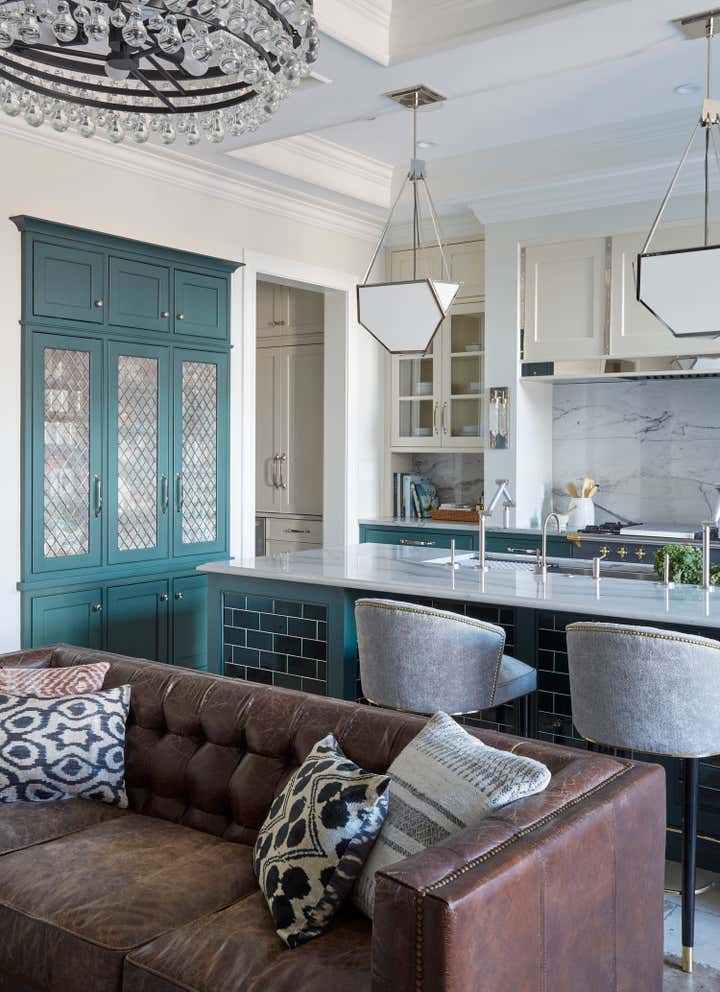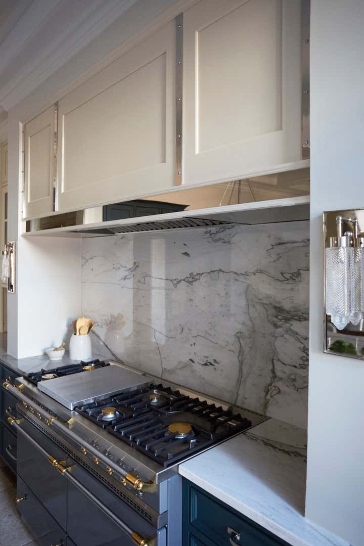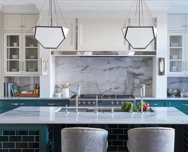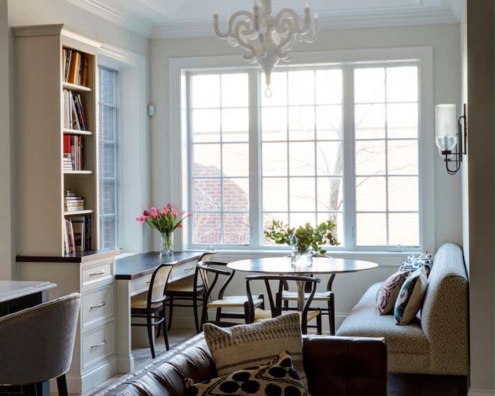 As with so many KLI projects, this included a kitchen and its adjacent spaces - breakfast room, family room and butler’s pantry…oh, and of a rug and coffee table for the living room, and a new dining room table, chairs and ceiling fixture, new stair runners, and few other projects. As we all know, renovation can be a bit of a domino effect. The original kitchen was a bad 1990’s job – with a huge peninsula that blocked the flow the dining room and bar/butler’s pantry. Since the kitchen and family room were basically one space, we wanted it to feel less fitted and more like a living room. KLI moved the fridge to the butler’s pantry, added a pull out freezer drawer and pantry – allowing us to make the kitchen all about beauty with a hearth-like hood surrounding a stunning French Lacanche range. This client cooks a ton, so they really wanted a space that worked, and would be durable enough for their very large, slobbery Bullmastiff. All new limestone floors and a tile-backed island allows for hard surfaces that area easy to wipe down. New furnishings, rugs, and built-ins pull it all together. The breakfast room was too big for just a table, so we shifted it off to the right with an upholstered banquette, and added a desk for homework and home office needs. The design was meant to be both kid and dog friendly but still really gorgeous. Our interior designers used Narragansett green cabinetry with polished nickel hardware. Durable surfaces were used including quartzite on the counters and backsplash along with Waterworks District subway tile on the island. Special highlights included: decorative grills made in England, Michelle James sconces, and Remains A huge 60” galley sink was designed for prep using Kohler’s Carbon faucets. Custom cabinetry, finishes, fixtures and furnishings provided by KLI.