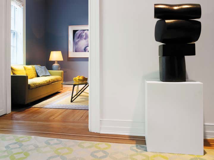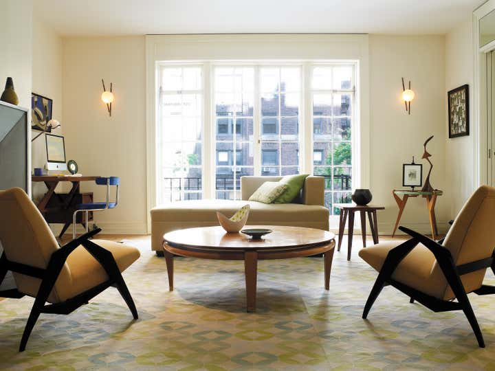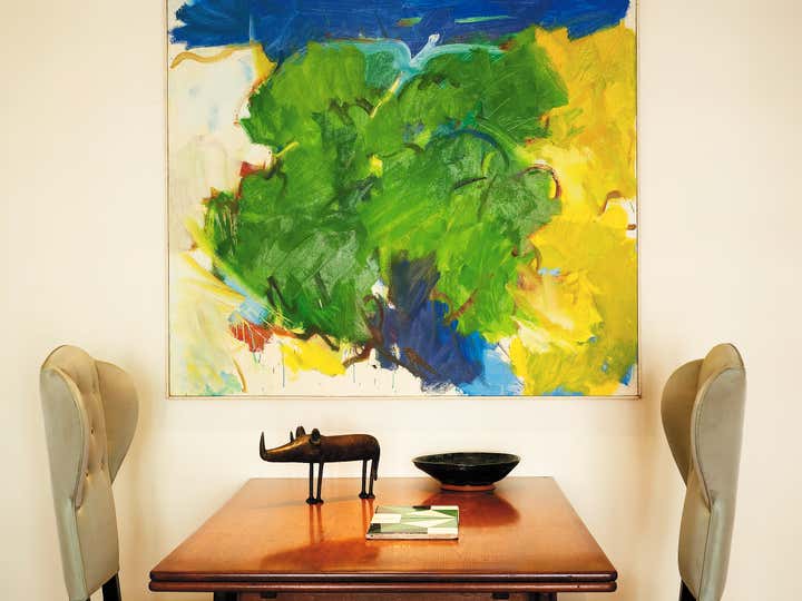 The furnishings are a mixture of 20th century design Gio Ponti, Pier-Luigi Giordani, Hans Wegner, Mart Stam and Edward Wormley. Rare Stillnovo sconces add a sculptural element to the walls. Art is by Sam Samore, Keith Edmeir, Federico Vegas, Eugene Pizzuto, Emilio Sanchez and Will Horwitt.