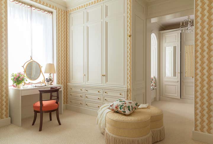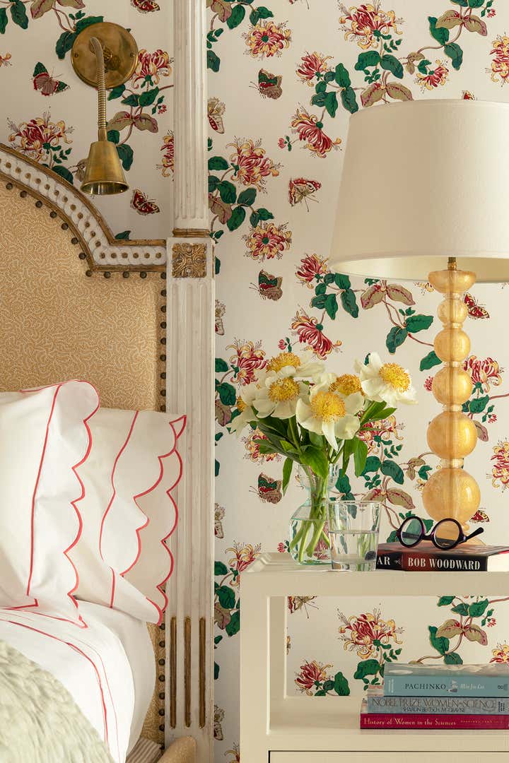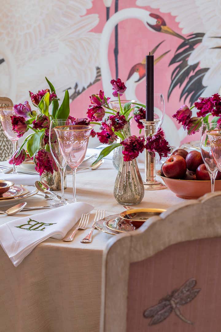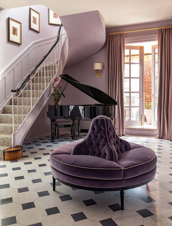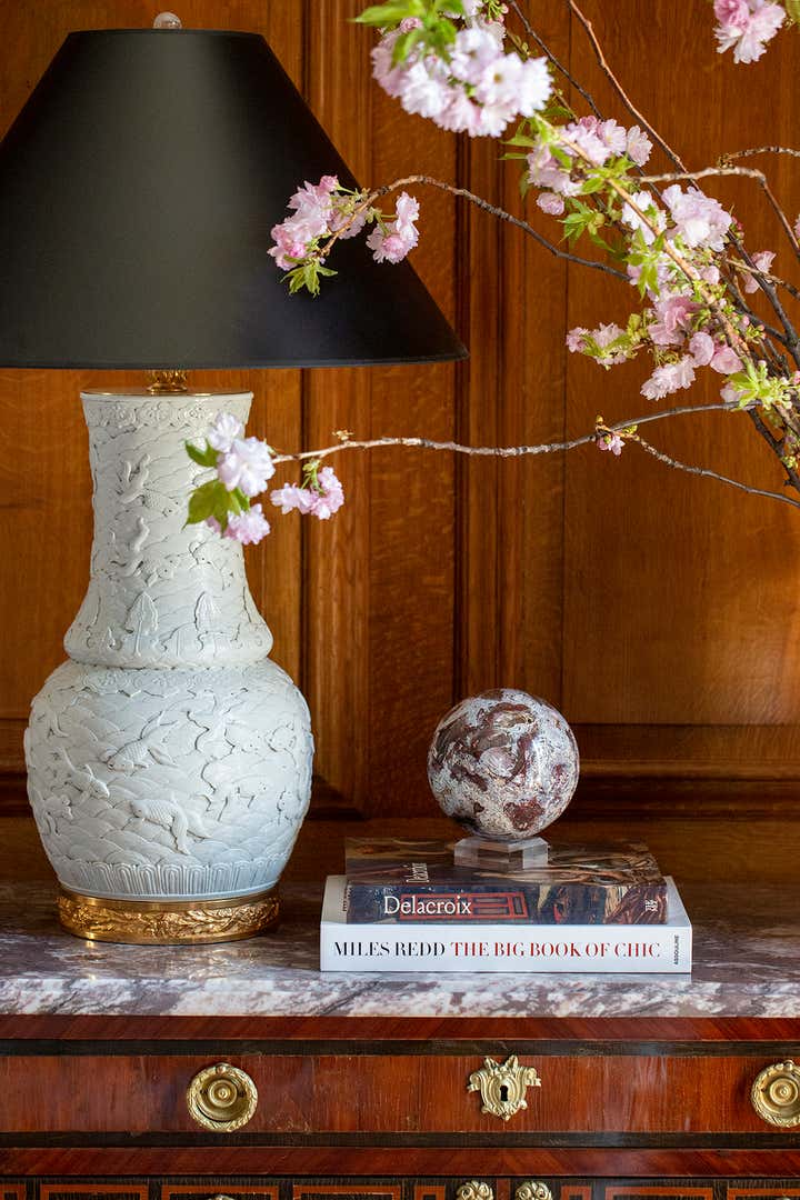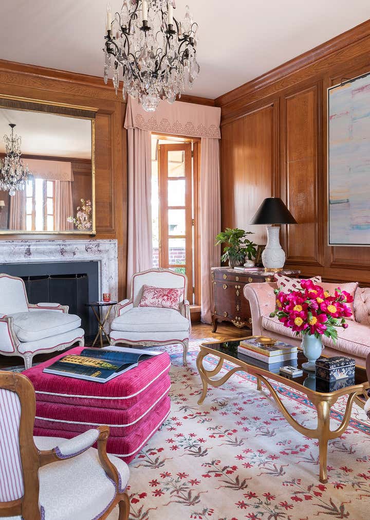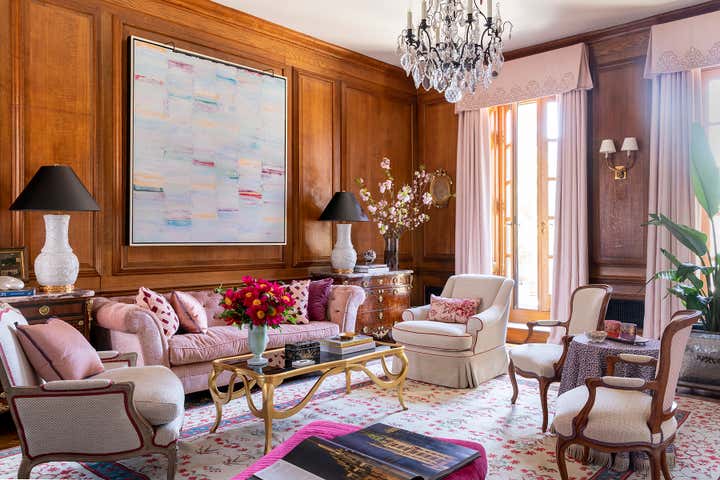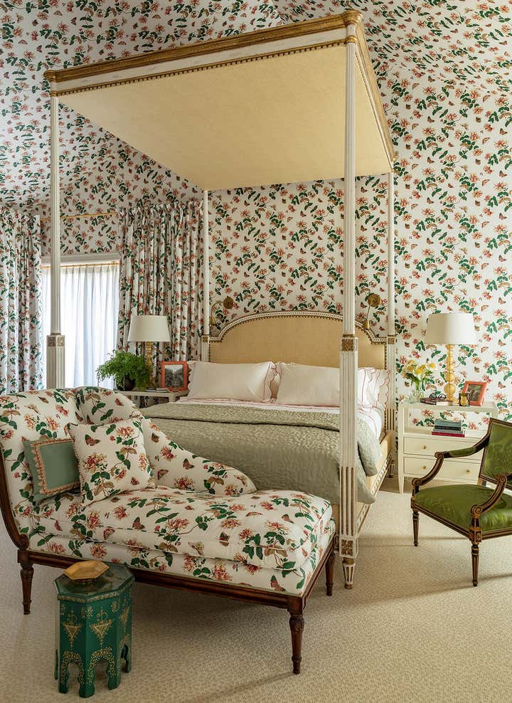 The decoration of a stylish and glamorous penthouse apartment in New York City’s Sutton Place neighborhood for a client who specifically requested rooms that were light and feminine. The dining room features a dramatically scaled wallpaper, whose pink tones are carried over to the living room, where they provide a soft contrast to the rich oak paneling. The walls and ceiling of the equally dramatic master bedroom are covered in a cotton chintz fabric that provides a leafy backdrop for a lofty canopy bed.