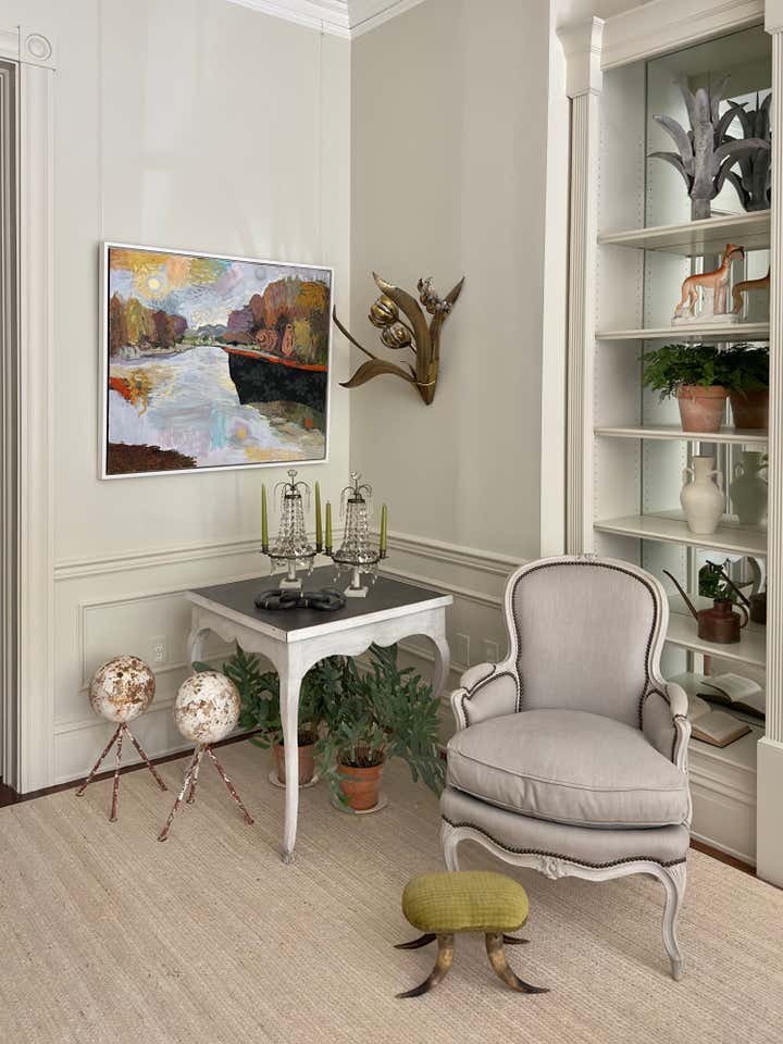 Inspired by a series of landscapes by Danish master painter Lars Ly, this room took shape with an eye to the art first. Furnishings and objects were selected to evoke and connect with the experience of nature and ritual of visiting your favorite spot in a park or urban garden landscape.