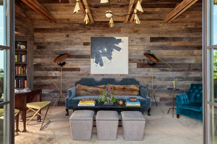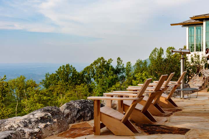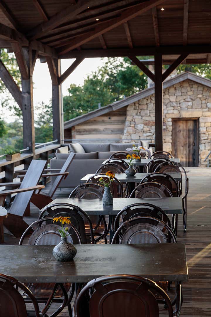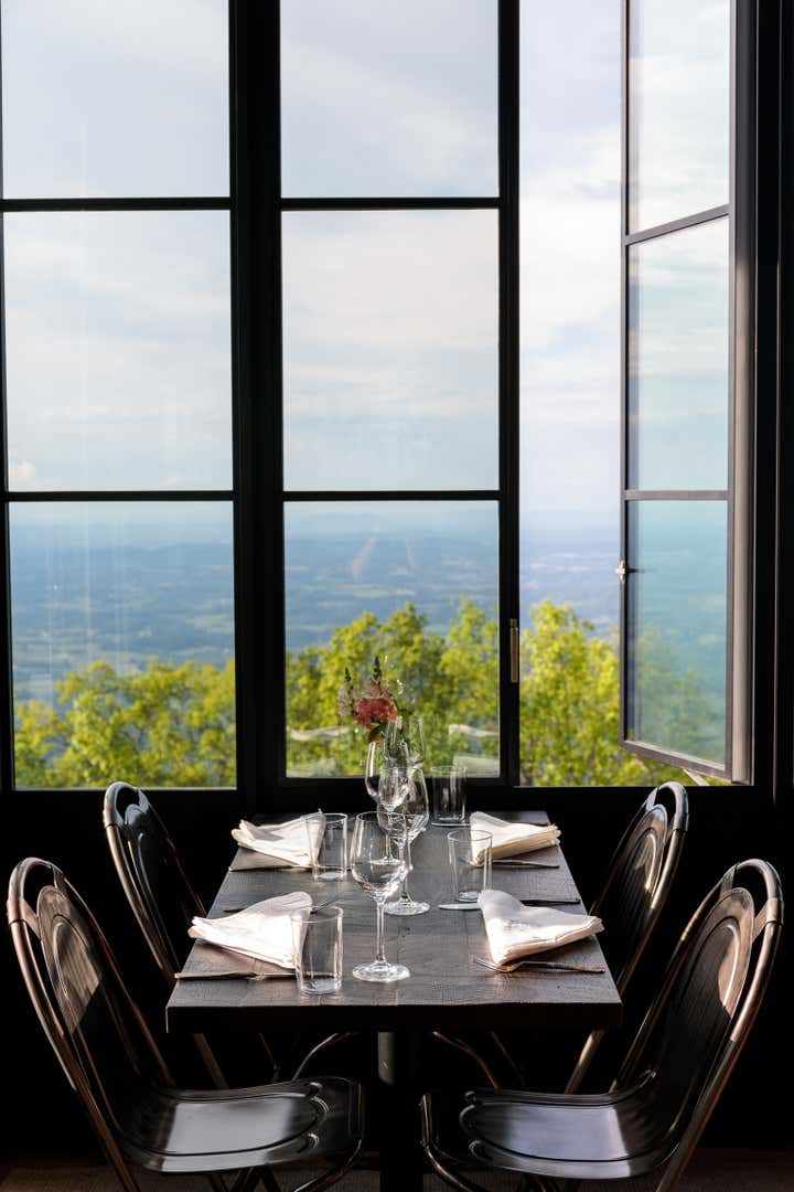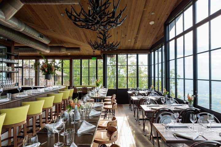 Built around a restored 1950’s lookout tower on top of a mountain, this restaurant’s minimal and view-focused design allows the surrounding natural beauty to shine. Large iron doors and windows, and a color scheme that brings the outside in, keep the space seamlessly connected to the environment. Reclaimed barn wood, stone from the mountain and a cypress ceiling were chosen to reflect the surrounding backdrop and the restaurant’s roots. The black interior and chartreuse accents make the room disappear so guests feel like they are tucked into the mountain, part of the land, even inside.