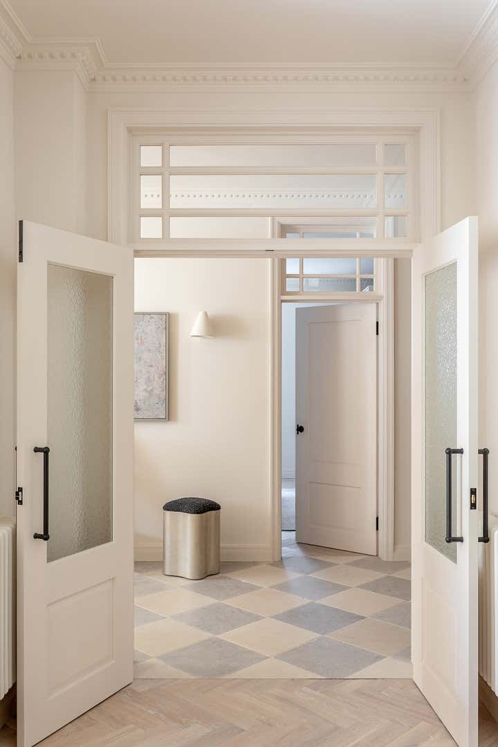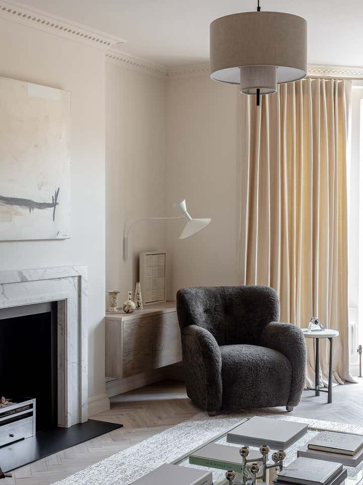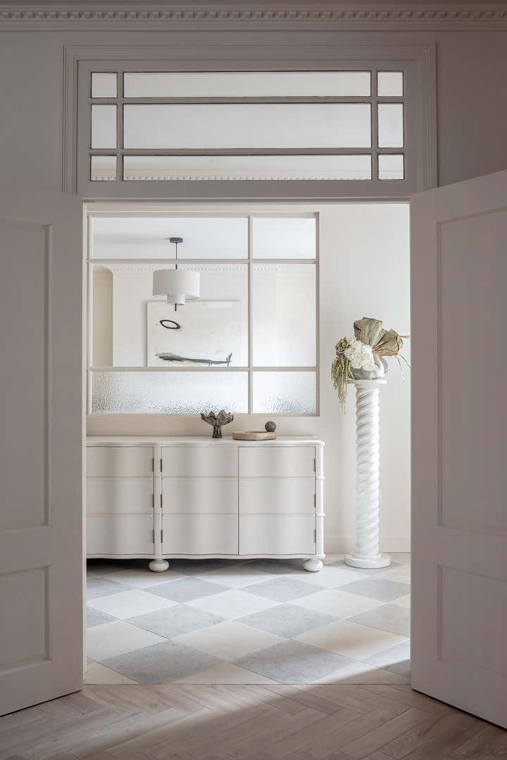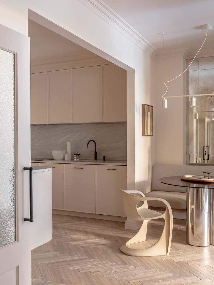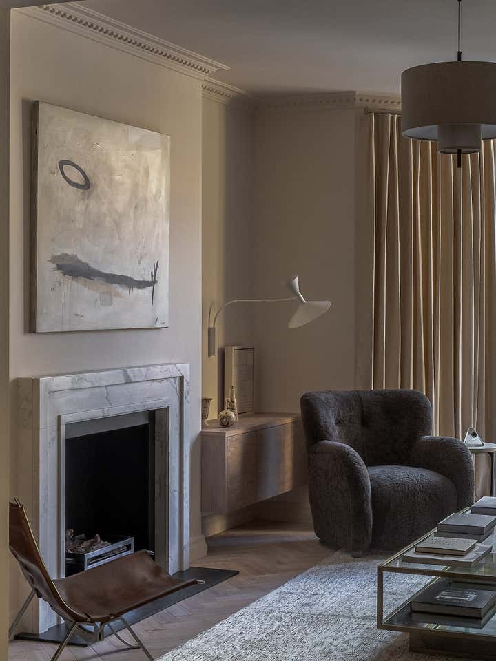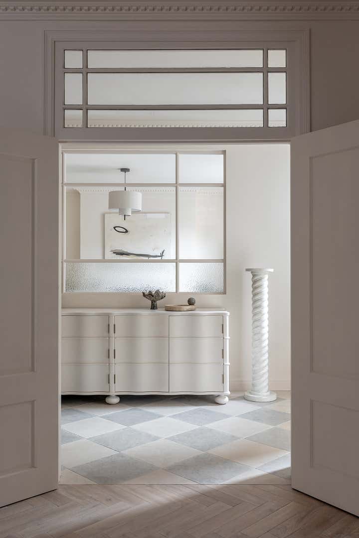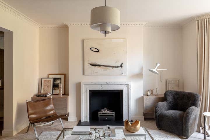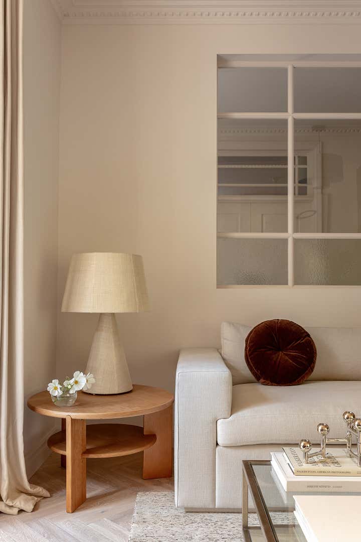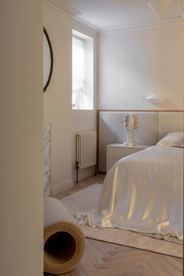 Unlike a typical Victorian London conversion, the unique plan of this lower ground floor flat inspired the European apartment-like layout. Taking influence from the elegant style of grand Parisian and Scandinavian apartments, a calm sanctuary with refined, feminine touches was created for the client who was moving from their long-standing family home and looking for a beautiful new space of their own. The delicate decorative detailing in the coving and bespoke joinery was inspired by the original plasterwork and fan lights over the doorways. As a studio it s always important to sensitively restore the original details and use these as a reference throughout the new design.