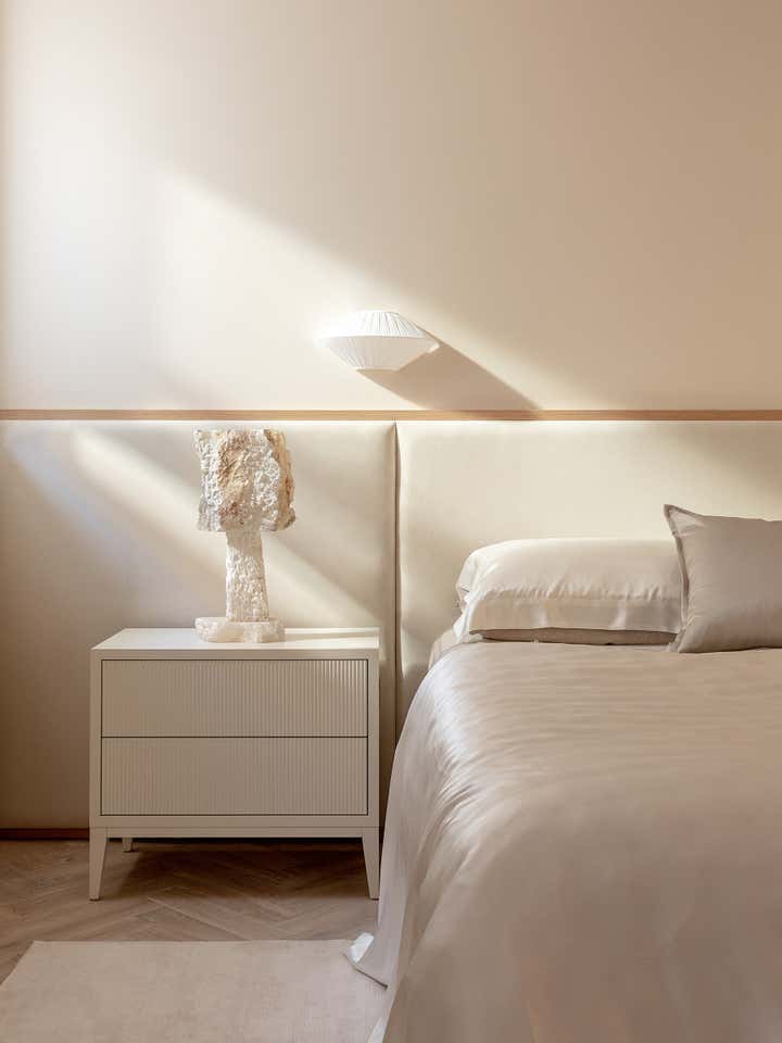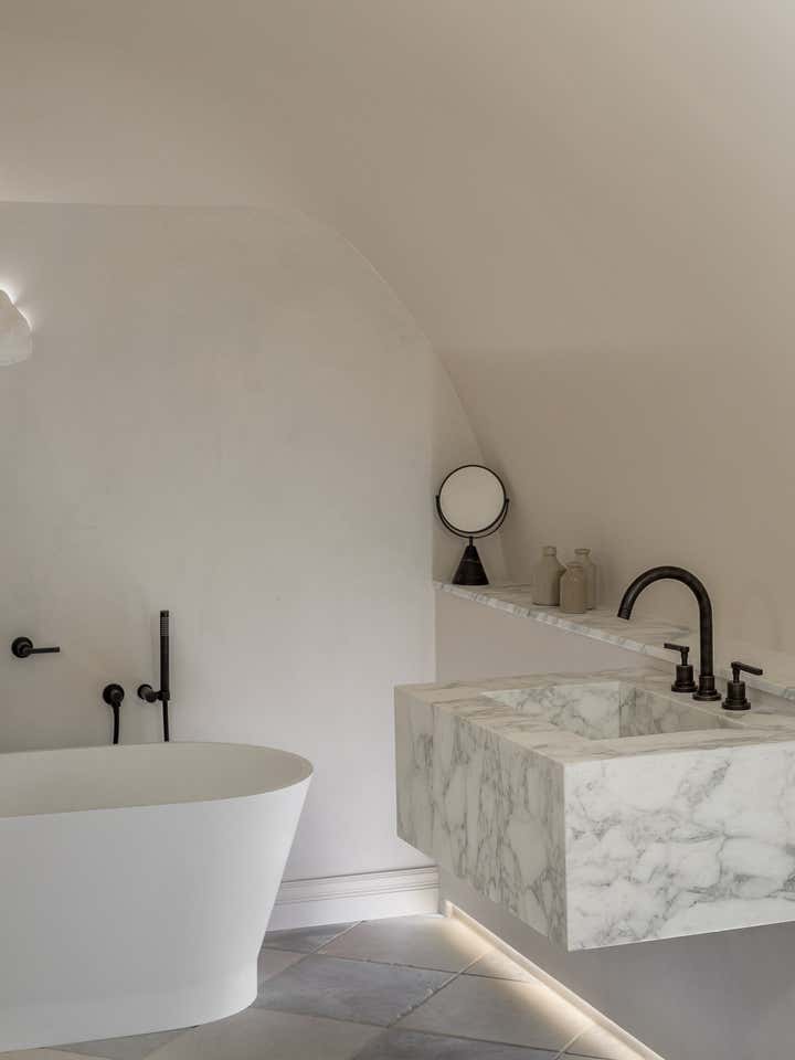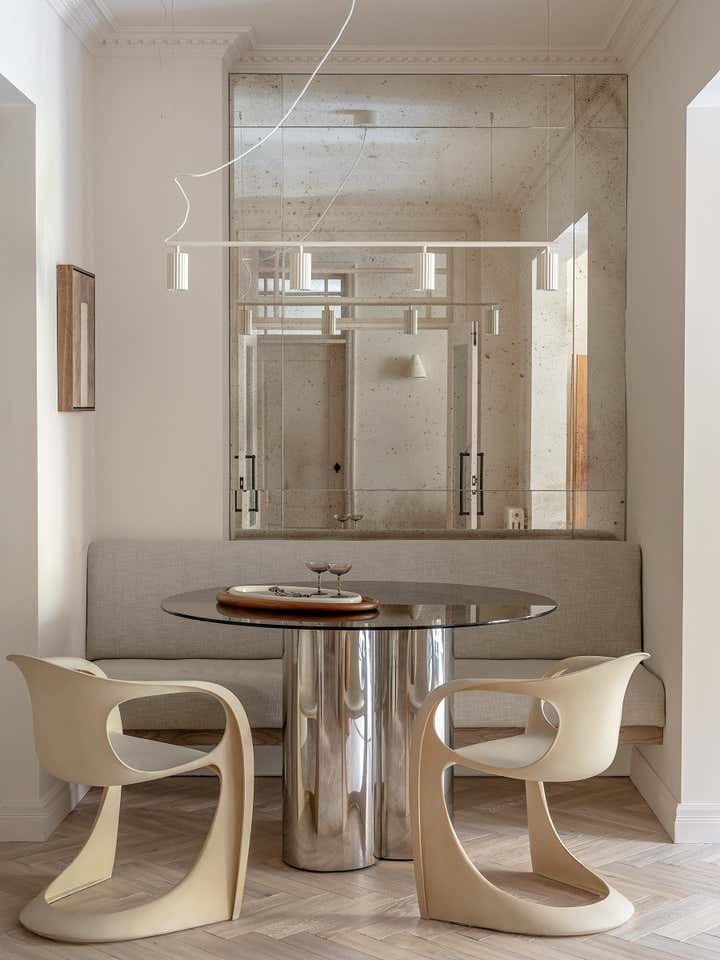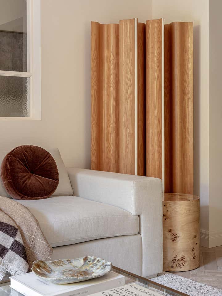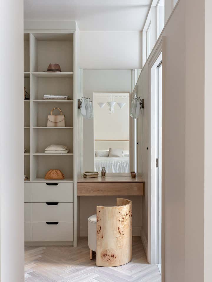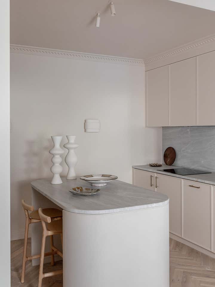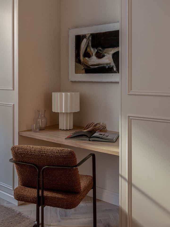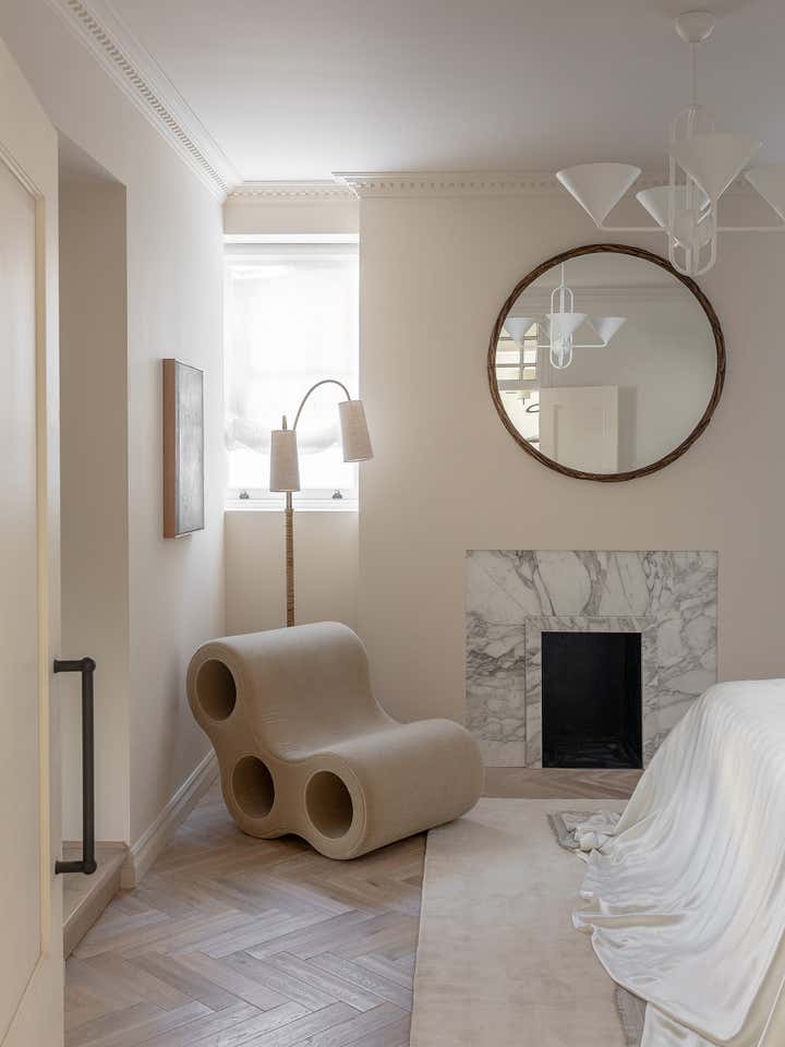 Unlike a typical Victorian London conversion, the unique plan of this lower ground floor flat inspired the European apartment-like layout. Taking influence from the elegant style of grand Parisian and Scandinavian apartments, a calm sanctuary with refined, feminine touches was created for the client who was moving from their long-standing family home and looking for a beautiful new space of their own. The delicate decorative detailing in the coving and bespoke joinery was inspired by the original plasterwork and fan lights over the doorways. As a studio it s always important to sensitively restore the original details and use these as a reference throughout the new design.