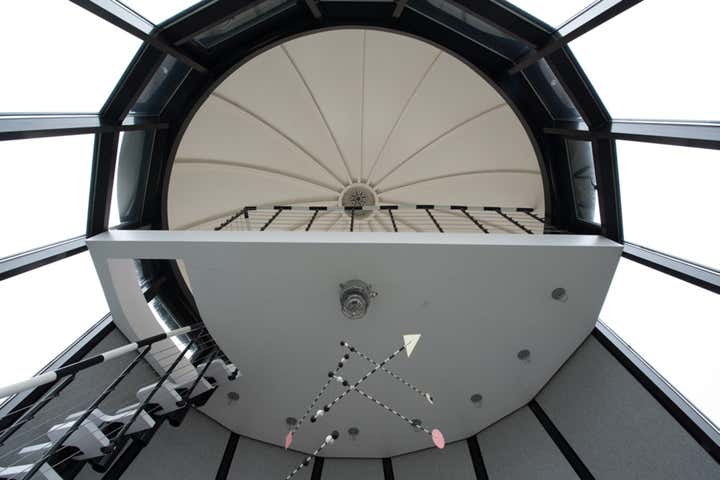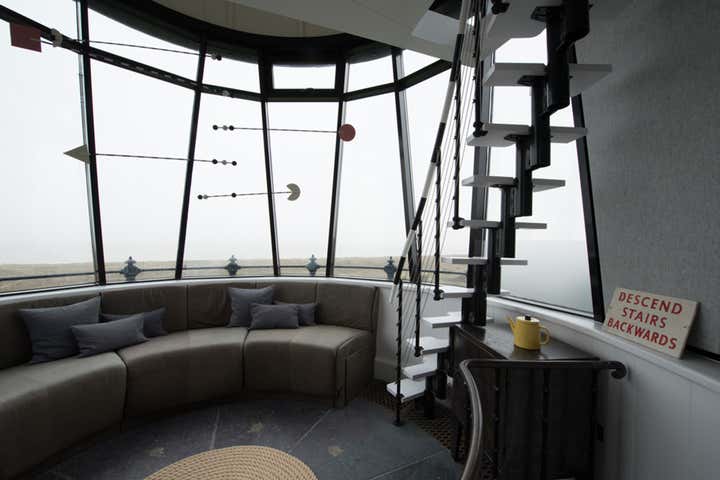 A new steel and glass lantern with a domed roof was also added at the top of the tower. Curved wrap-around seating and a sleeping platform offer dramatic 360-degree panoramic views of the Norfolk countryside, the sandy beach and the North Sea beyond.