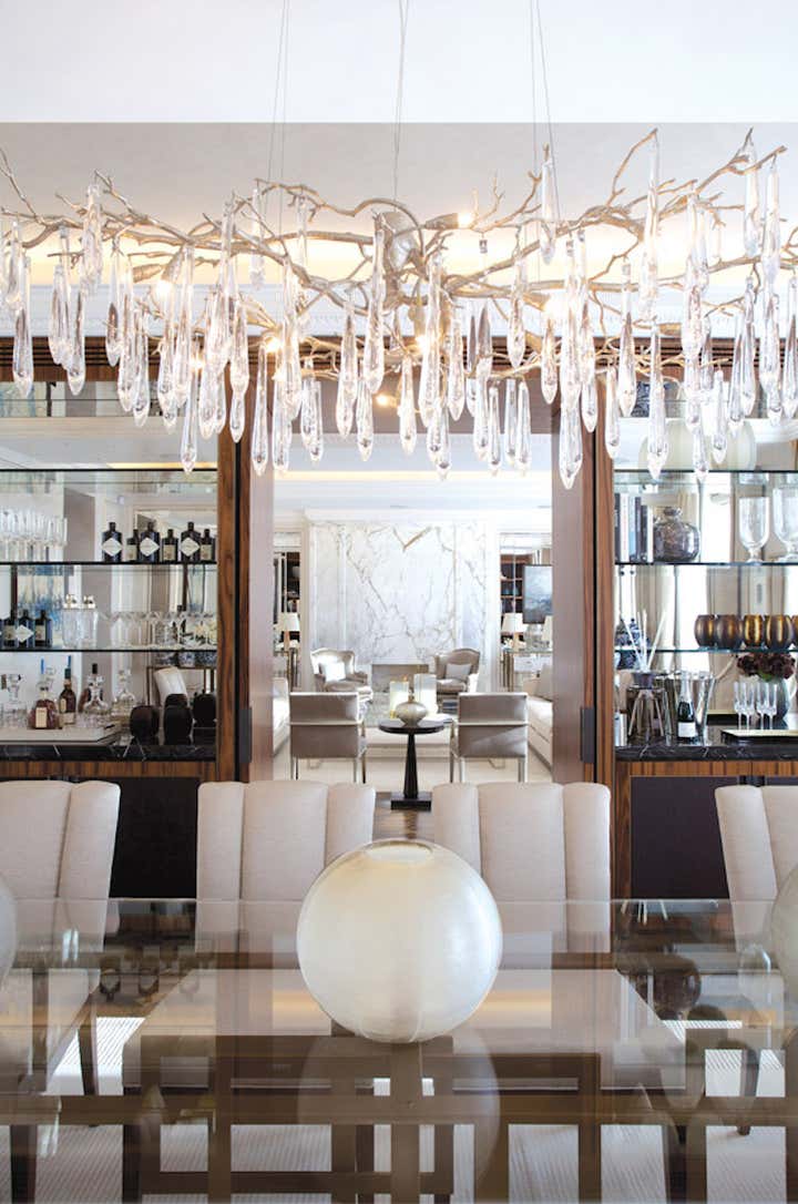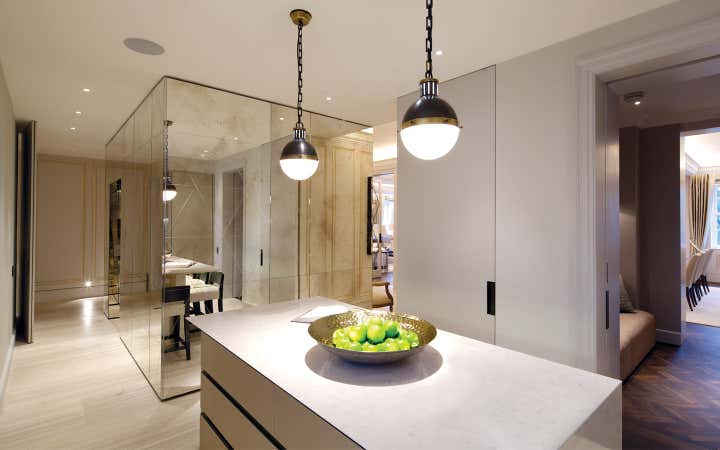 Light is captured and reflected by a solitary central piece, which we clad in antique mirror. The principal rooms peel away from this, taking on a classical tone by introducing hand painted and fielding panelling with gold leaf detailing.