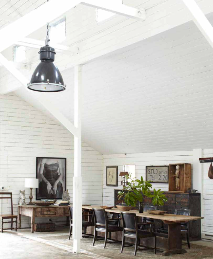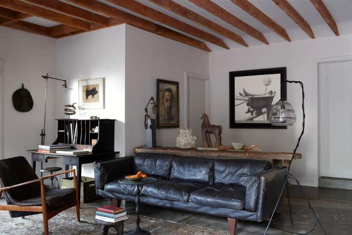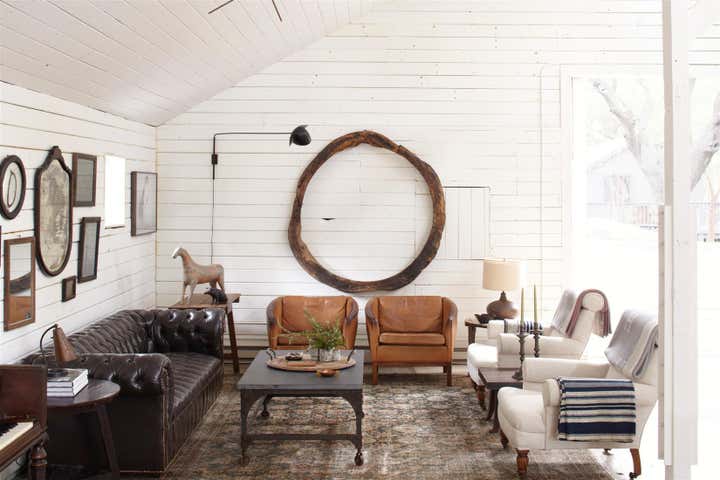 The Ranch, a twenty-six acre property just north of Los Angeles, features eight separate structures dating back to the 1920s surrounded by oak trees and trails. Each existing structure has been re-interpreted in function and design. A barn, the hub and heart of the property, presents a tranquil and stimulating space to dine, entertain, to paint or play the vintage American upright piano. Another cabin, built from the ground up to compliment the existing structures and landscape, by Jay Holman, is used as a master suite. Gijs Bakkers stacking chairs are arranged around a nineteenth-century oval table and sit atop a nineteenth-century Swedish rug in the open kitchen area. The Ranch is a retreat to simple living amongst beloved antique and design collections, surrounded by nature.