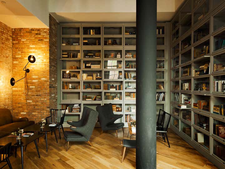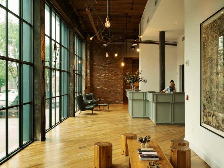 The public spaces for the Wythe Hotel in Williamsburg are tied to the history of an old industrial building, and infused with a spirit of casual luxury.