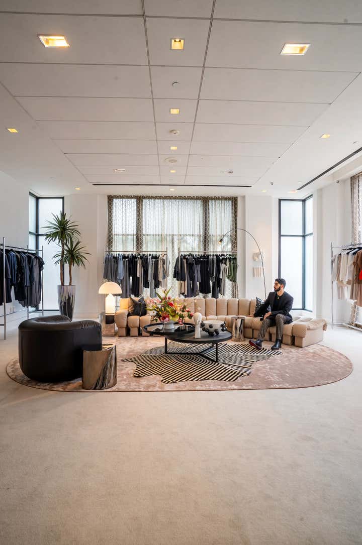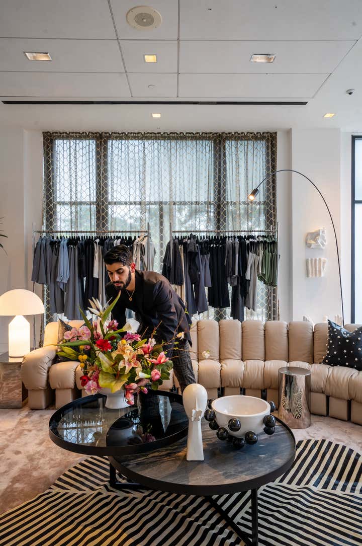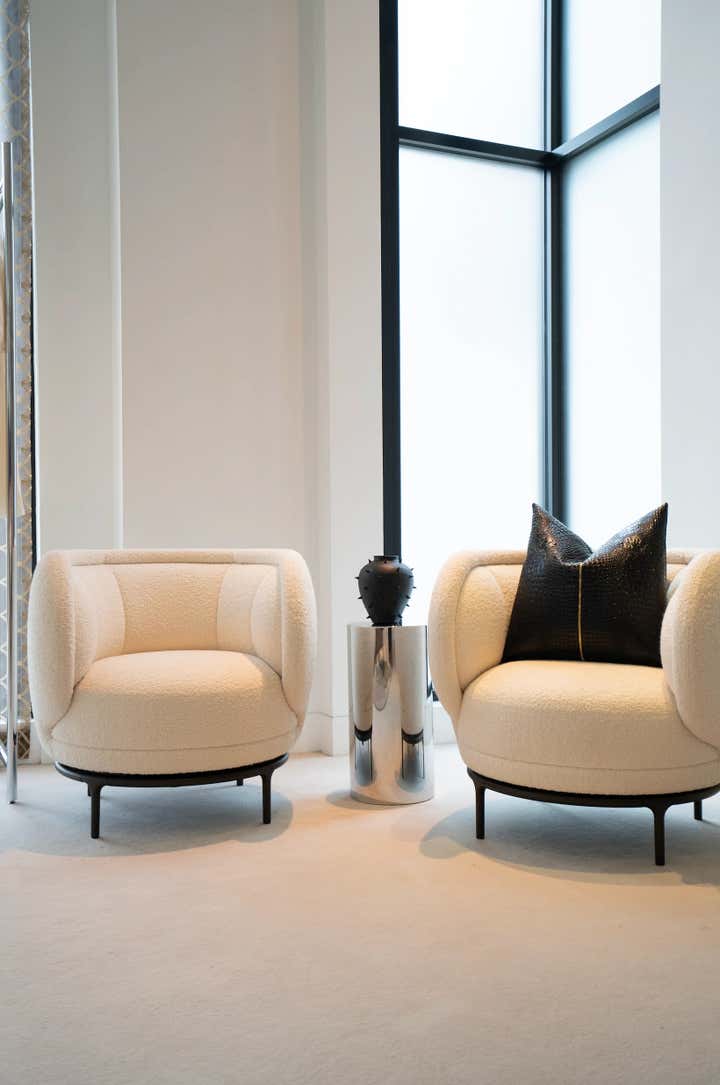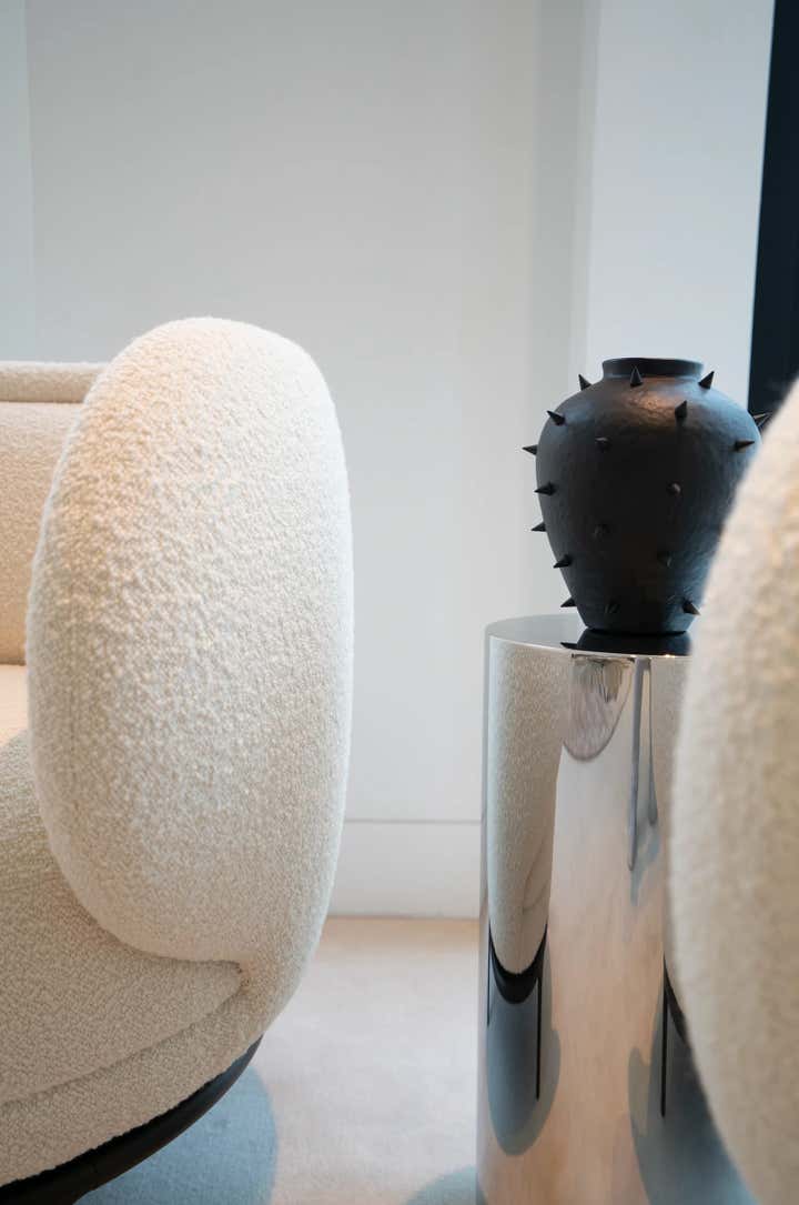 Rehman s creative lens transforms the Salon into a testament of transcendent design. Chrome accents entwined with white and black, evoke an immediate sense of high-end luxury. A hand-dyed cowhide layered upon a custom-cut pale pink silk rug works harmoniously, invoking a symphony of textures and hues. Three artisan-crafted pillows grace the modular sofa, a seamless blend of form and function. The iconic Pop Bowl by Kelly Wearstler acts to draw the eye in to the center of the room. tying together the timeless color palette.