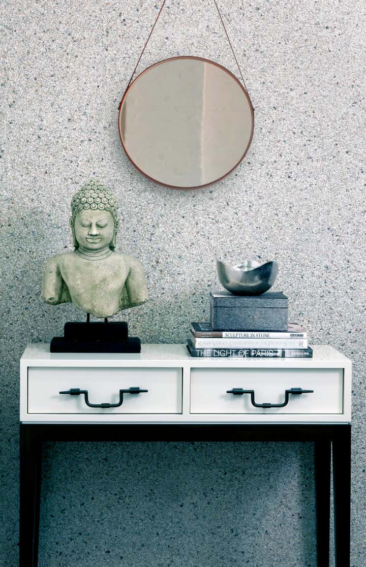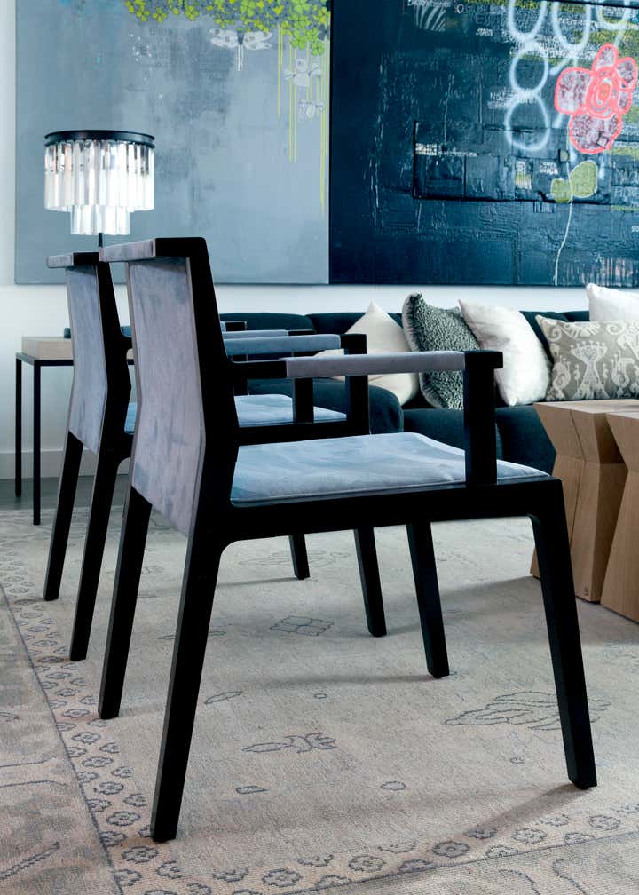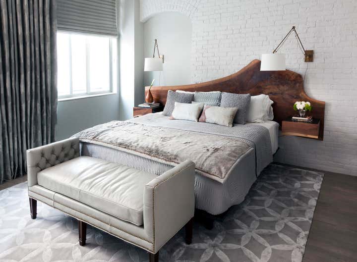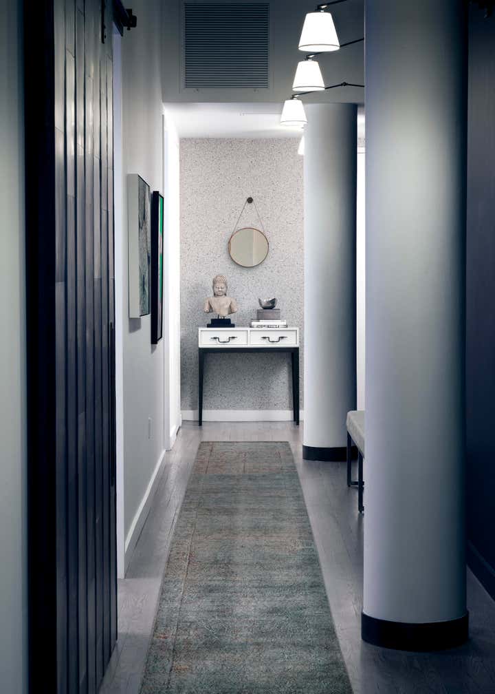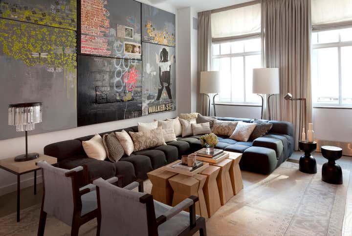 This cool downtown space is all about a modern play on line and texture. We used a granite stone wall covering in the entry as a backdrop for sculptural accessories and dark wood tones. In the living room, a modular sofa offers a cubic texture and deep comfortable seats for a casual setting. A grouping of eight angular side tables creates a distinctive centerpiece in the room, mirrored by the panels of graffiti artwork on the wall. Pairs of floor lamps, armchairs and stools balance the overall space. The master bedroom features a custom live edge headboard contrasting white brick walls. Paired with a soft leather bench and starflower silk rug, the finished composition is organic and refined.