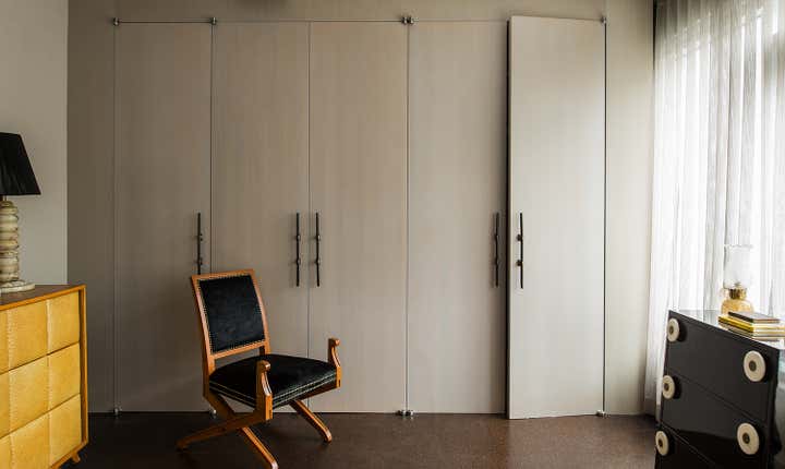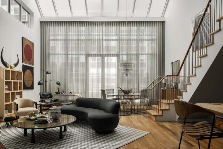 In keeping with a classic New York loft, we aimed to keep the open loft-like vibe in the front portion of the loft. The double height volume and open living, dining and kitchen areas open to a terrace facing the street. To juxtapose that experience in the back are the cozy bedrooms that open to covered terraces which feel more like a retreat.