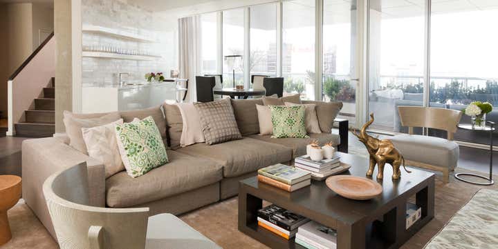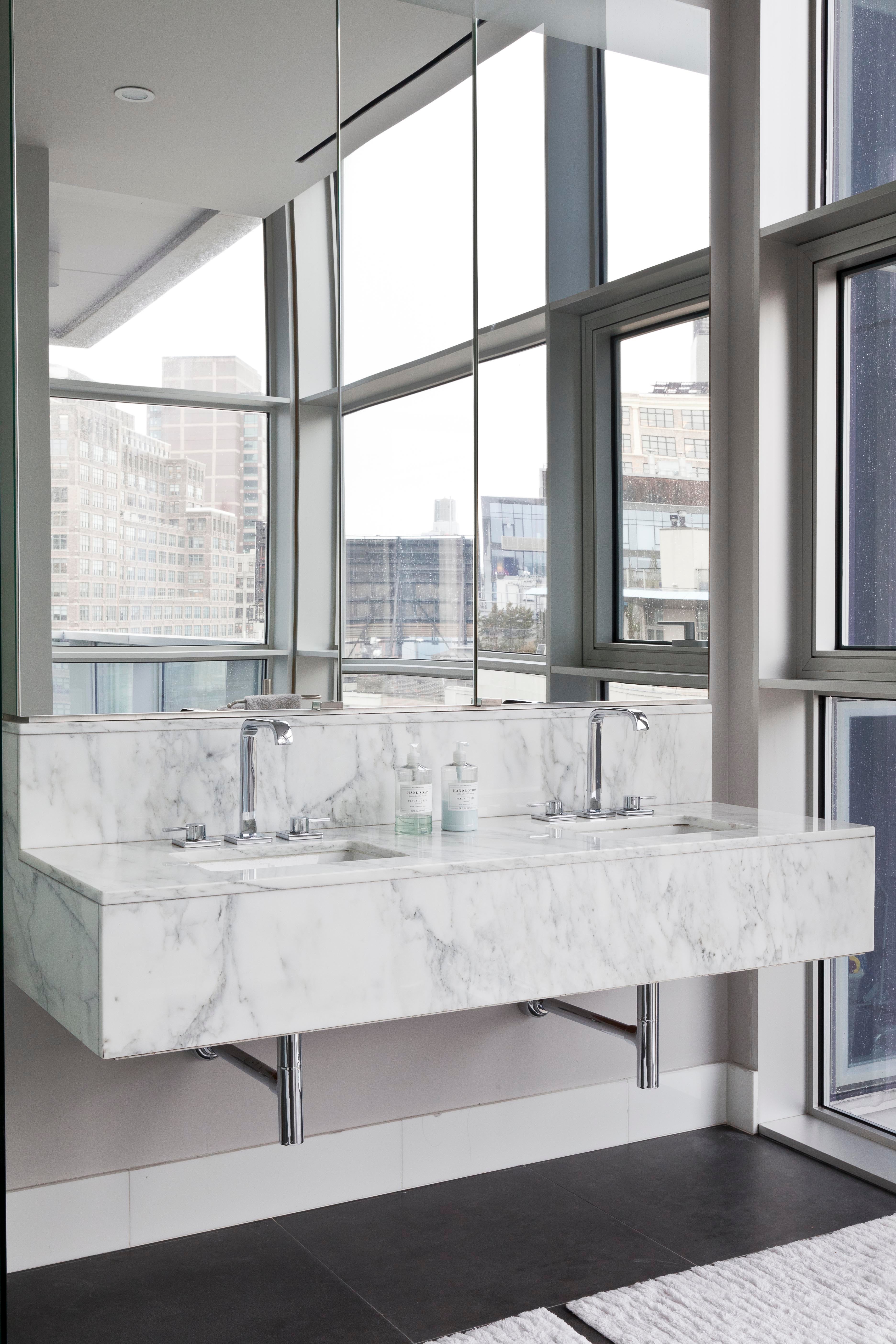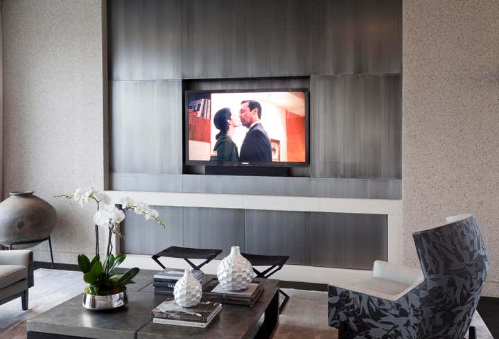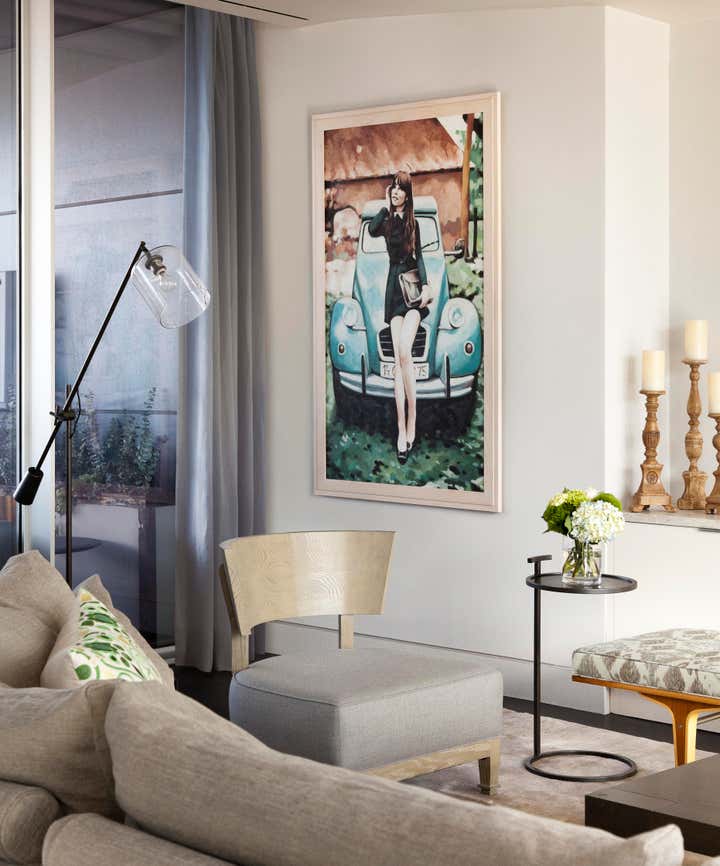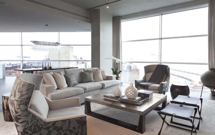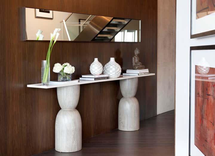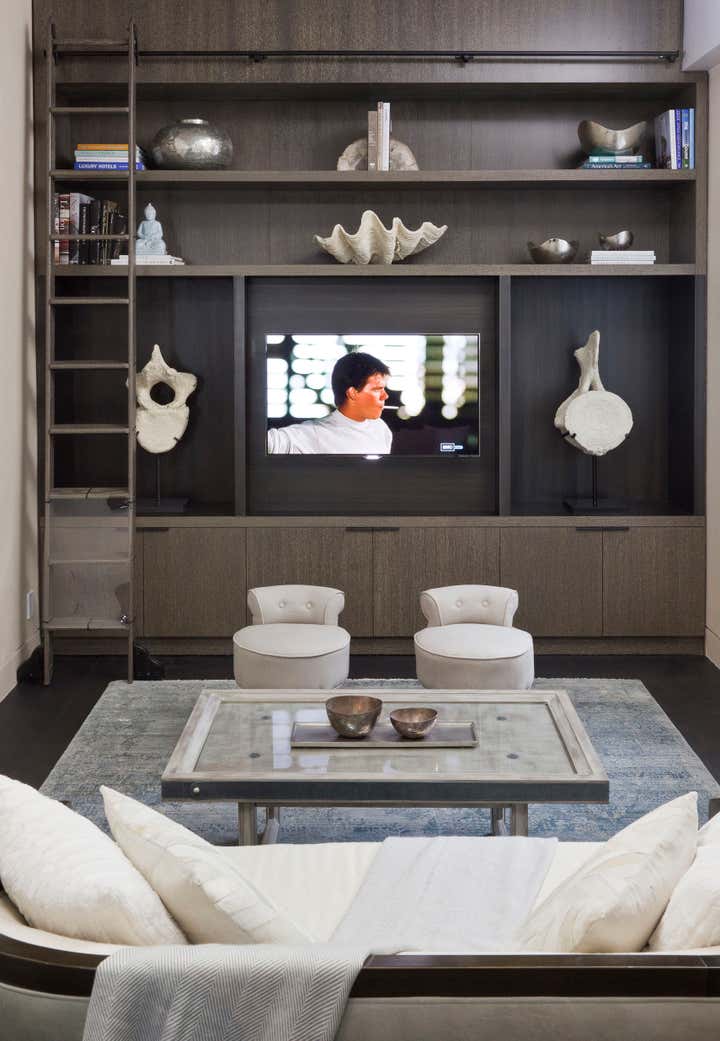 The overall airy and open design of this sprawling Tribeca Penthouse allowed us to tailor every aspect to the owners’ taste and needs. The color palette was kept soft, using cream, blue and gray tones to give a sense of tranquility and ease in this contemporary space. We added structure and functionality with built-ins, such as a library and media cabinet featuring high-end finishes.